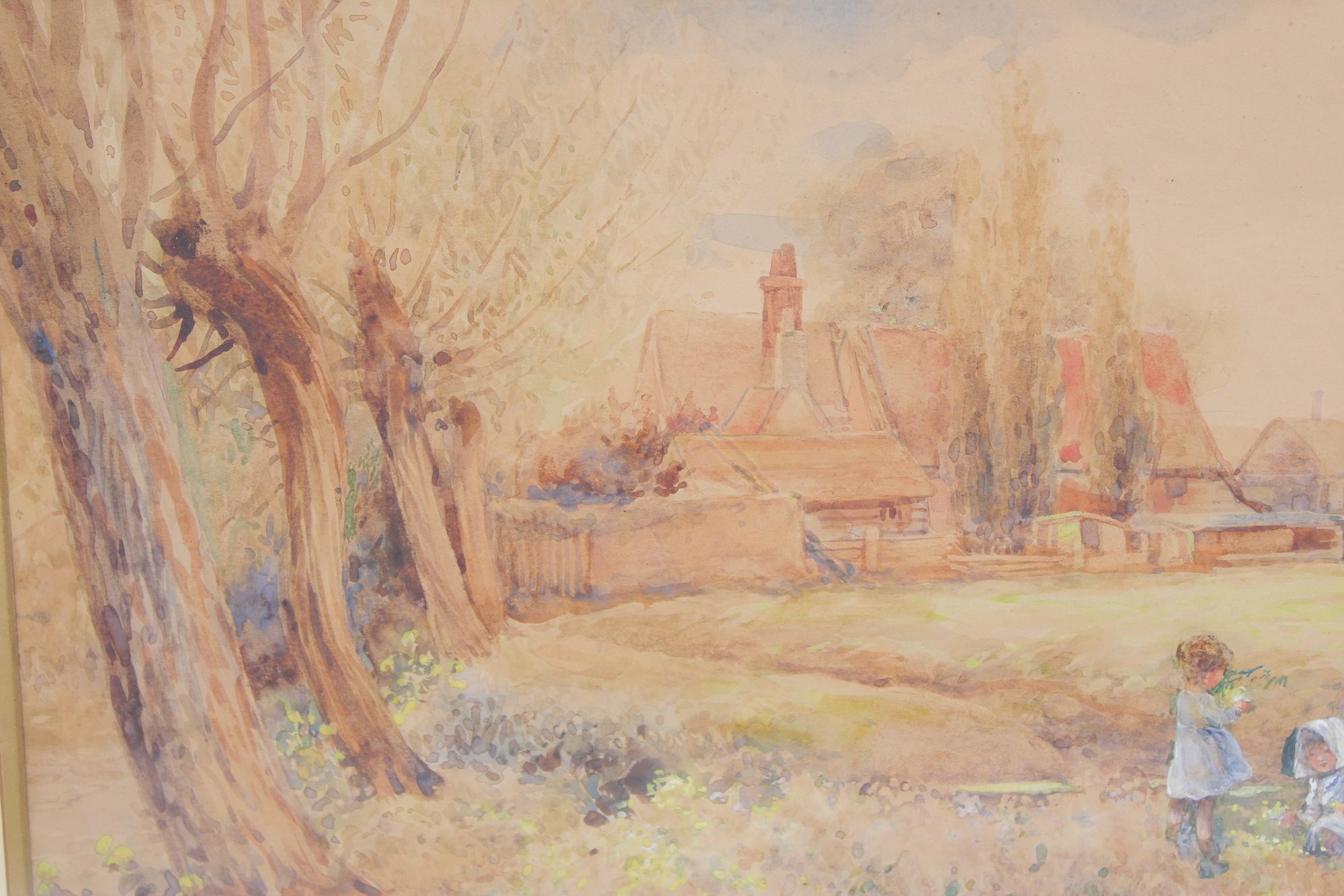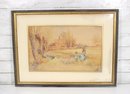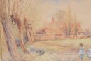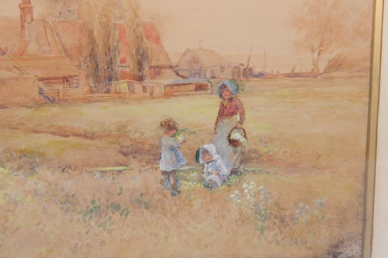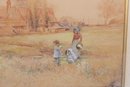 Charming signed pastoral landscape artwork depicting a peaceful countryside scene with a mother and children in an open field near a village. The composition features warm, soft tones and delicate detail, with trees, cottages, and a rural setting creating a nostalgic and serene atmosphere.