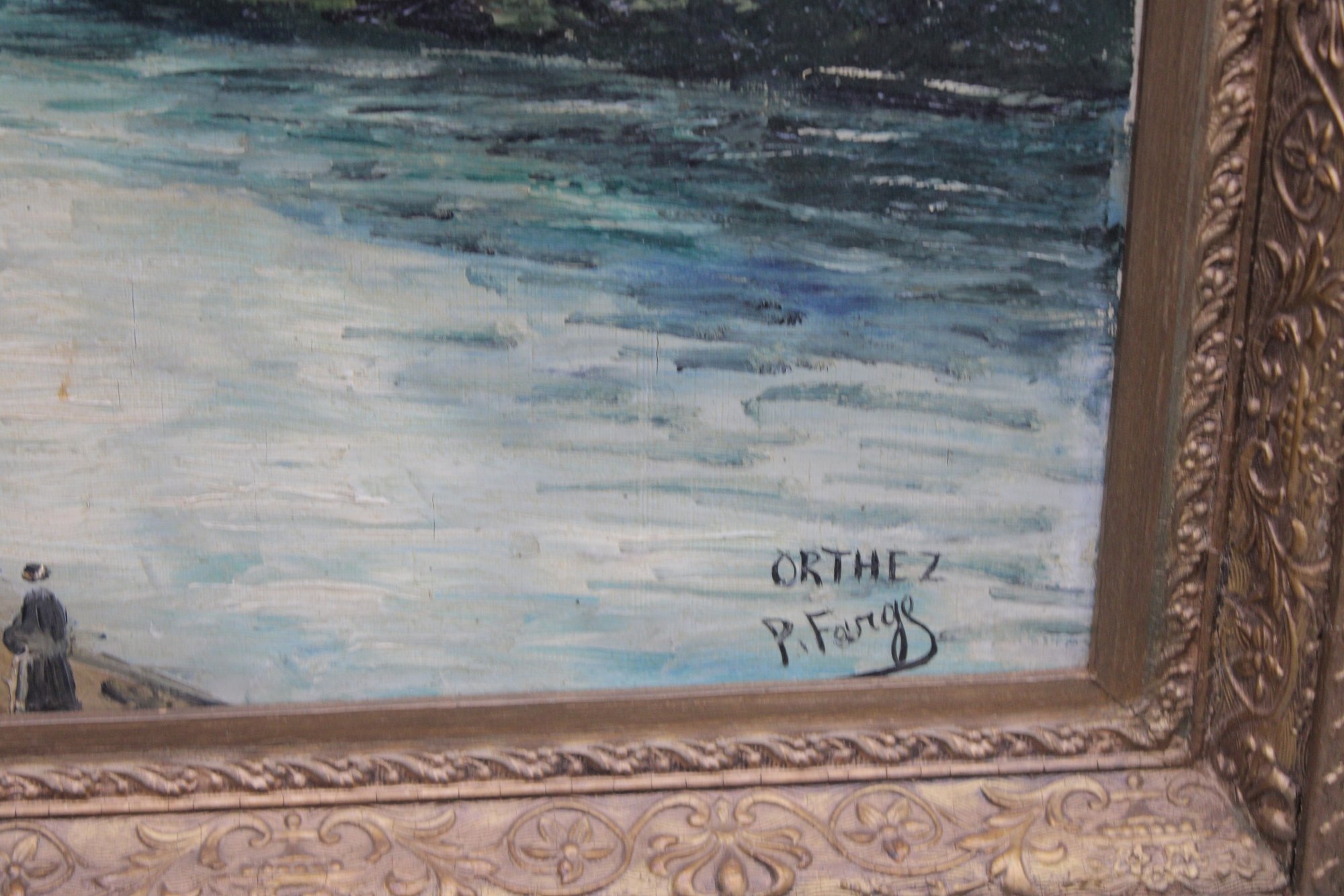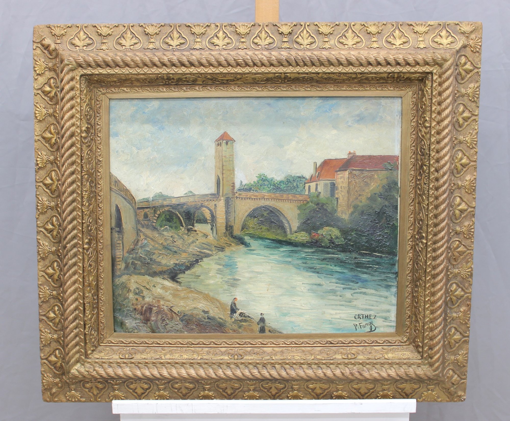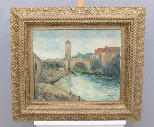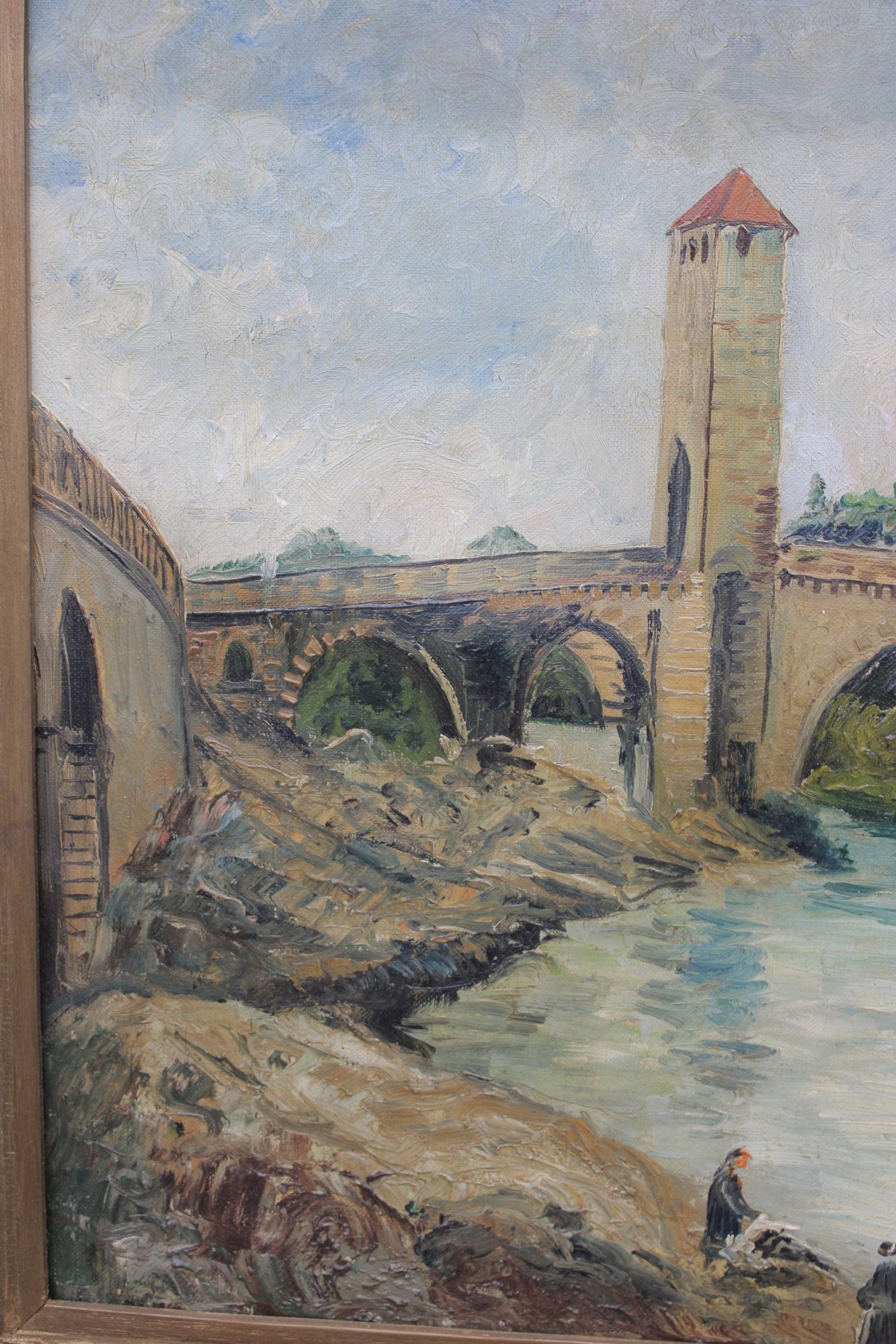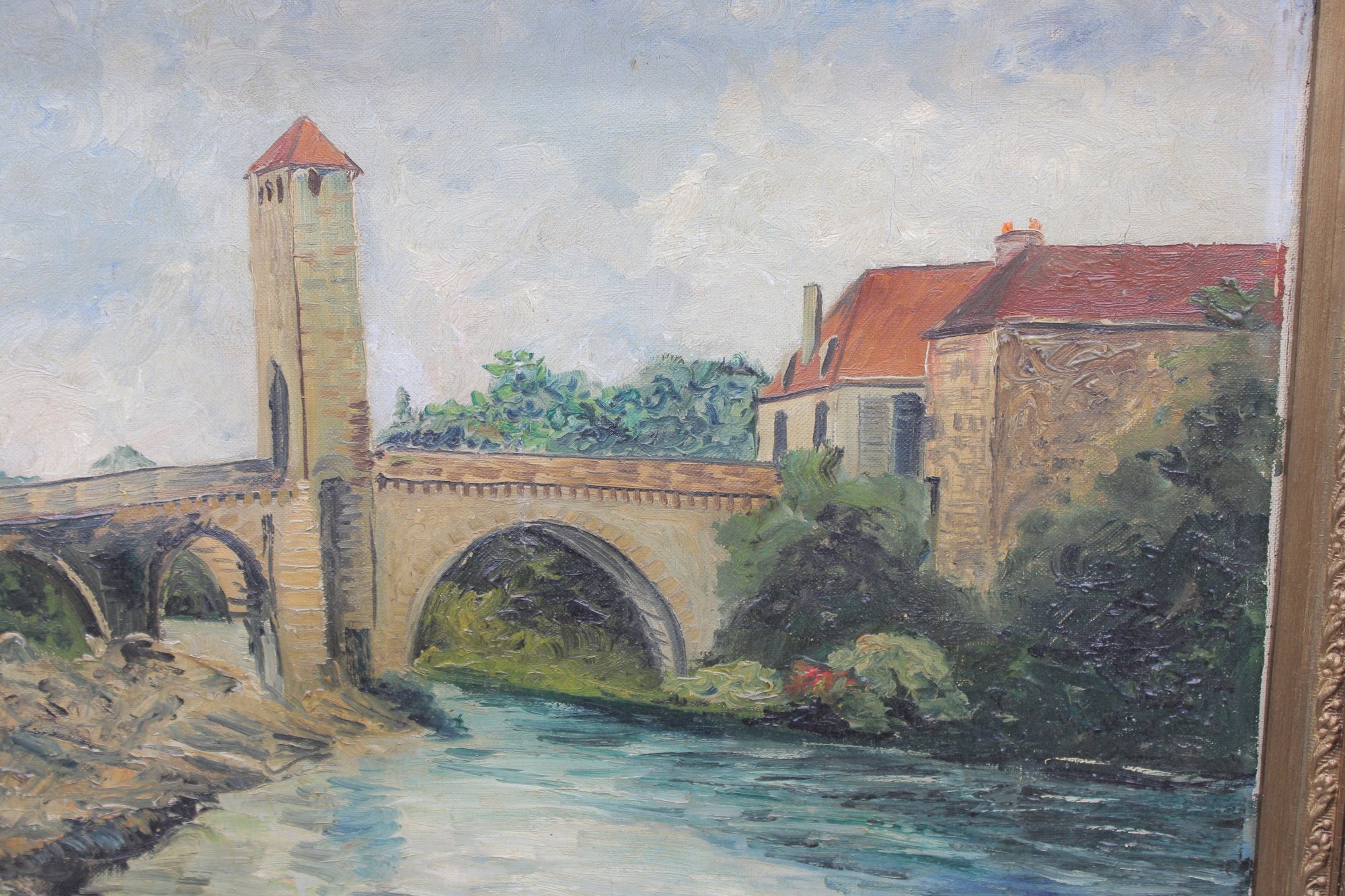 This signed oil on canvas painting depicts a picturesque view of Orthez, France, centered on the town’s historic bridge spanning a gently flowing river. The composition is animated by soft light, expressive brushwork, and carefully observed architectural details, with figures along the riverbank adding scale and narrative charm.