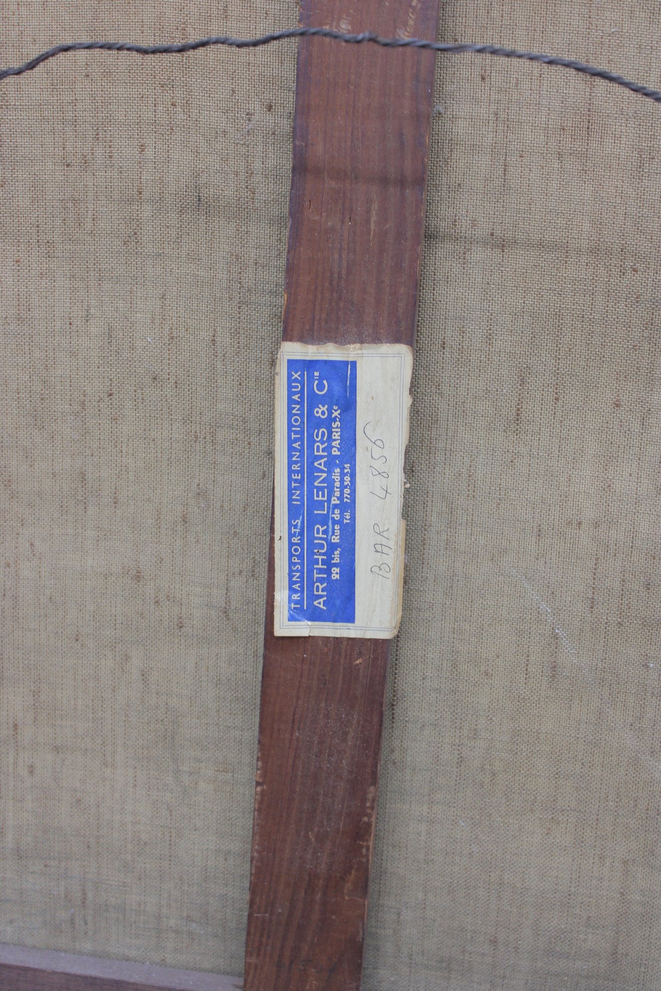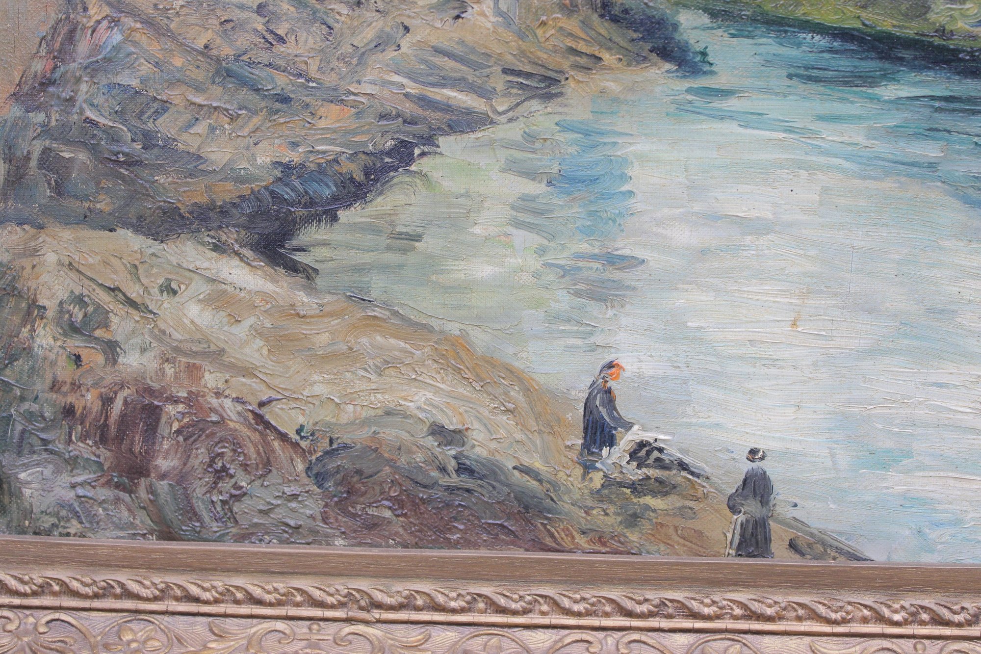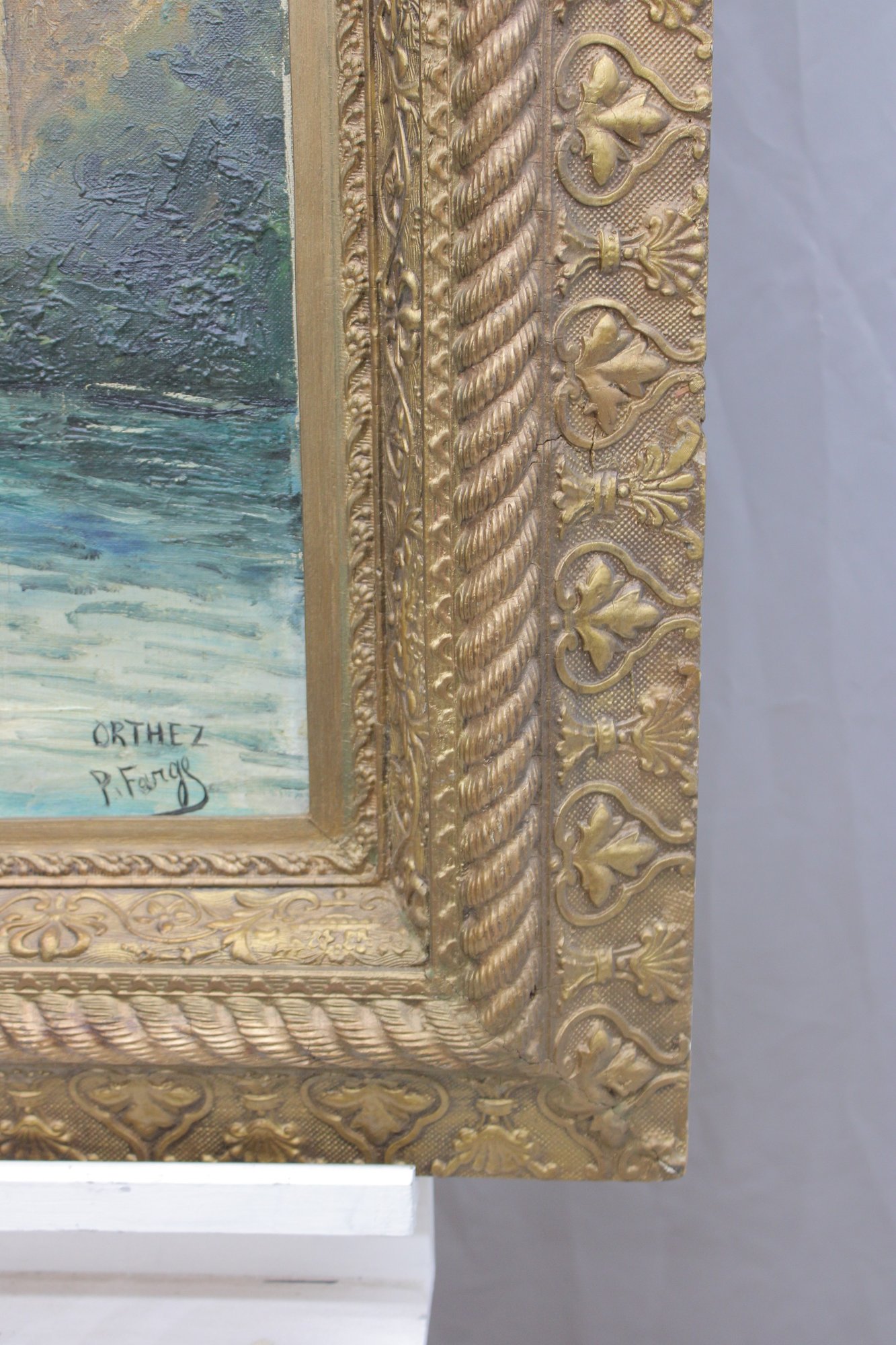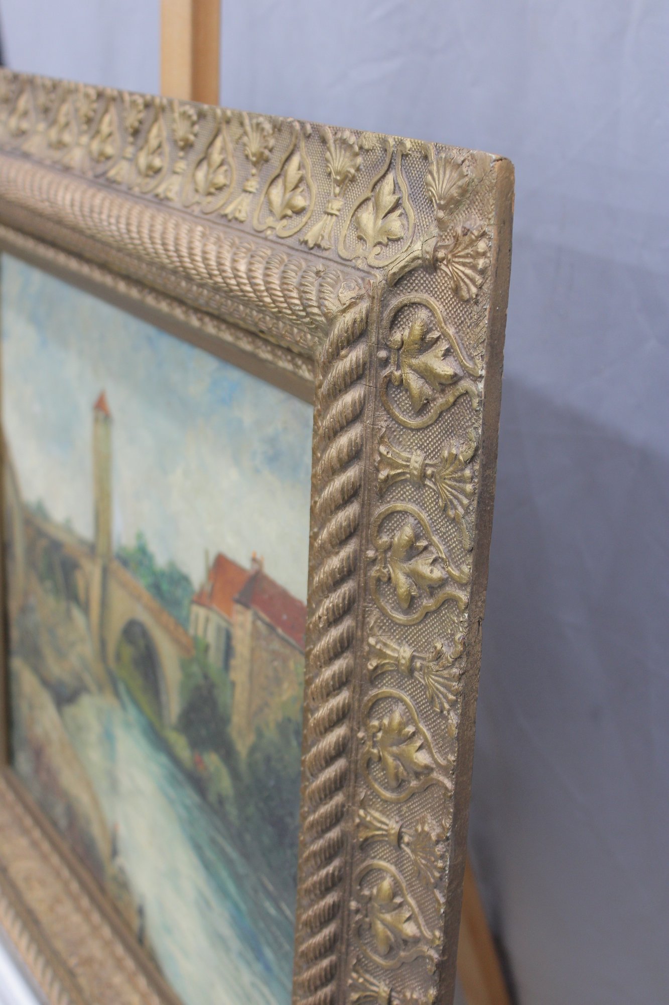 This signed oil on canvas painting depicts a picturesque view of Orthez, France, centered on the town’s historic bridge spanning a gently flowing river. The composition is animated by soft light, expressive brushwork, and carefully observed architectural details, with figures along the riverbank adding scale and narrative charm.