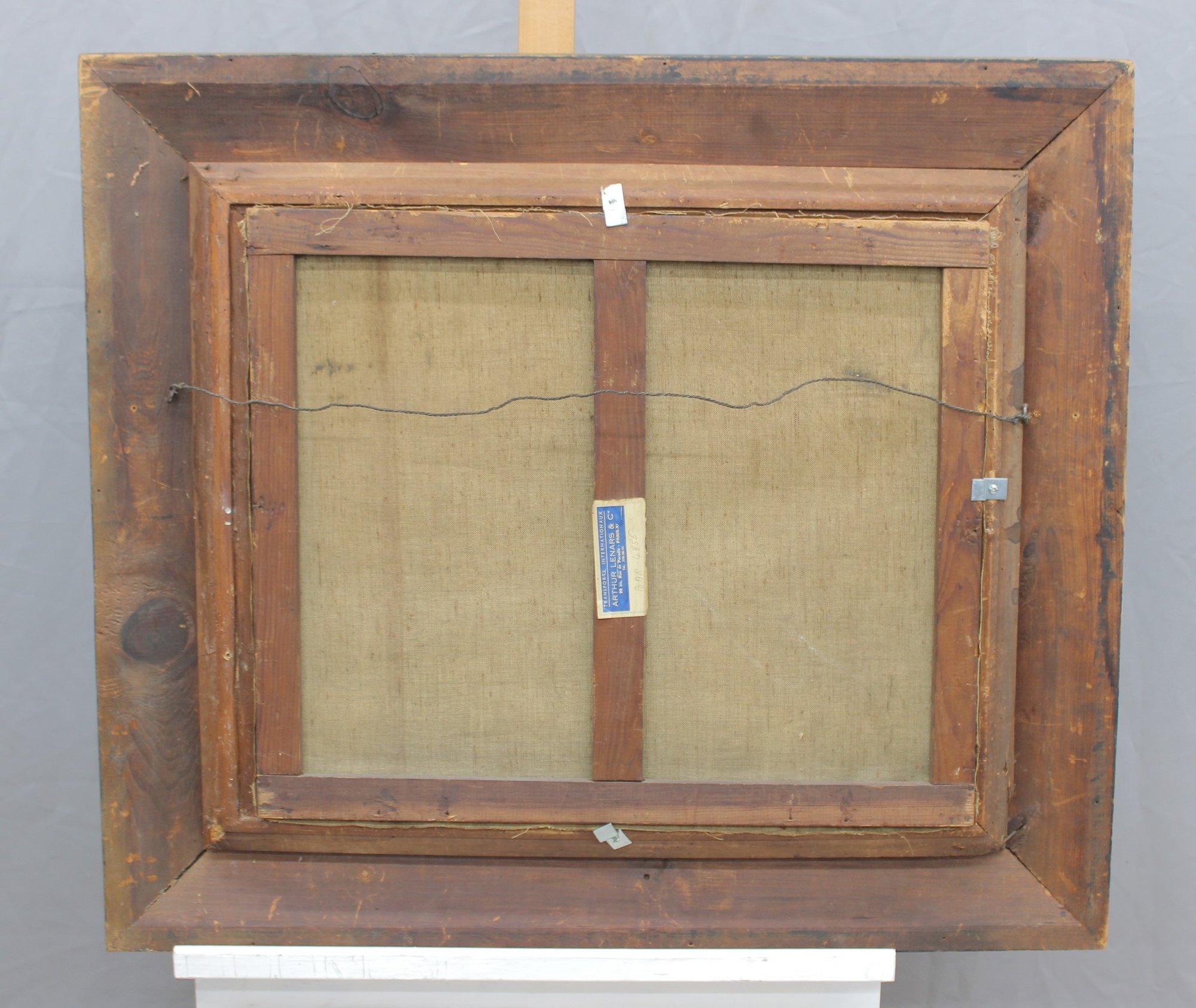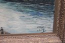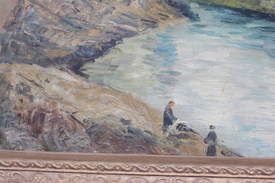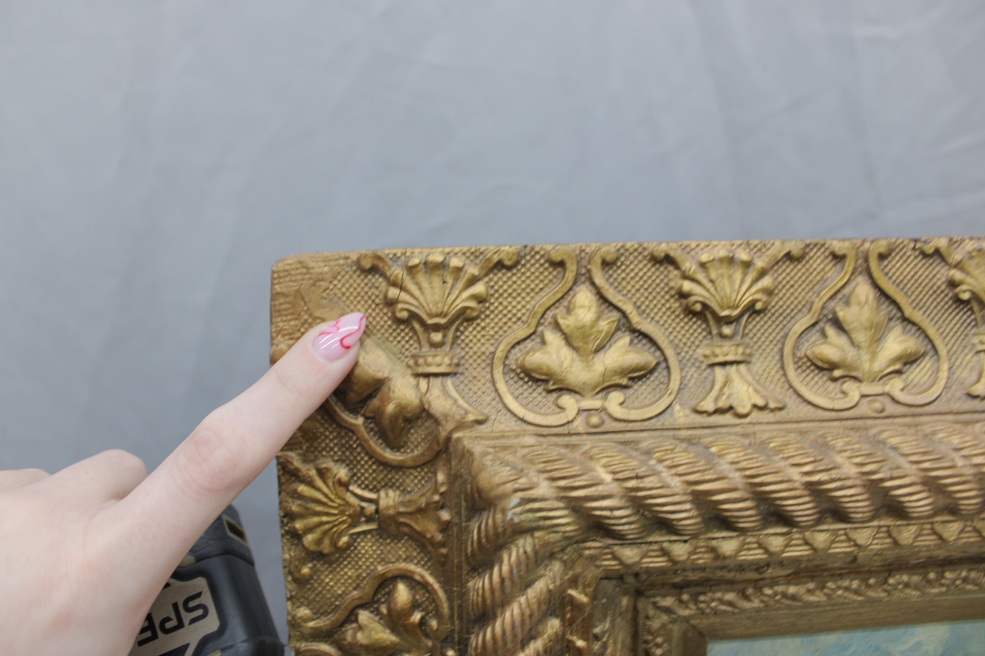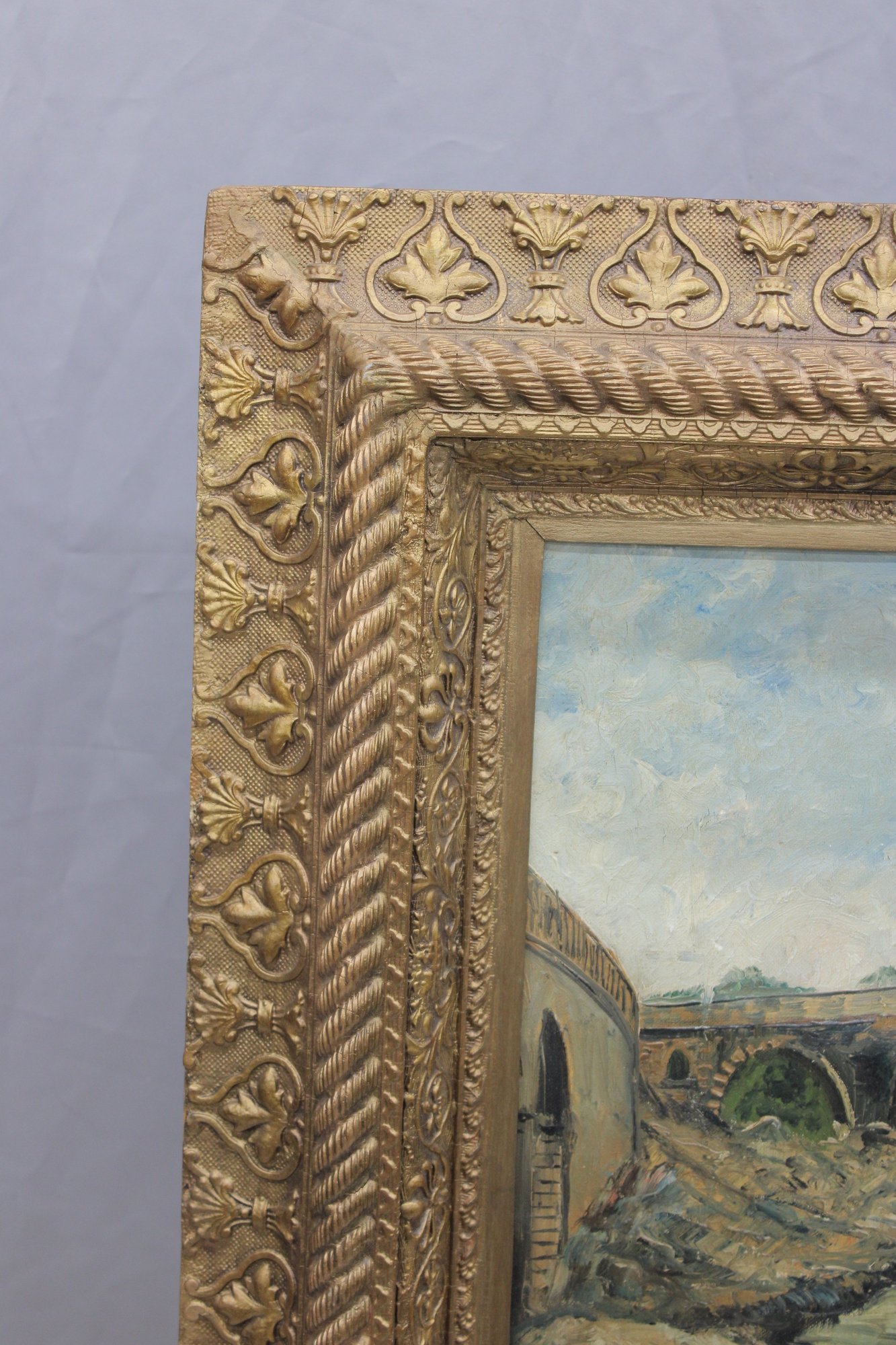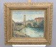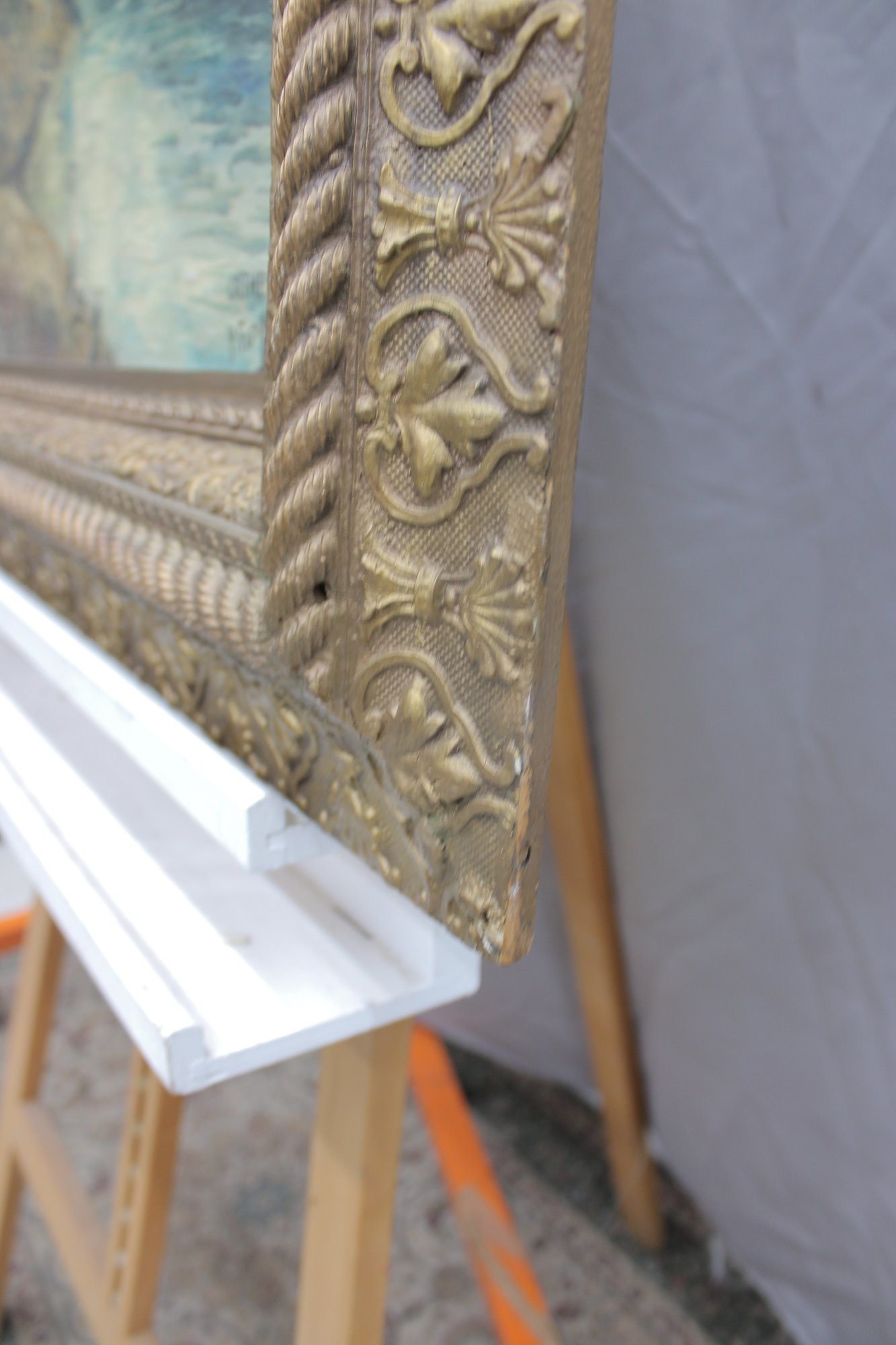 The painting is presented in an ornate gilt frame with rich decorative molding, enhancing its classical character and making it immediately ready for display. A highly decorative and engaging work well suited for collectors of European landscapes or traditional interiors.