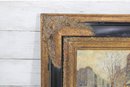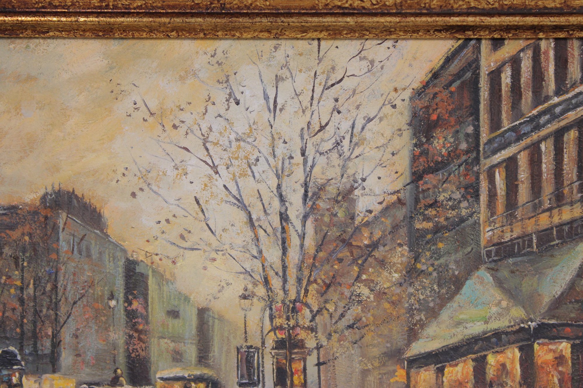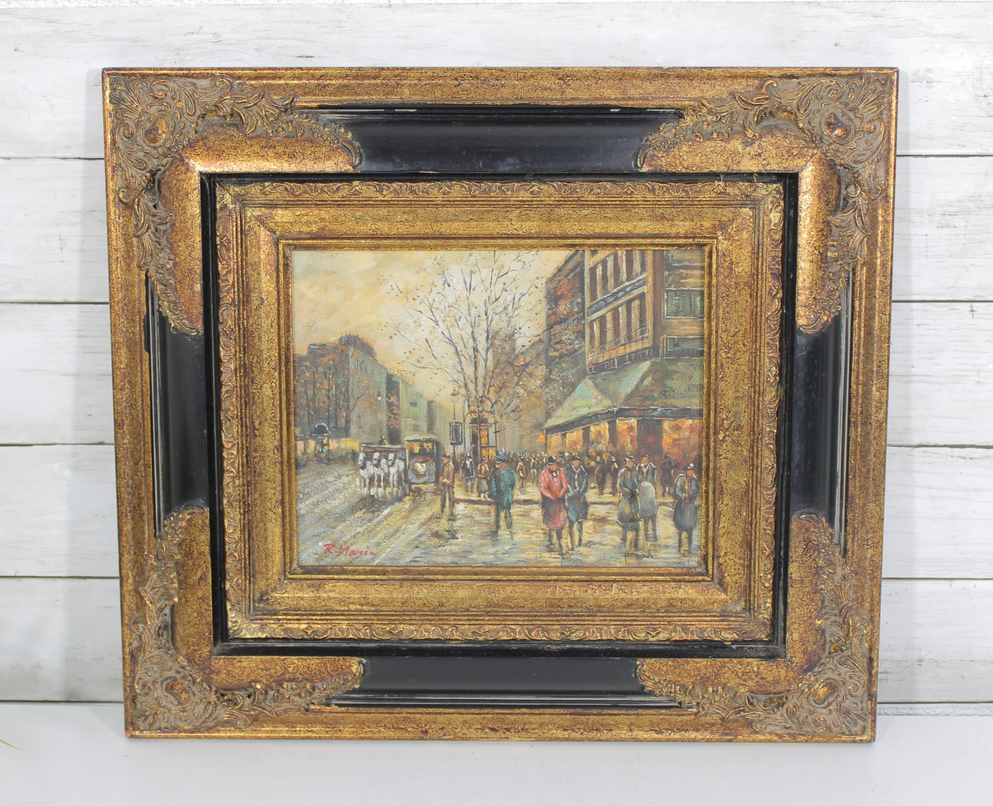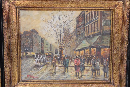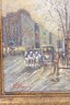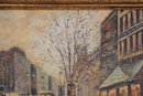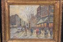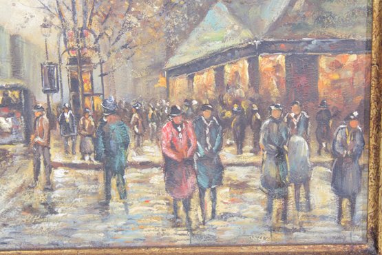 Charming signed impressionist-style painting depicting a lively city street scene with pedestrians, early trolley transport, and storefronts glowing with warm light. The composition captures a bustling urban atmosphere, with figures strolling along wet streets and soft reflections suggesting recent rain.