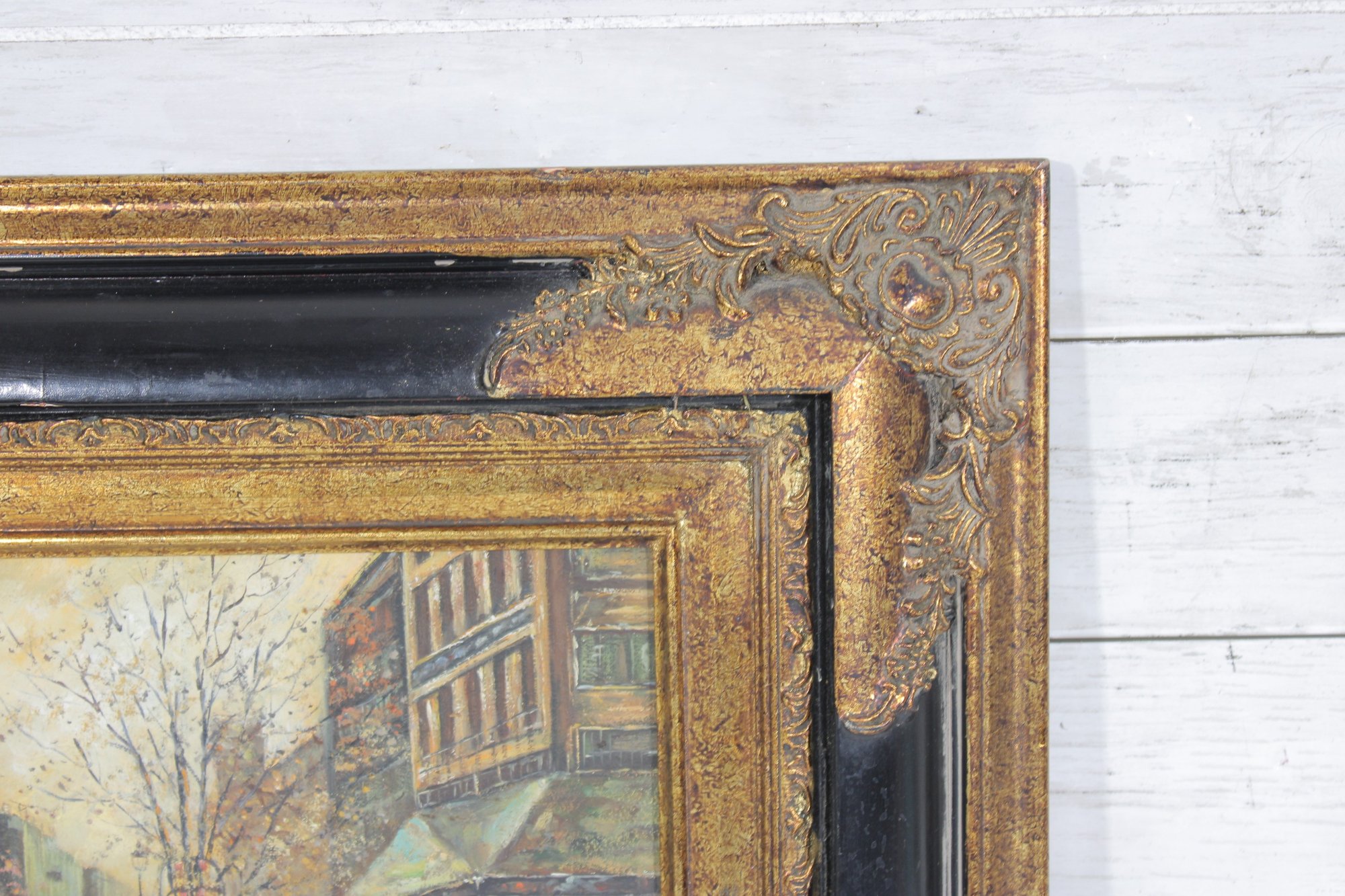 Executed in loose, expressive brushwork, the painting features a rich palette of muted tones with pops of color in the figures’ clothing, creating depth and movement. The artist’s signature appears in the lower left corner (see photos).