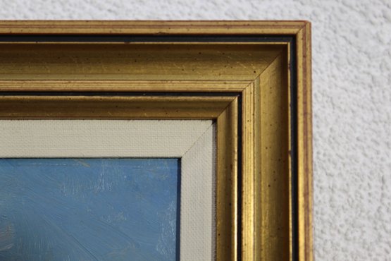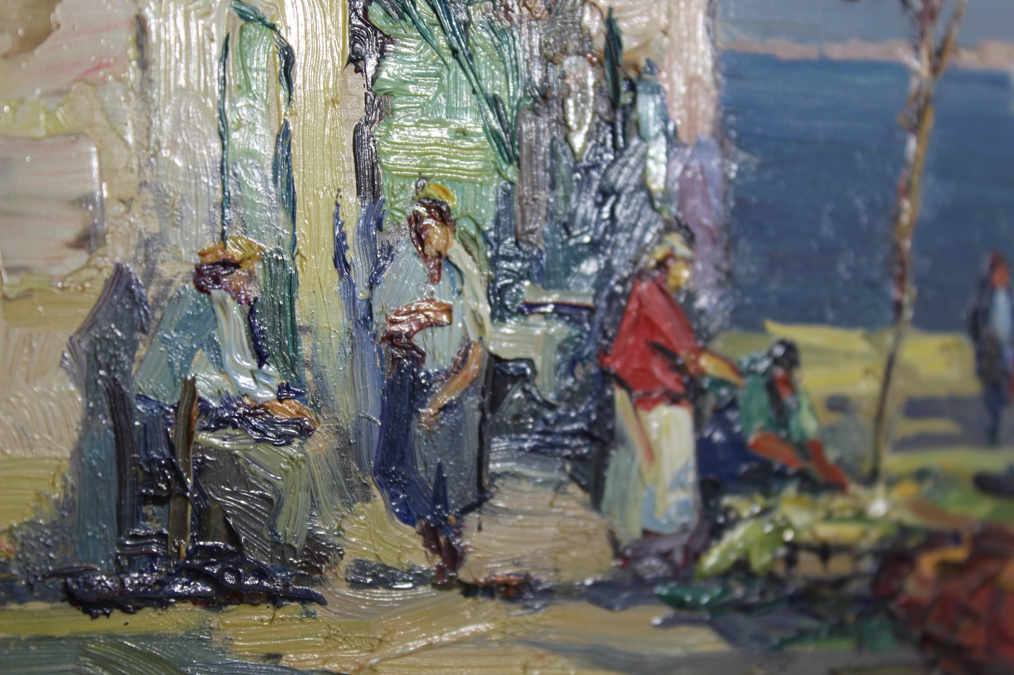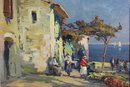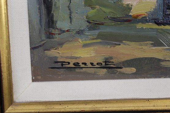 This vibrant impressionist oil painting on board captures a picturesque seaside village scene. Signed by the artist “Perrot,” the artwork depicts a lively street with figures engaged in daily activities, bathed in sunlight with the serene backdrop of the ocean. The textured brushstrokes and rich colors bring the scene to life, evoking a sense of warmth and nostalgia.