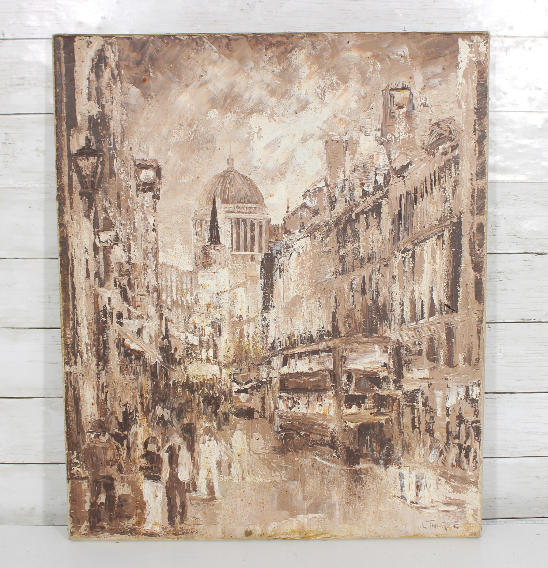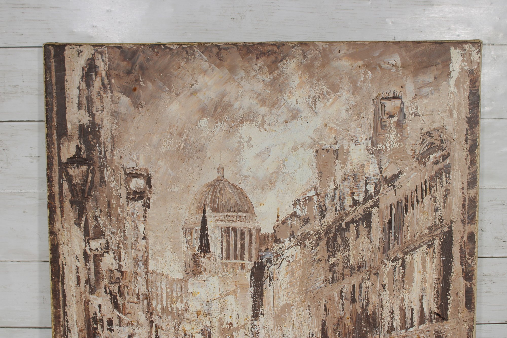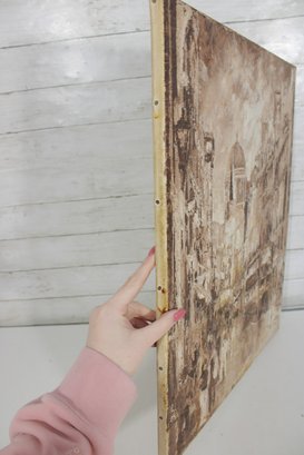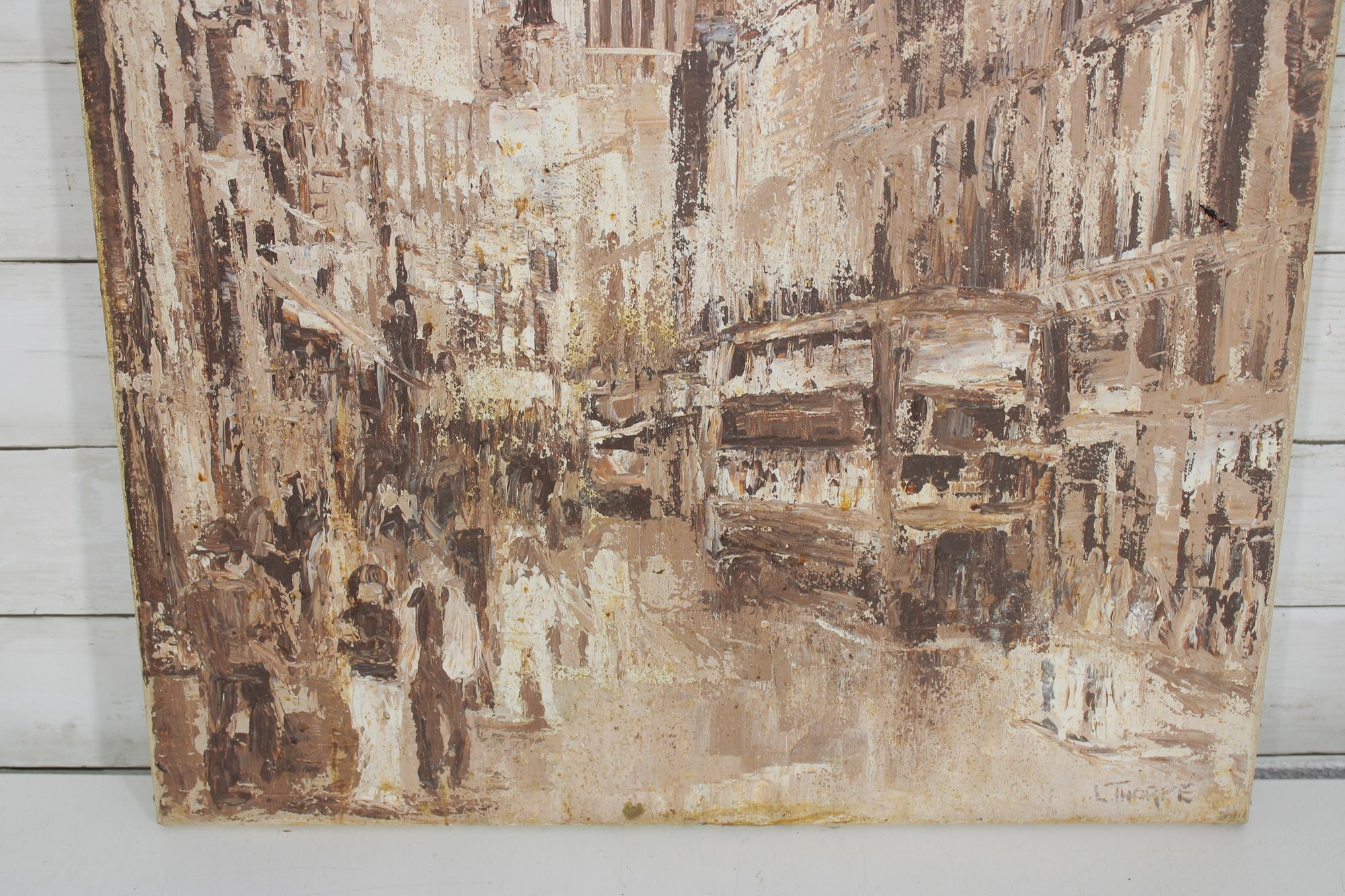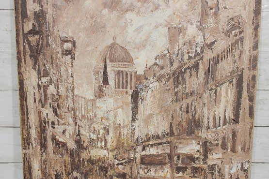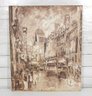 The artist uses expressive brushwork and layered textures to capture movement and depth, with figures, street activity, and architectural details blending into a cohesive, atmospheric scene. The monochromatic palette gives the piece a timeless, vintage feel while emphasizing its painterly quality.