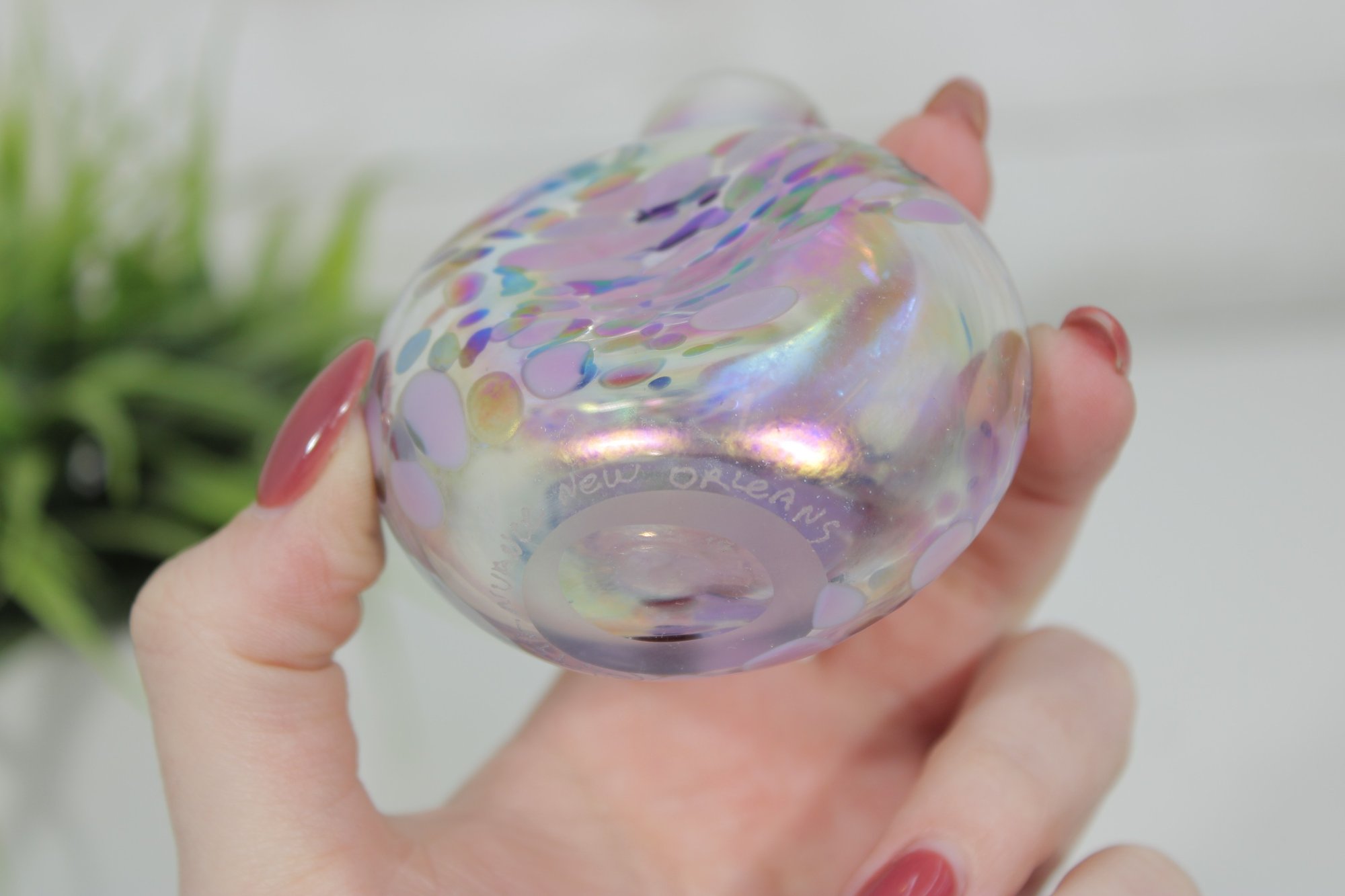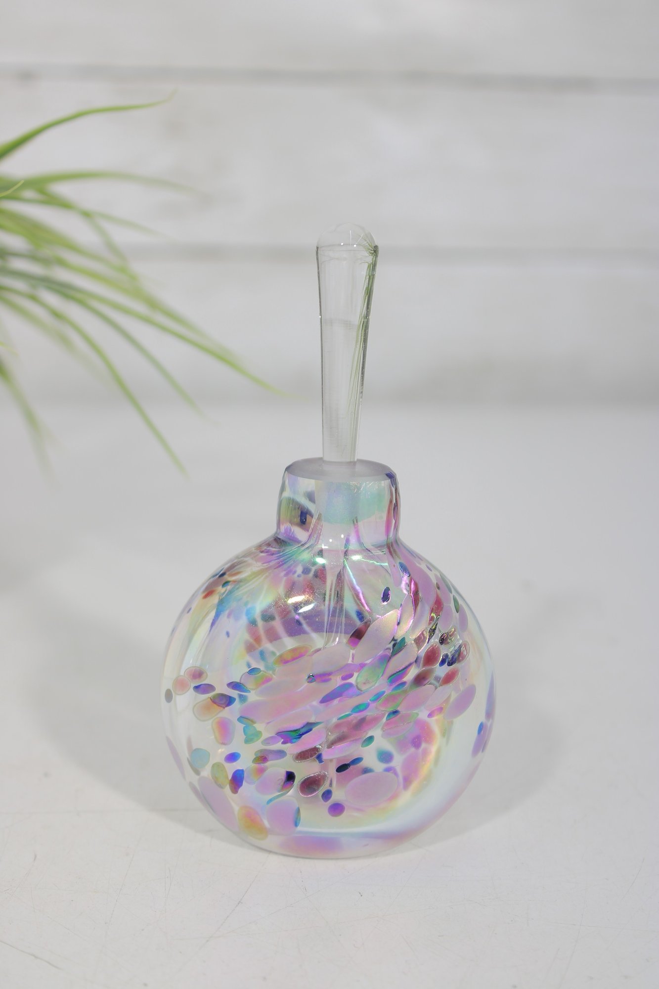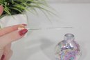 This striking piece displays a rounded, low-profile form with swirling purple, white, and multicolor confetti-like accents throughout the glass. The iridescent surface catches the light beautifully, creating flashes of pink, blue, and gold tones. The bottle includes its original long glass dauber stopper.