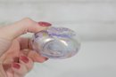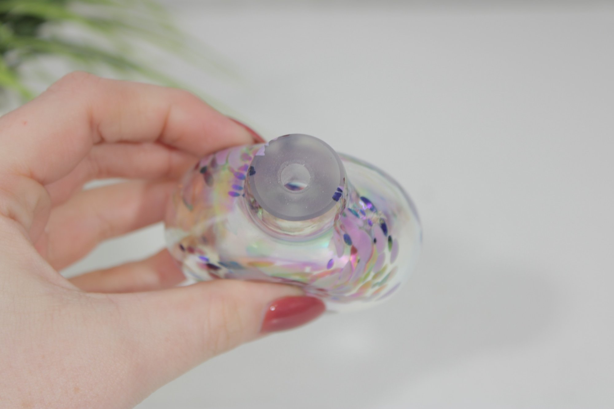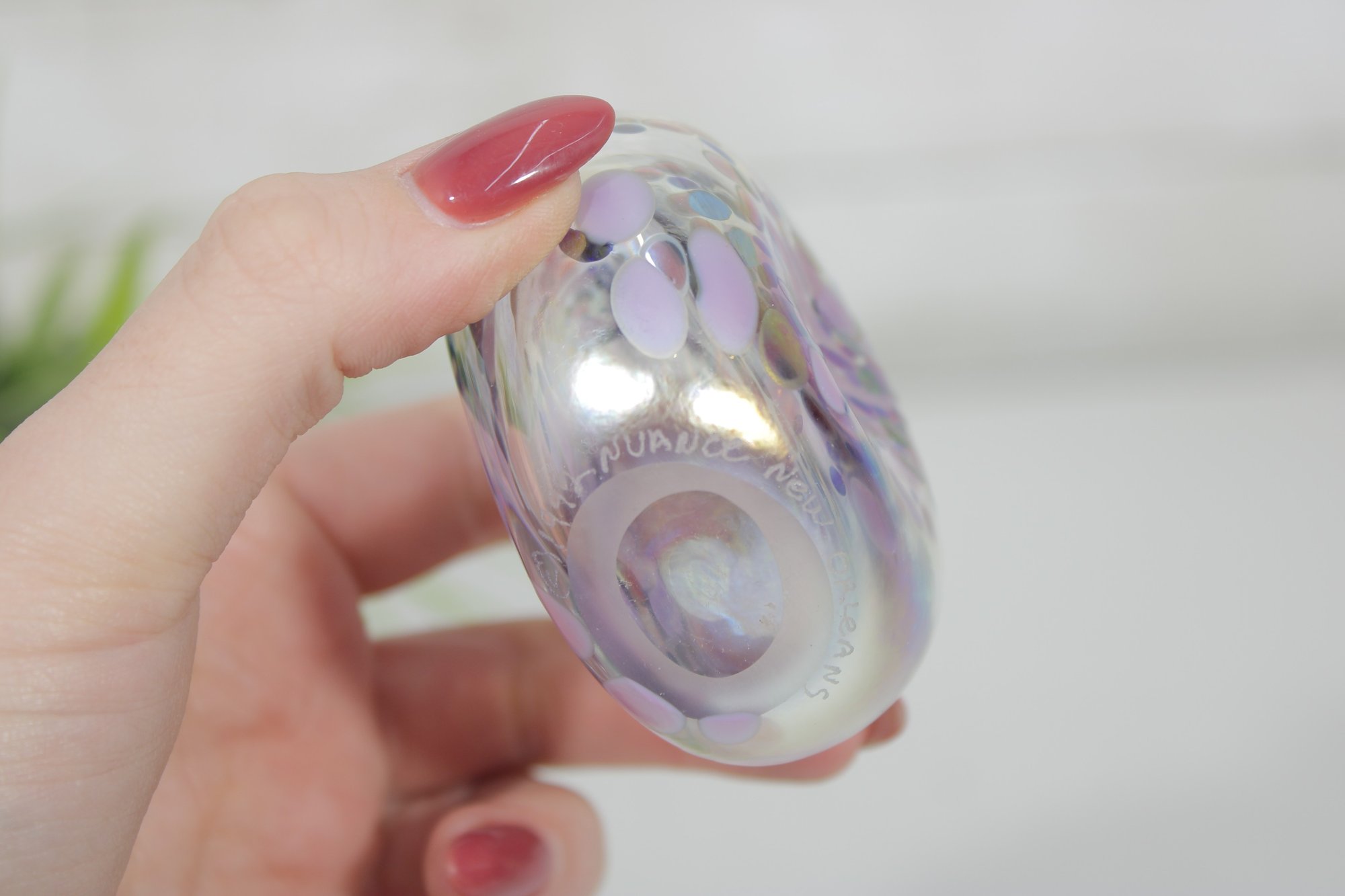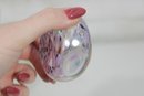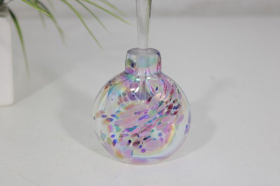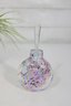 a beautiful signed purple and white art glass perfume bottle featuring a vibrant iridescent finish.