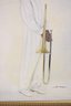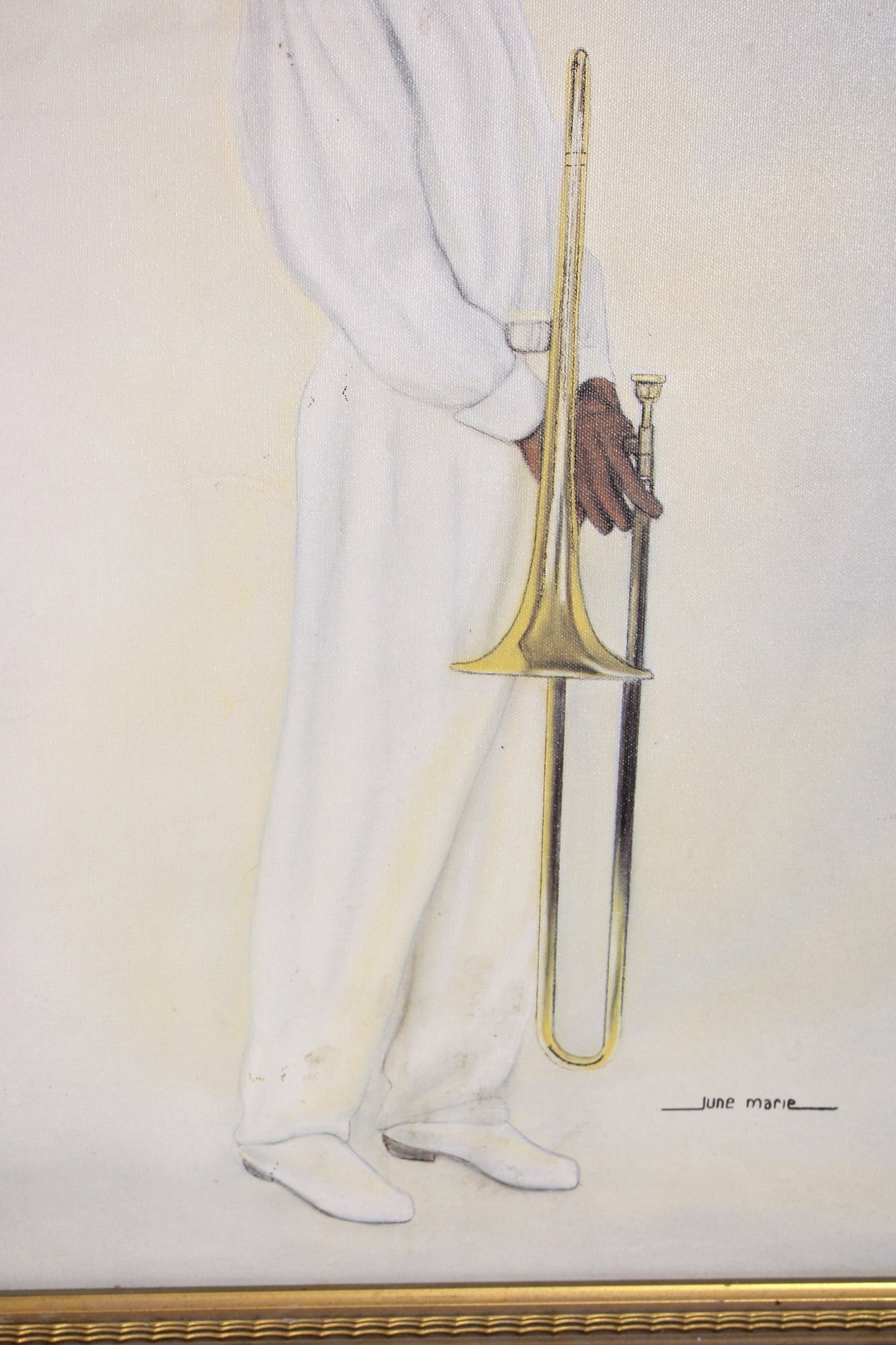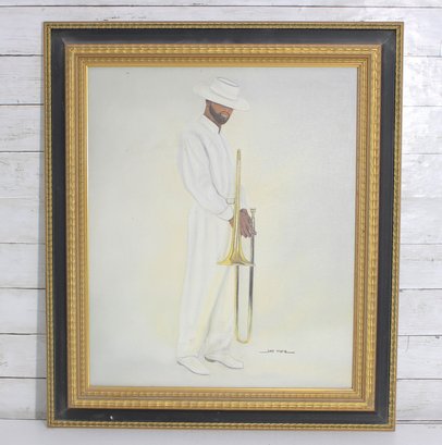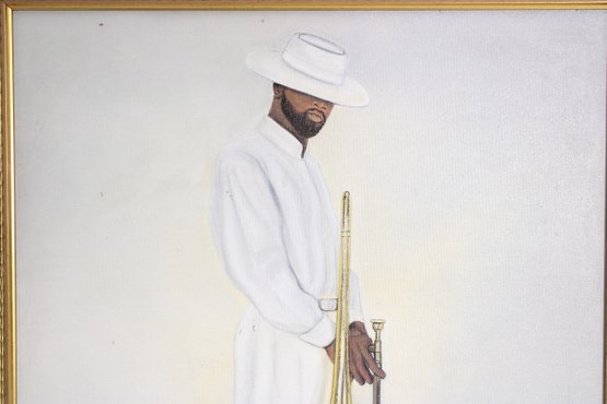 Stylish signed lithograph on canvas depicting a sophisticated jazz musician dressed in an all-white suit and hat, holding a trombone. The minimalist composition and soft neutral palette give the artwork a refined, contemporary feel while celebrating classic jazz culture and fashion.