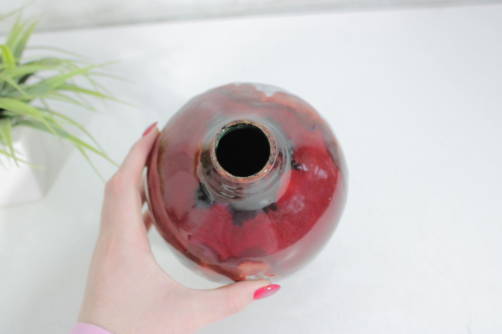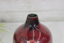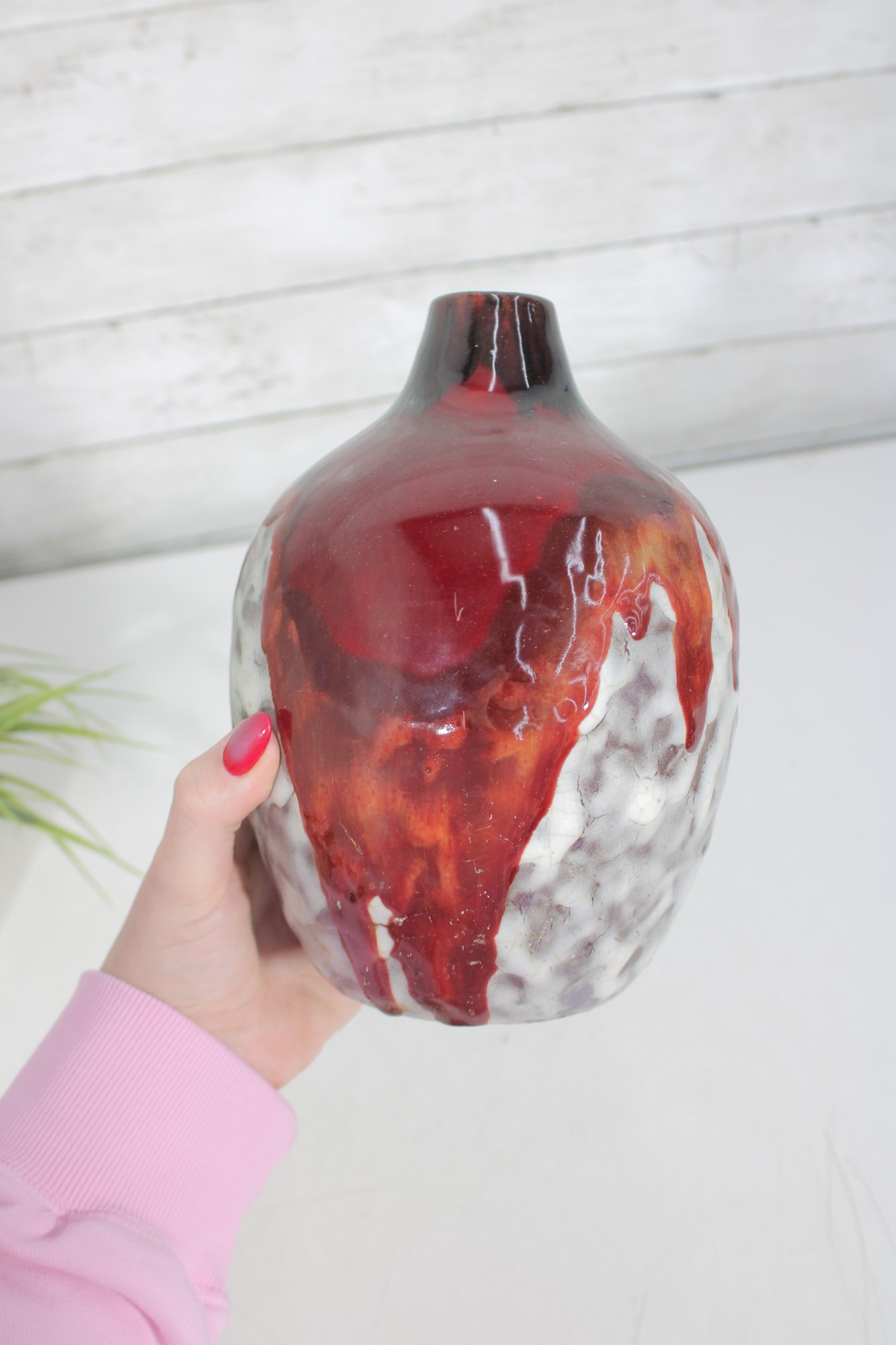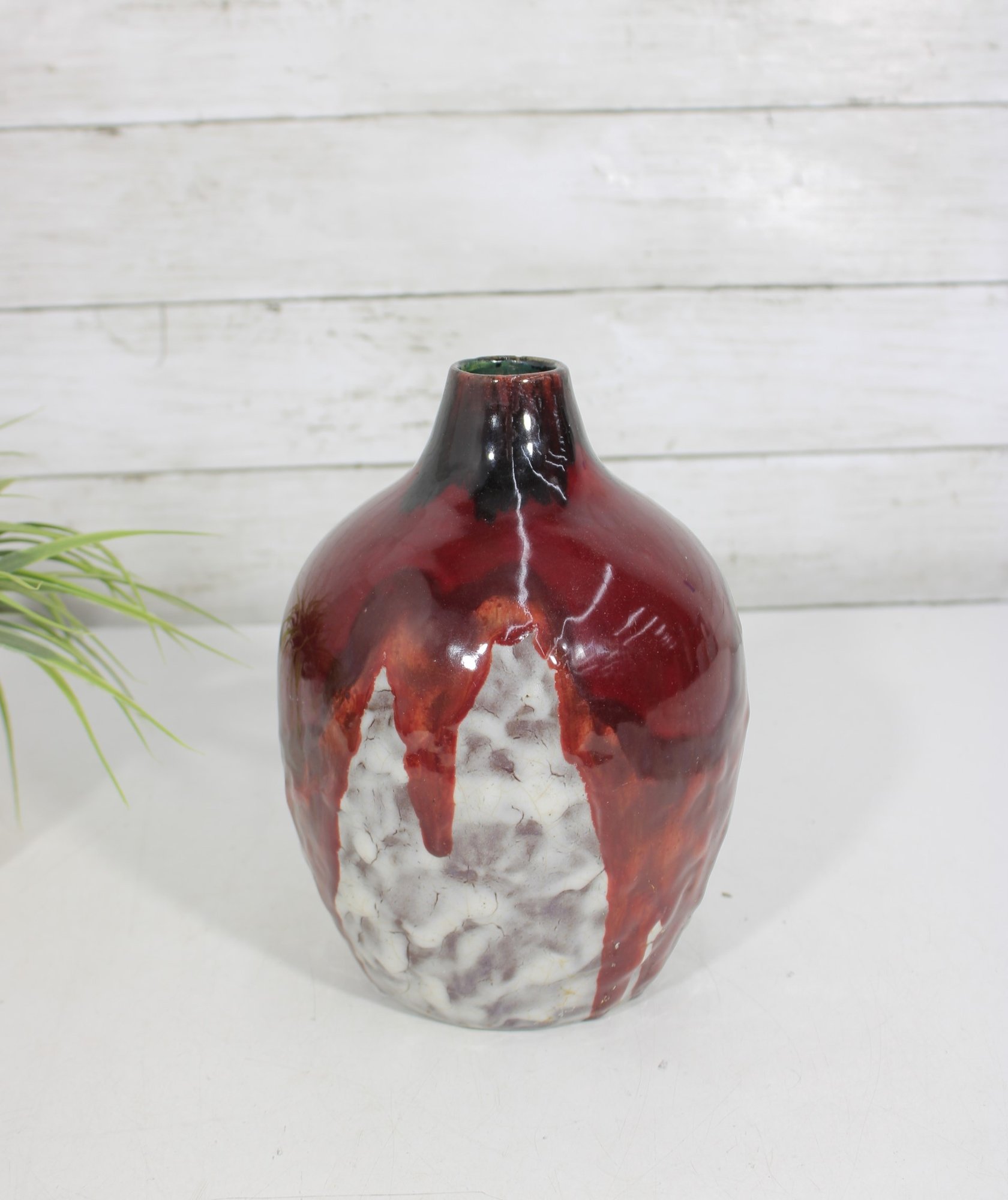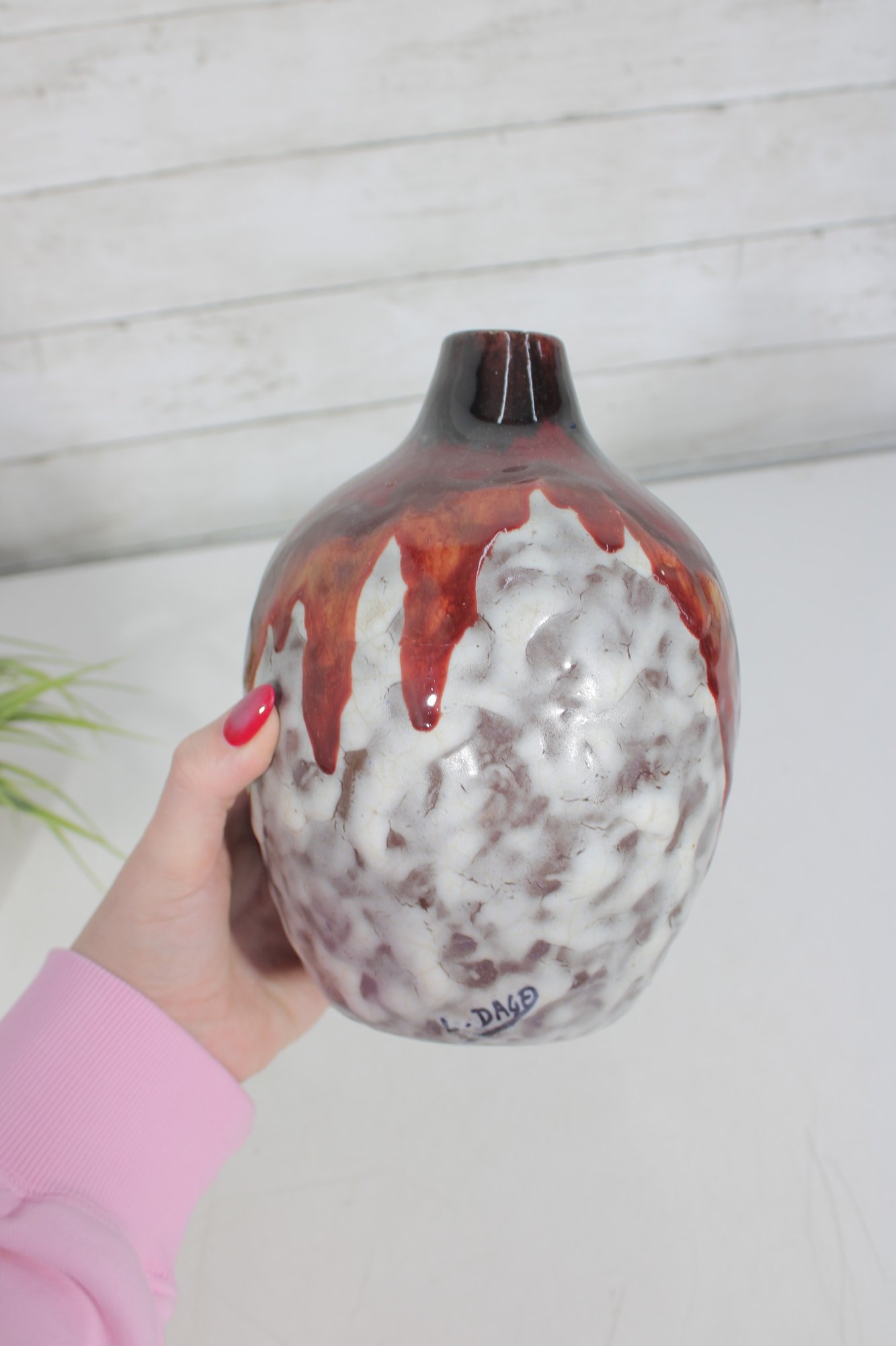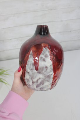 a striking signed L. Dage studio pottery vase, crafted in France and featuring a bold, artistic drip glaze design. The vase showcases a rich deep red glaze cascading over a textured white and earthy-toned body, creating a dynamic and organic visual effect.
