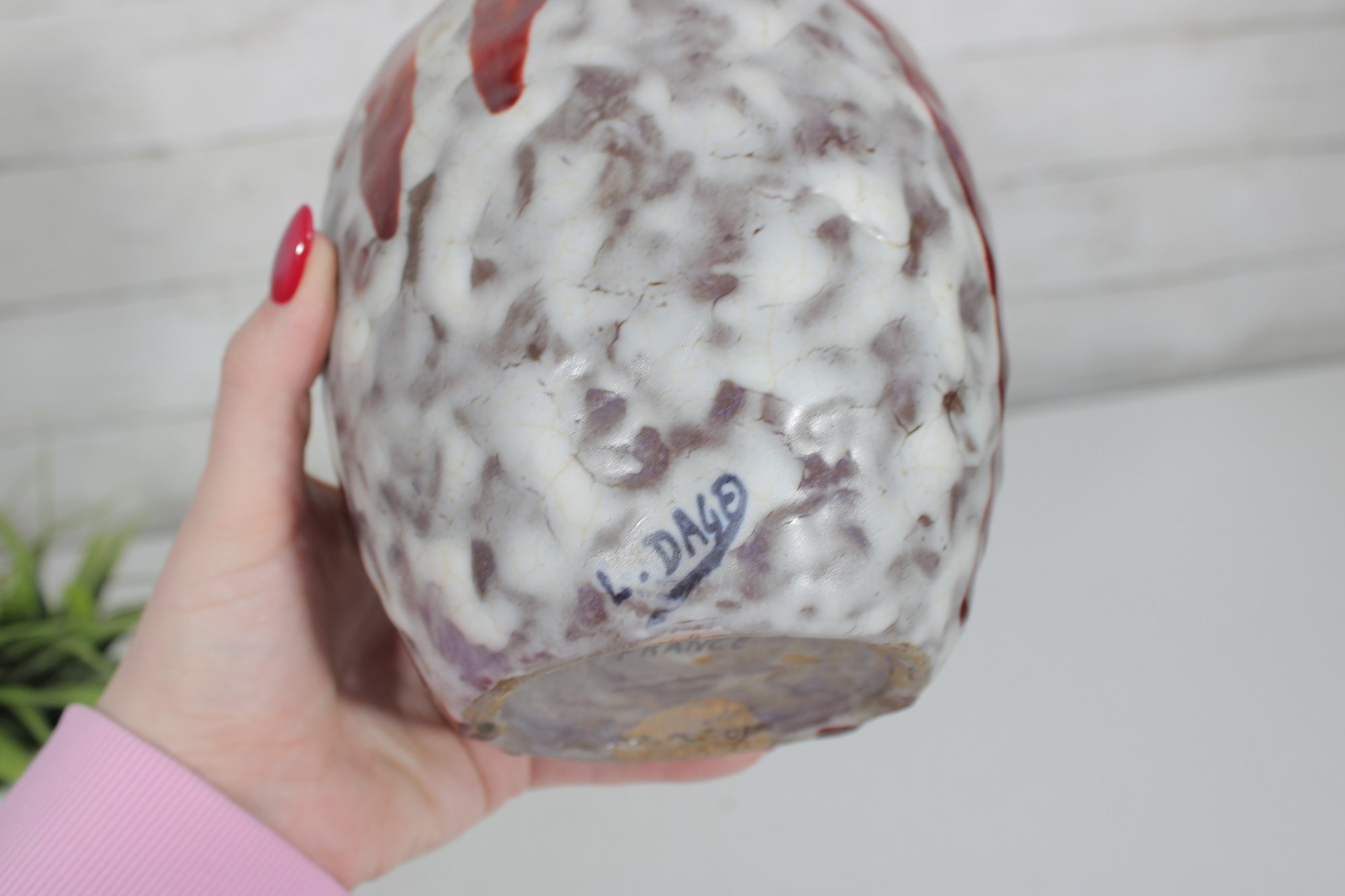 This handcrafted piece has a pleasing rounded form with a narrow neck, making it ideal for display on its own or for holding dried or decorative stems. The underside is clearly marked “Made in France” and signed L. Dage, adding to its authenticity and collectible appeal.