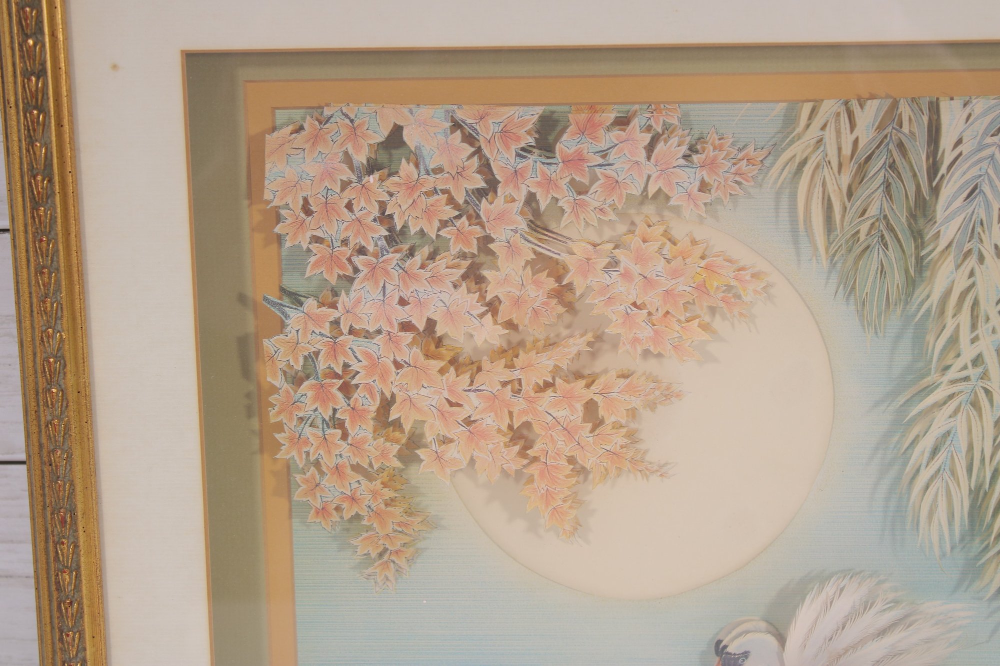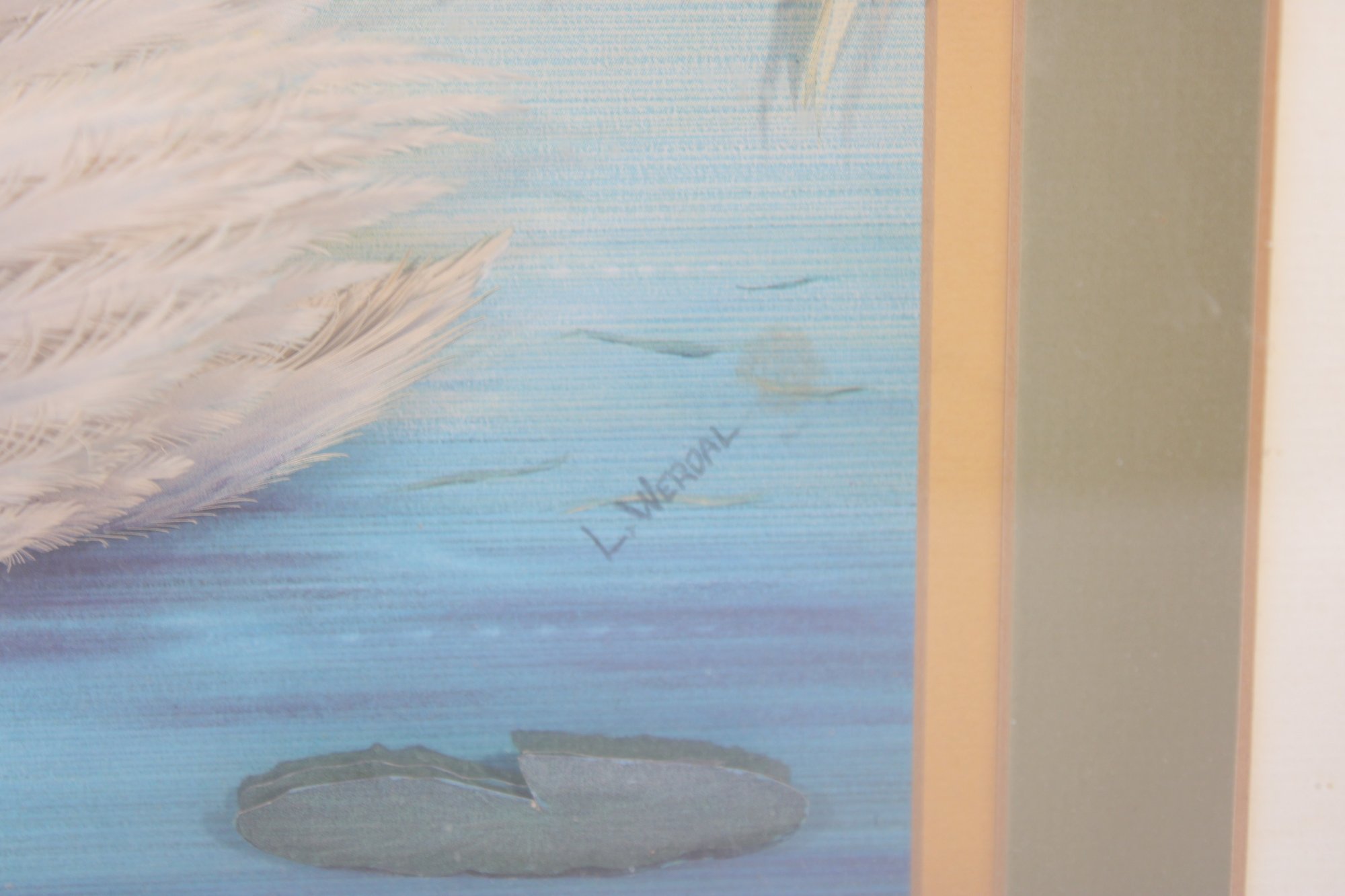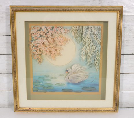 here is a serene and visually striking framed 3D art print signed L. Weroal, featuring a graceful swan gliding across a მშვიდ water scene beneath a glowing full moon.