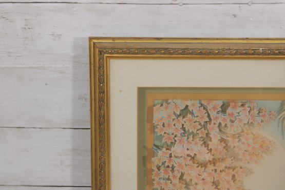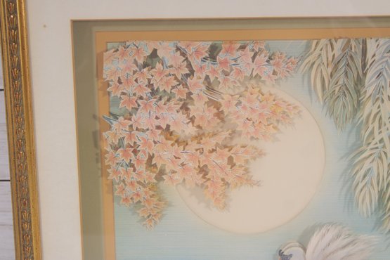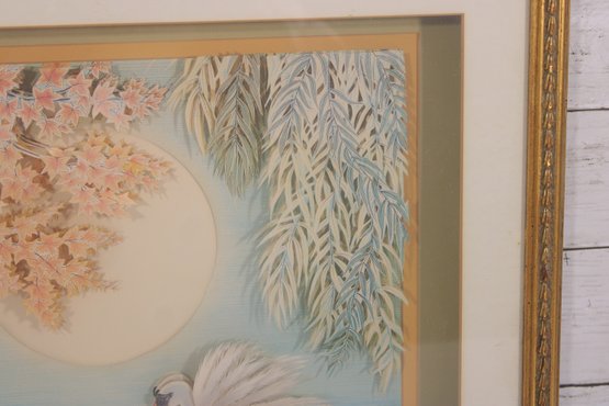 This piece showcases a layered, dimensional design, giving the artwork a subtle three-dimensional effect that enhances depth and visual interest. The composition includes delicate cherry blossoms, soft willow branches, and floating lily pads, all rendered in calming pastel tones of blue, cream, and blush.