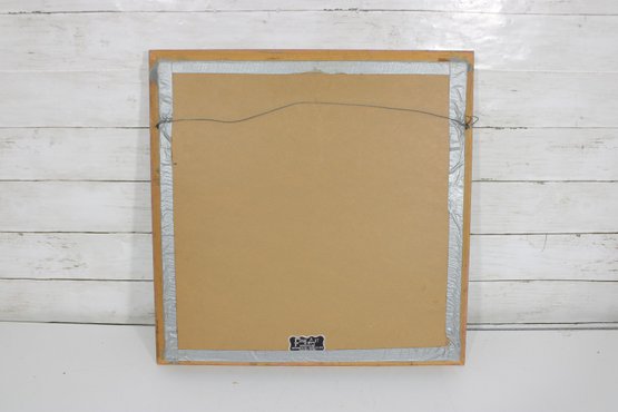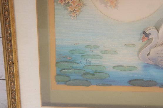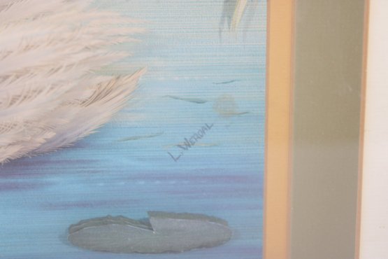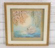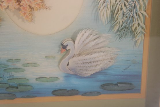 The swan is beautifully detailed with textured feathering, standing out prominently against the tranquil background. The artist’s signature is visible within the image.