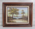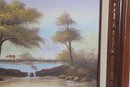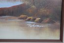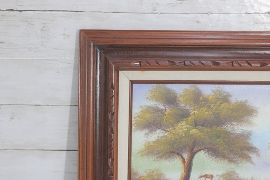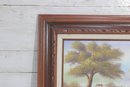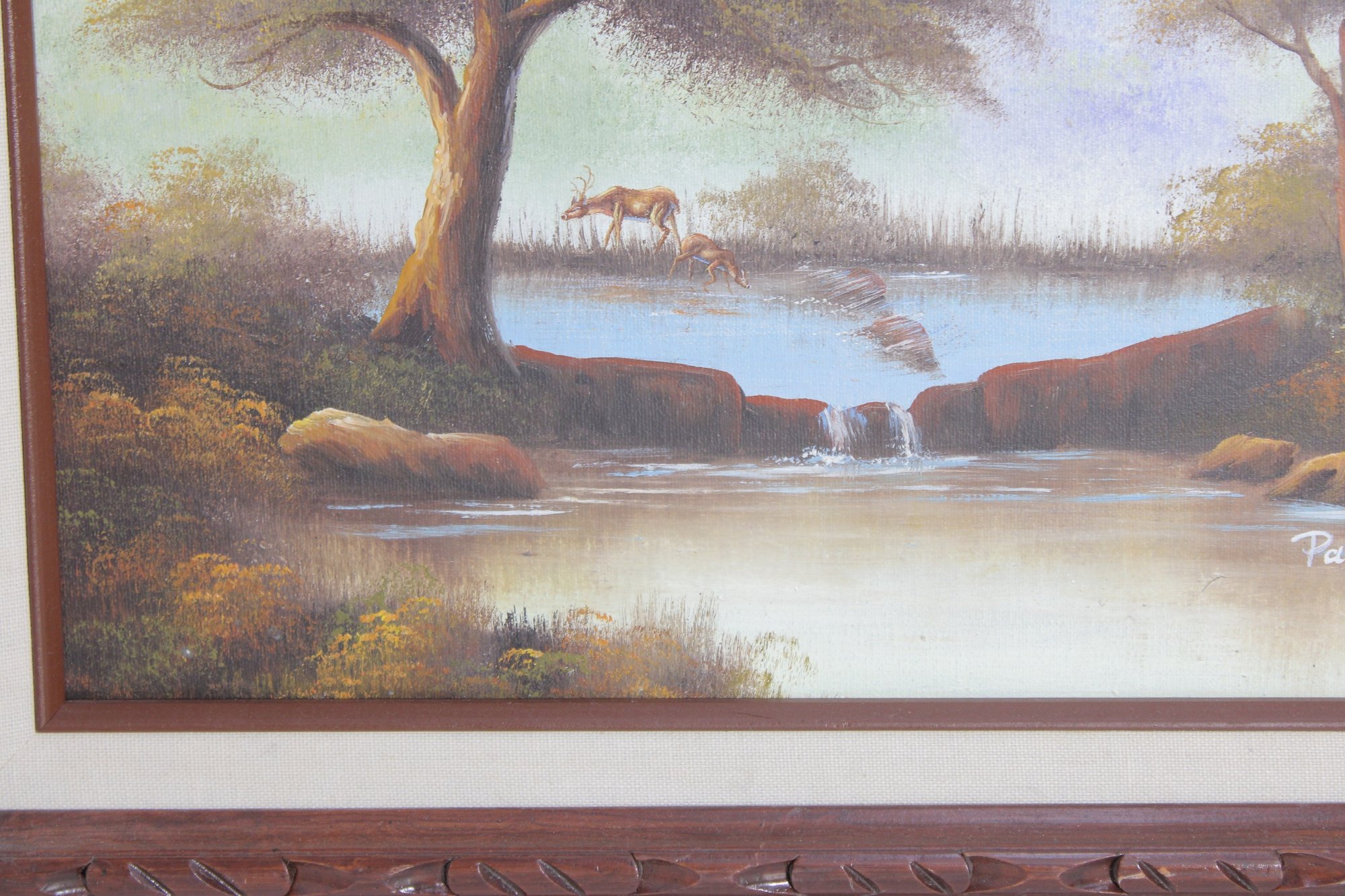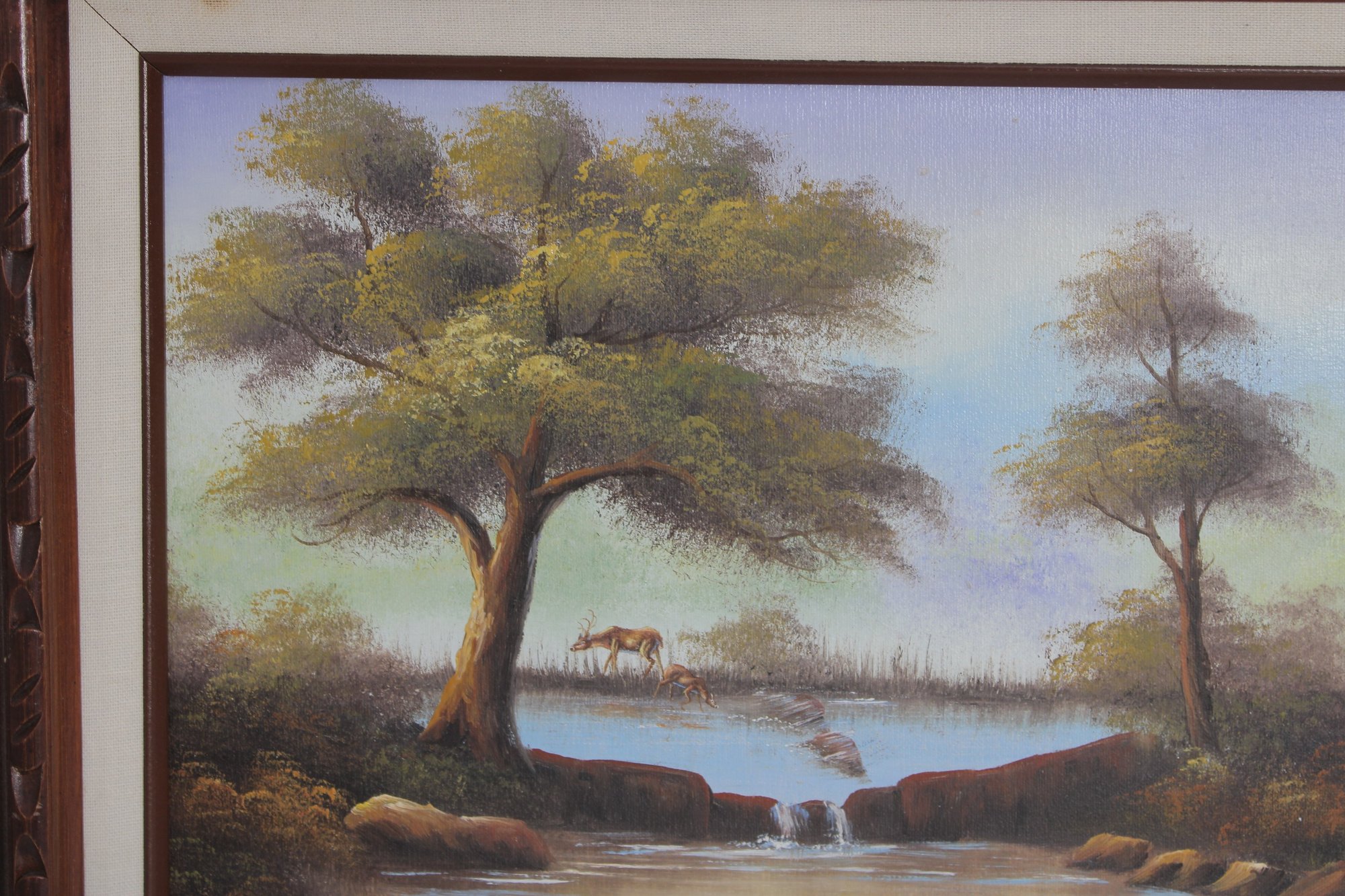 Beautiful signed landscape painting depicting a tranquil woodland scene with deer grazing near a quiet stream beneath softly lit trees. The warm earth tones and gentle atmospheric style create a peaceful natural setting, making this a lovely decorative piece for traditional or rustic interiors.