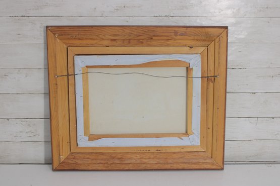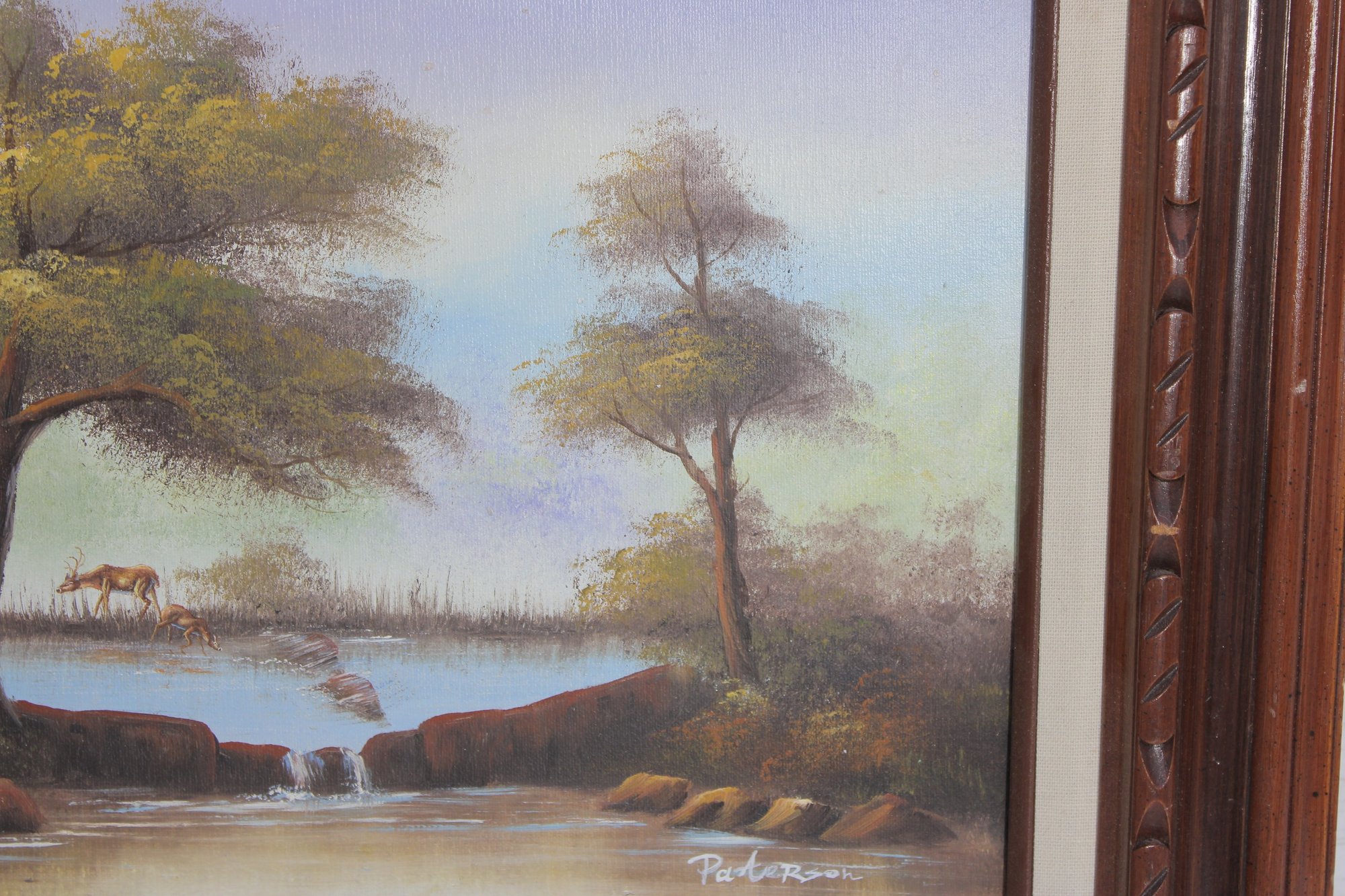 Signed “Patterson-?” in the lower corner, the artwork is presented in an attractive carved wood-tone frame that enhances the classic landscape aesthetic.