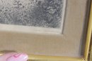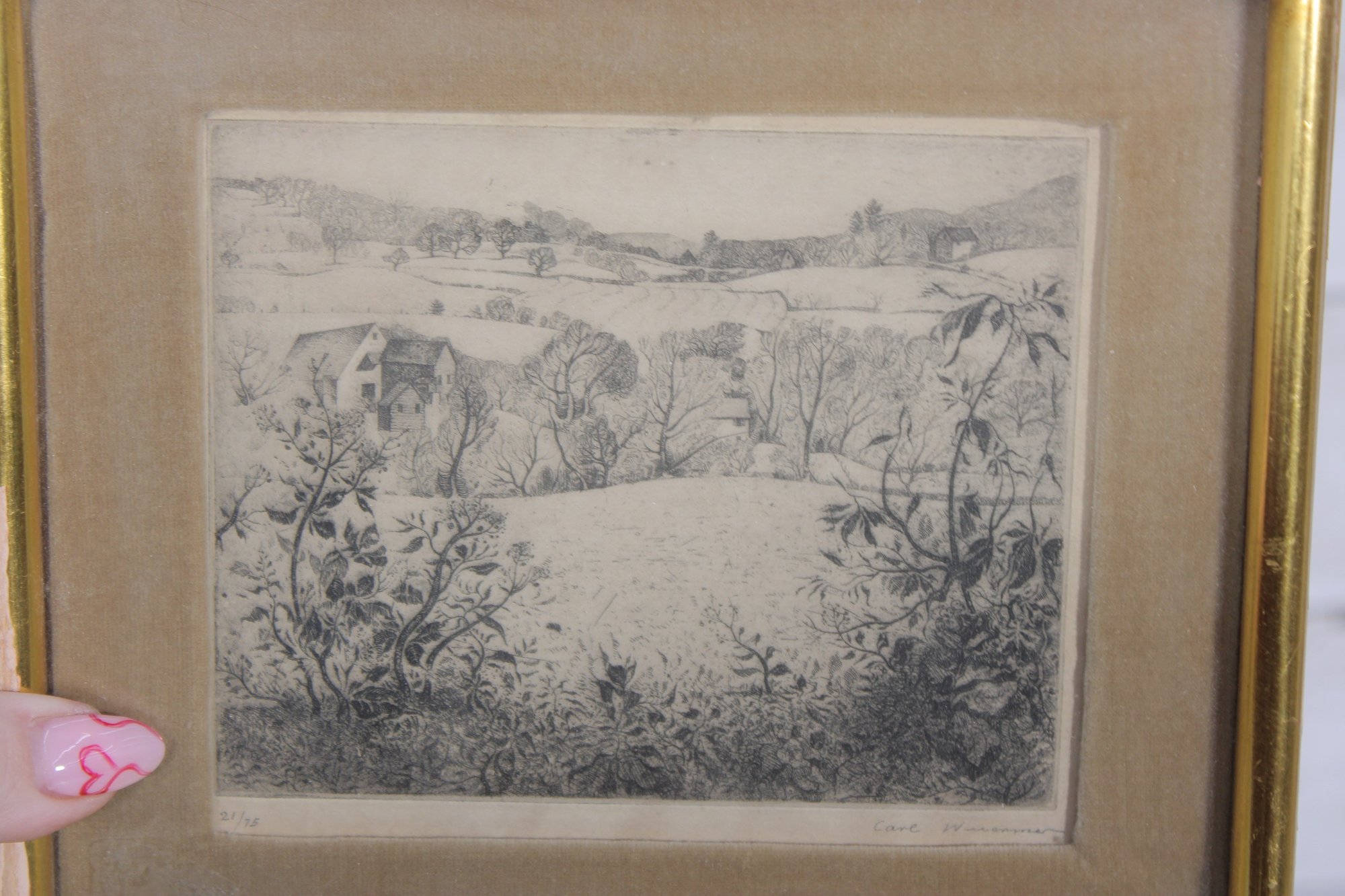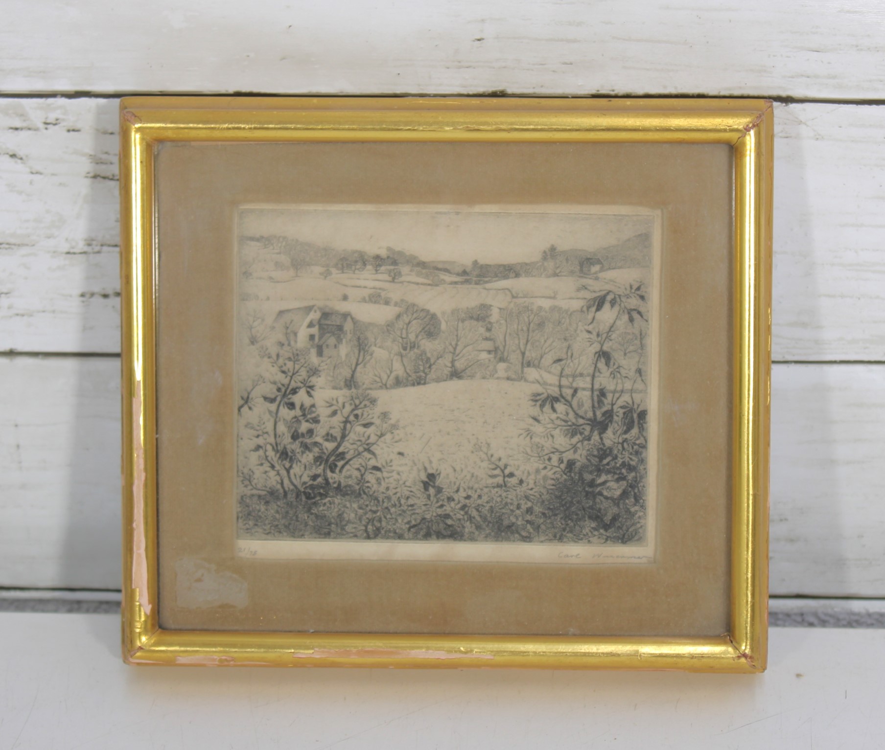 Charming limited edition etching depicting a peaceful pastoral landscape with rolling hills, trees, and detailed foreground foliage. The fine linework and soft tonal shading create depth and a tranquil countryside scene.