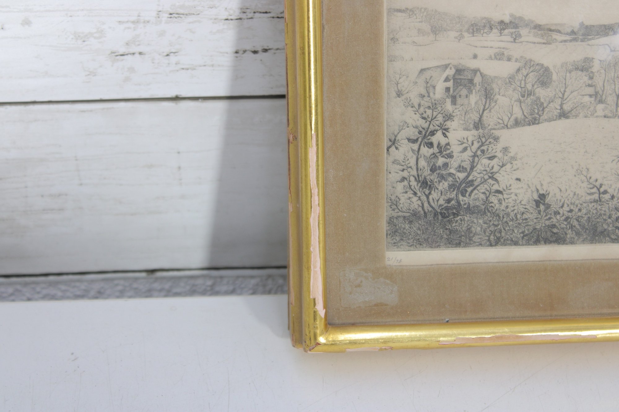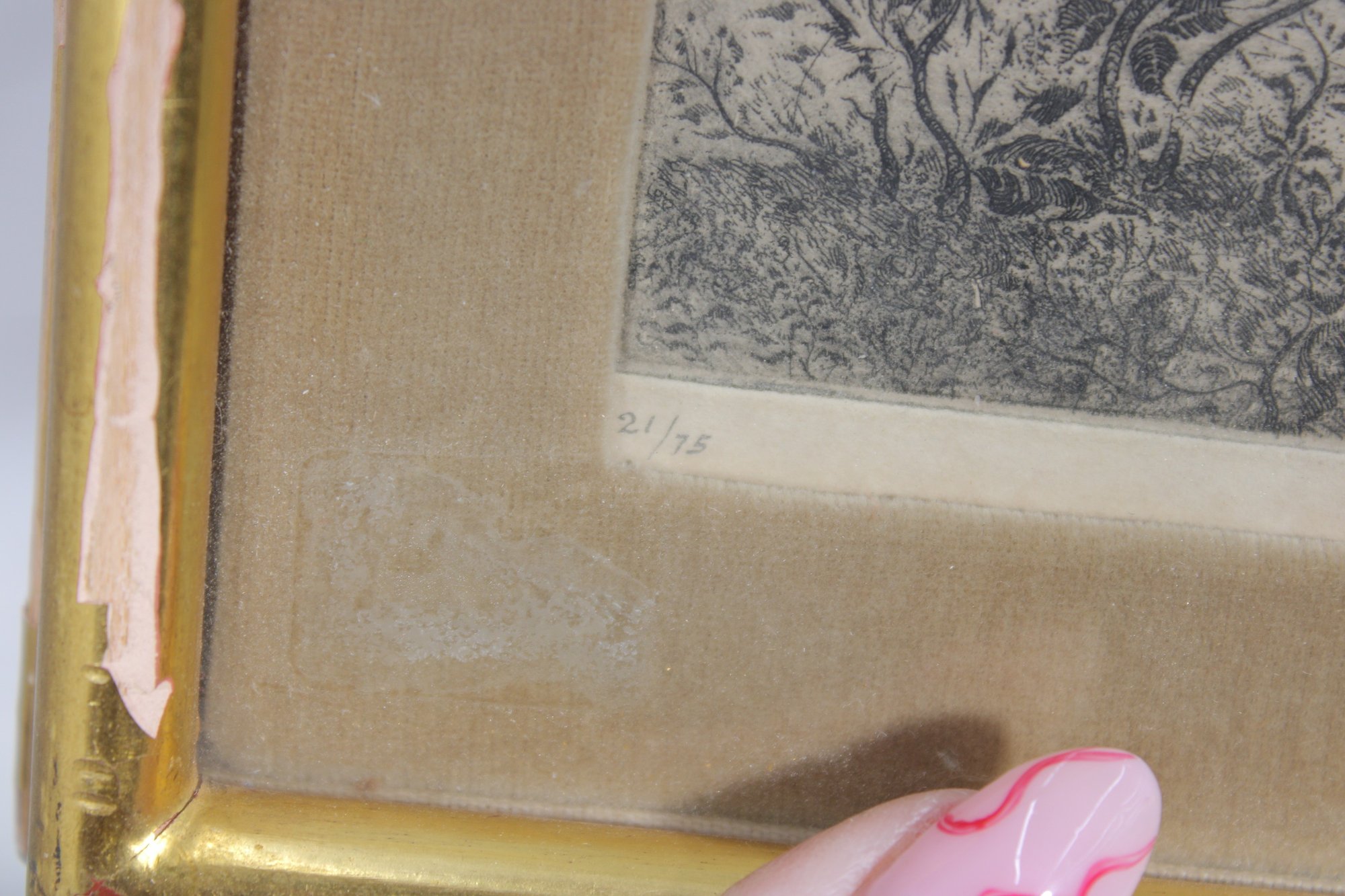 Print appears in good vintage condition with age-appropriate toning. Mat shows noticeable staining and discoloration. Frame shows minor wear. Backing paper intact with light wear.