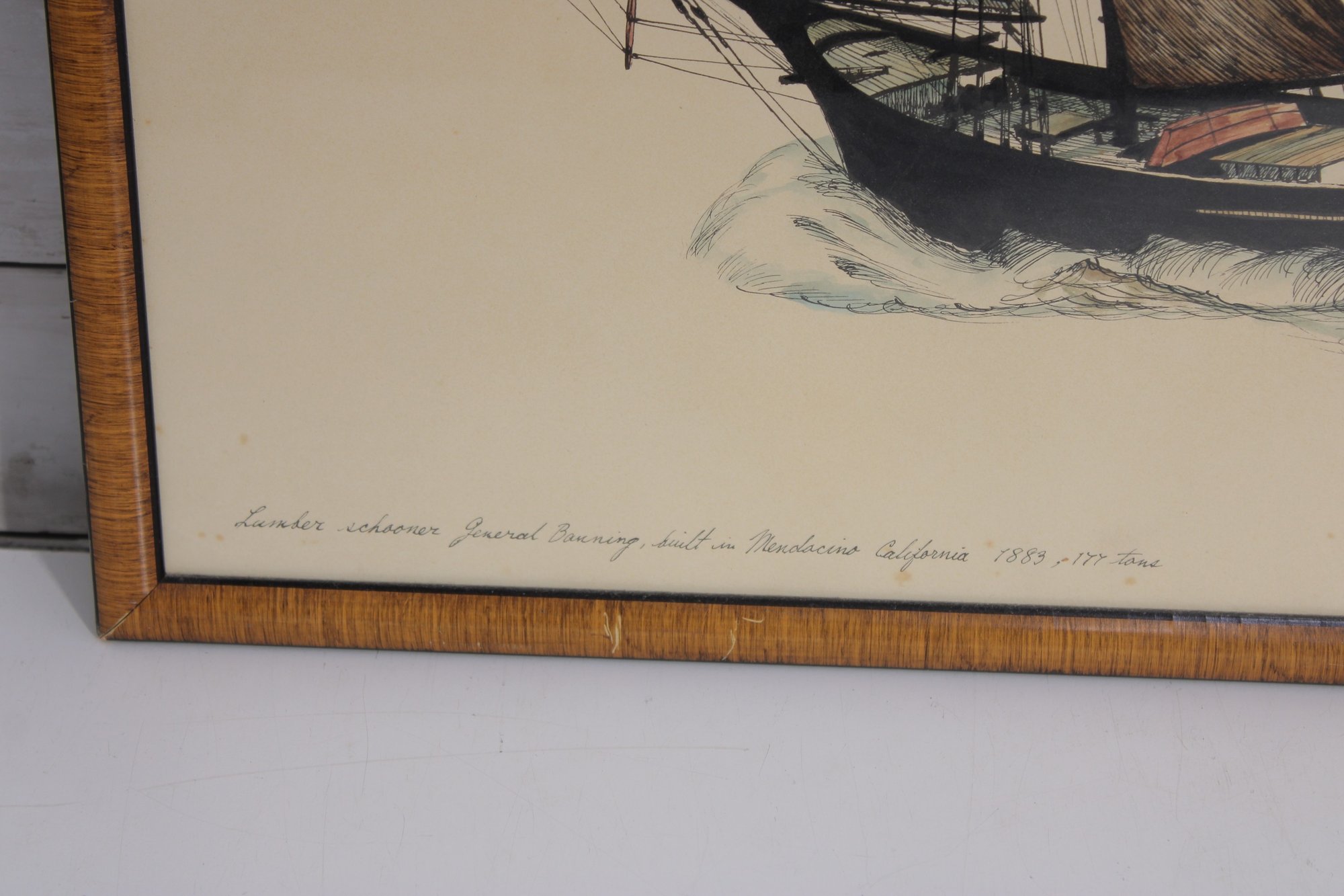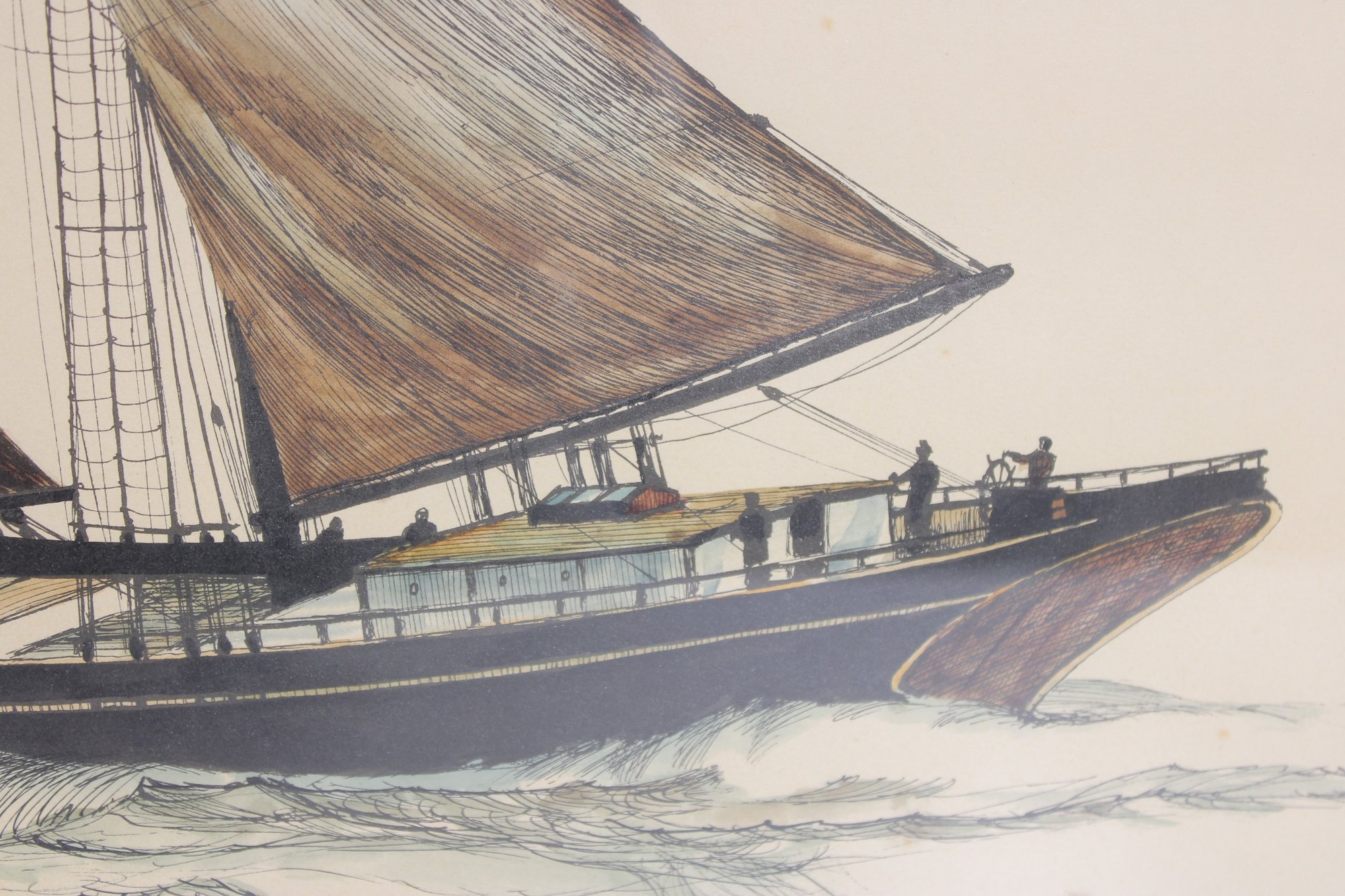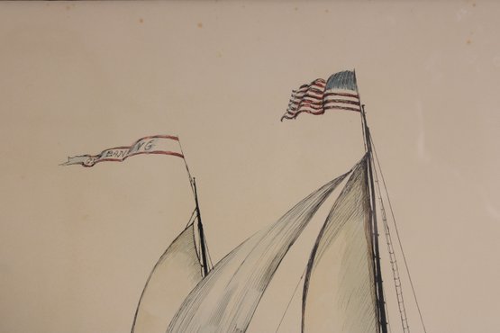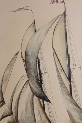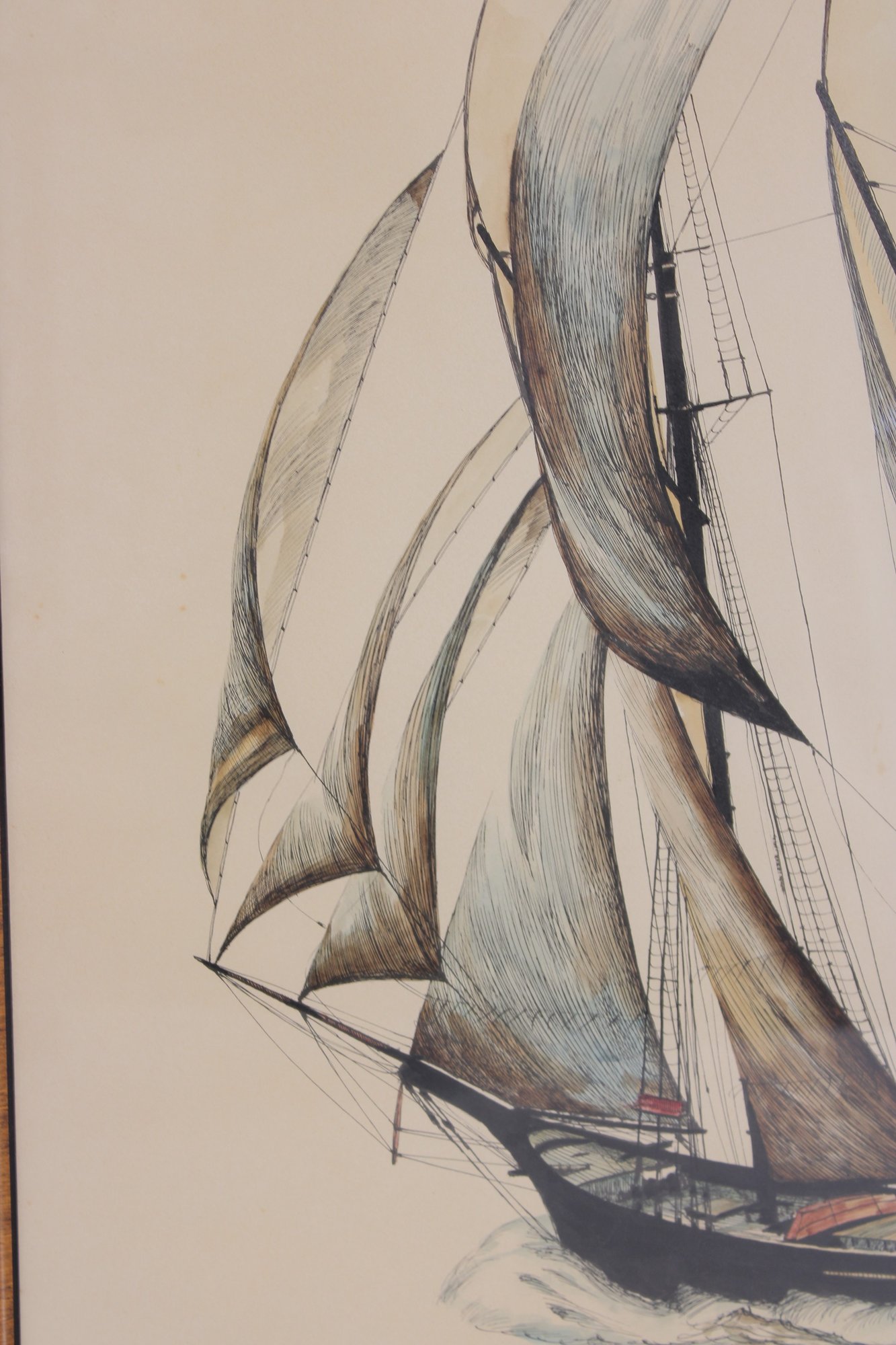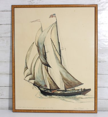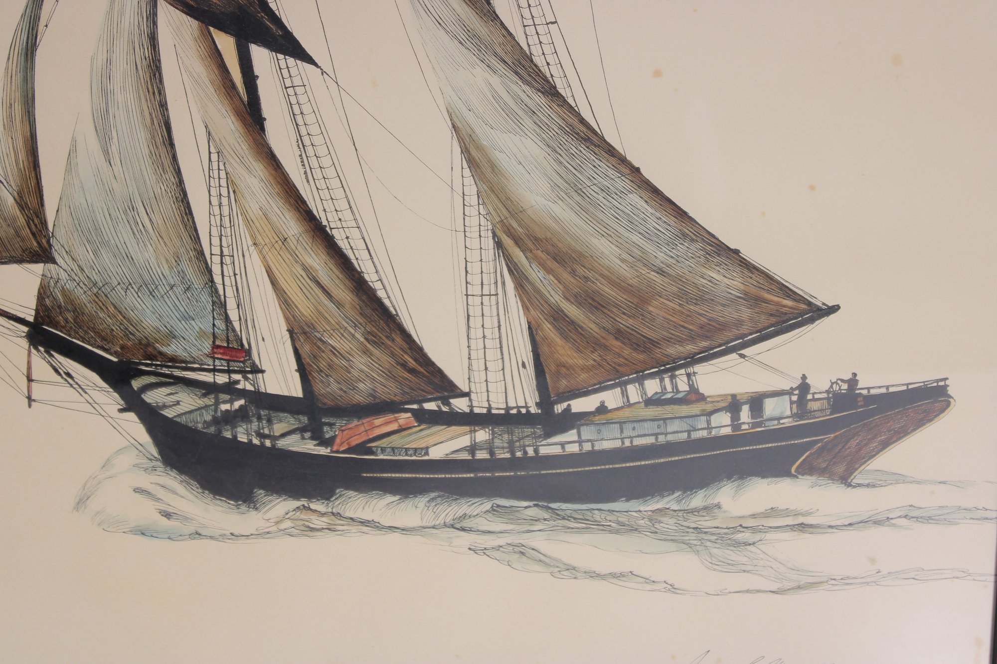 Beautiful signed limited edition print depicting a classic sailing schooner cutting through the waves under full sail. The composition features finely detailed rigging, softly shaded sails, and an American flag flying proudly—capturing the elegance and power of traditional maritime vessels.