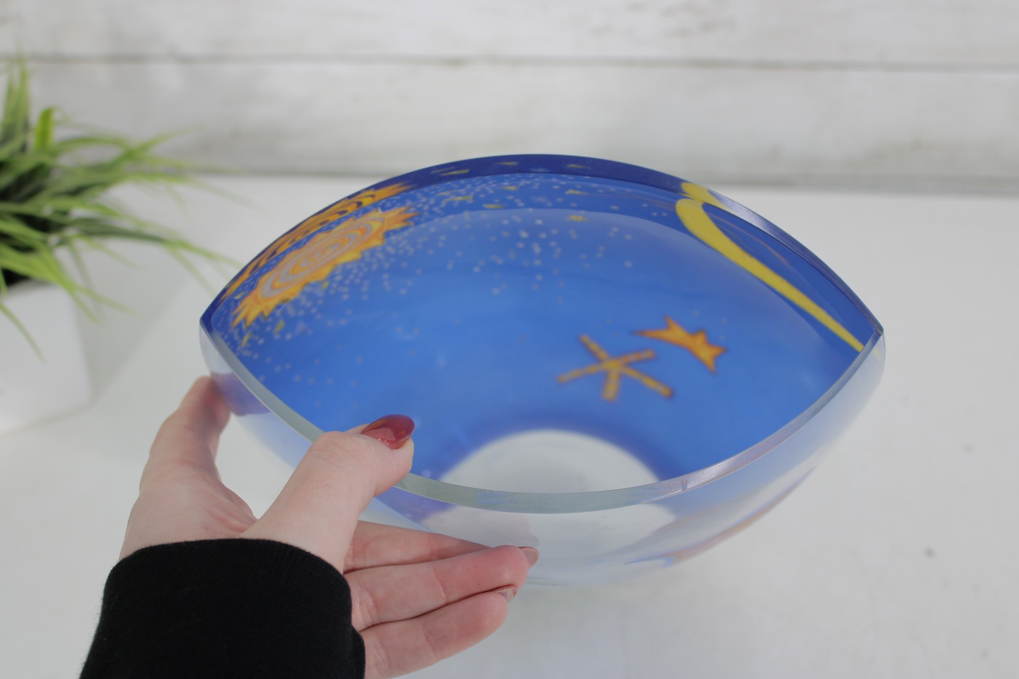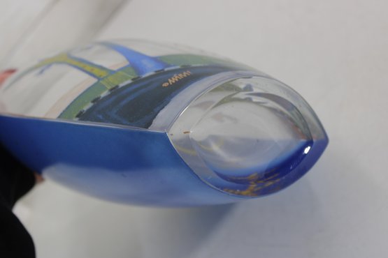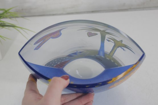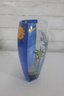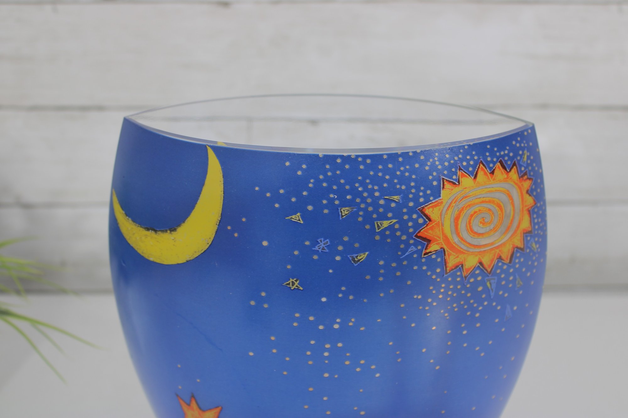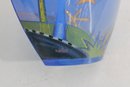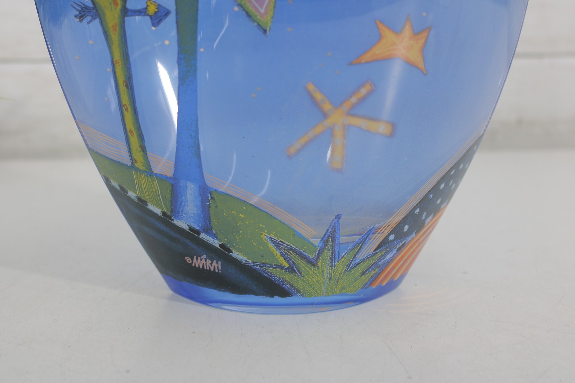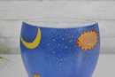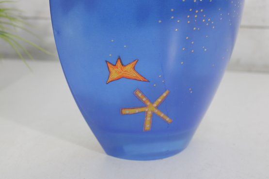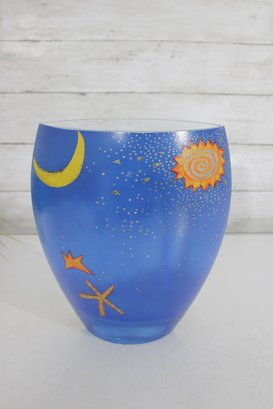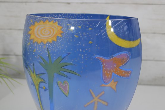 a stunning signed Mara art glass vase featuring a vibrant hand-painted celestial and tropical scene. This large decorative vase measures approximately 10 inches tall and 8 inches wide.