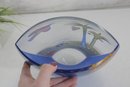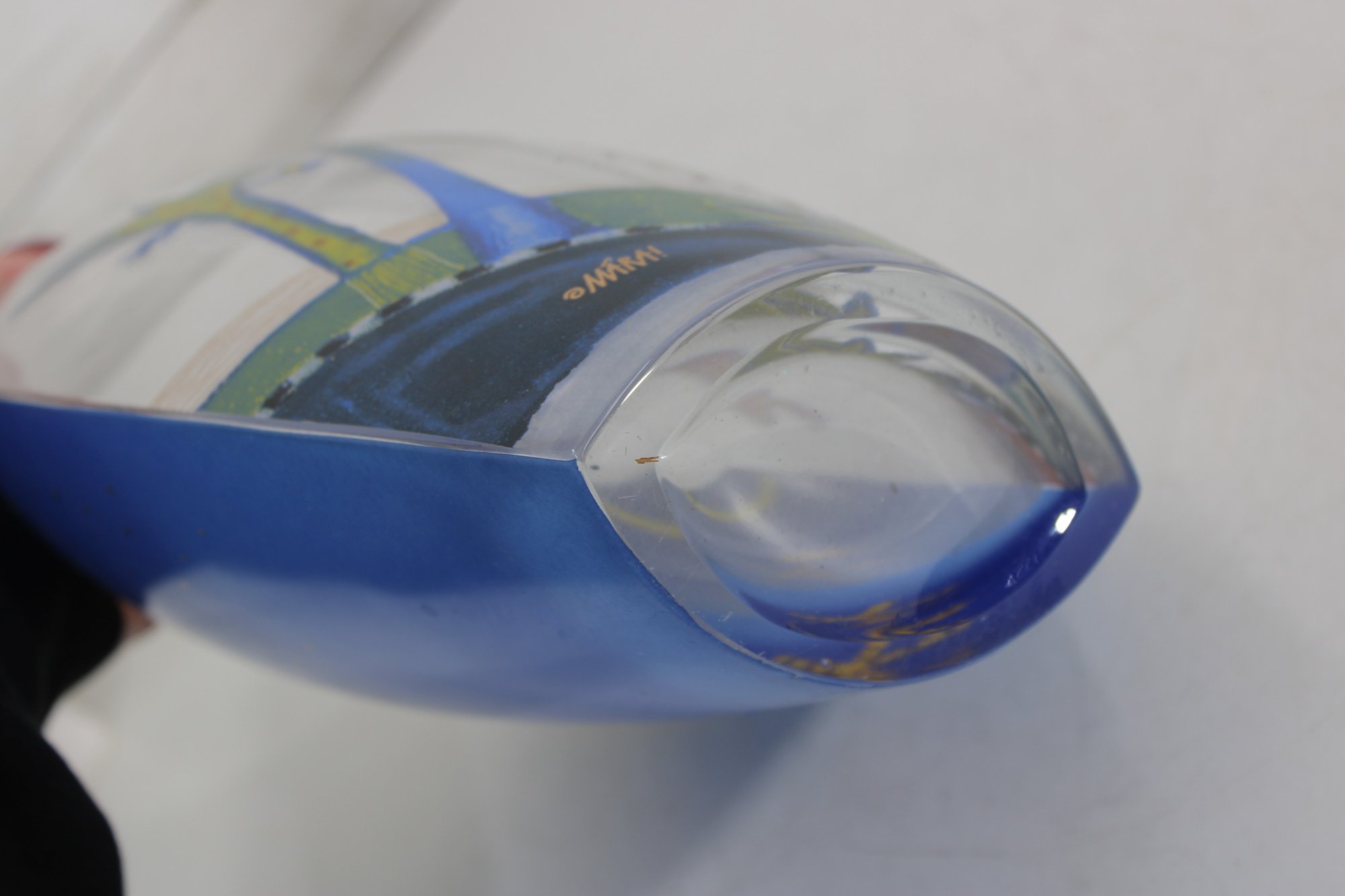 The piece is signed “Mara” near the base, as shown in the photos. The thick, clear glass body has a softly curved, modern silhouette with a polished base.