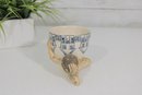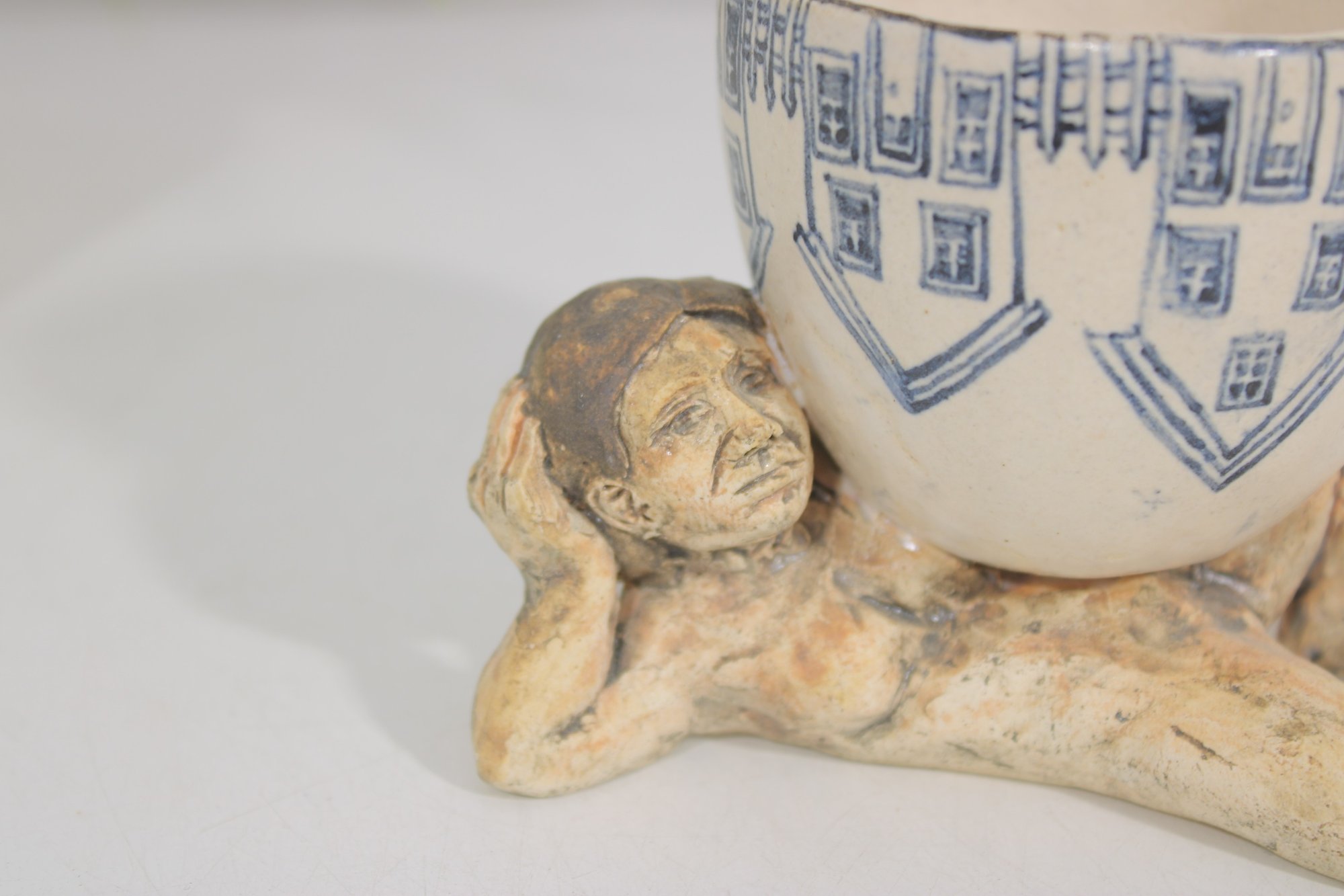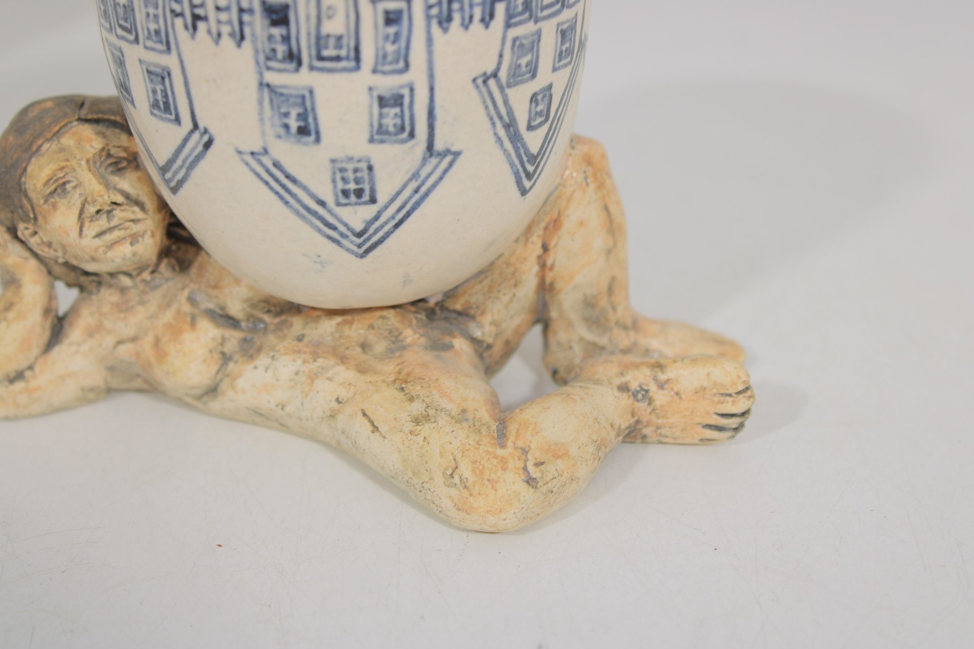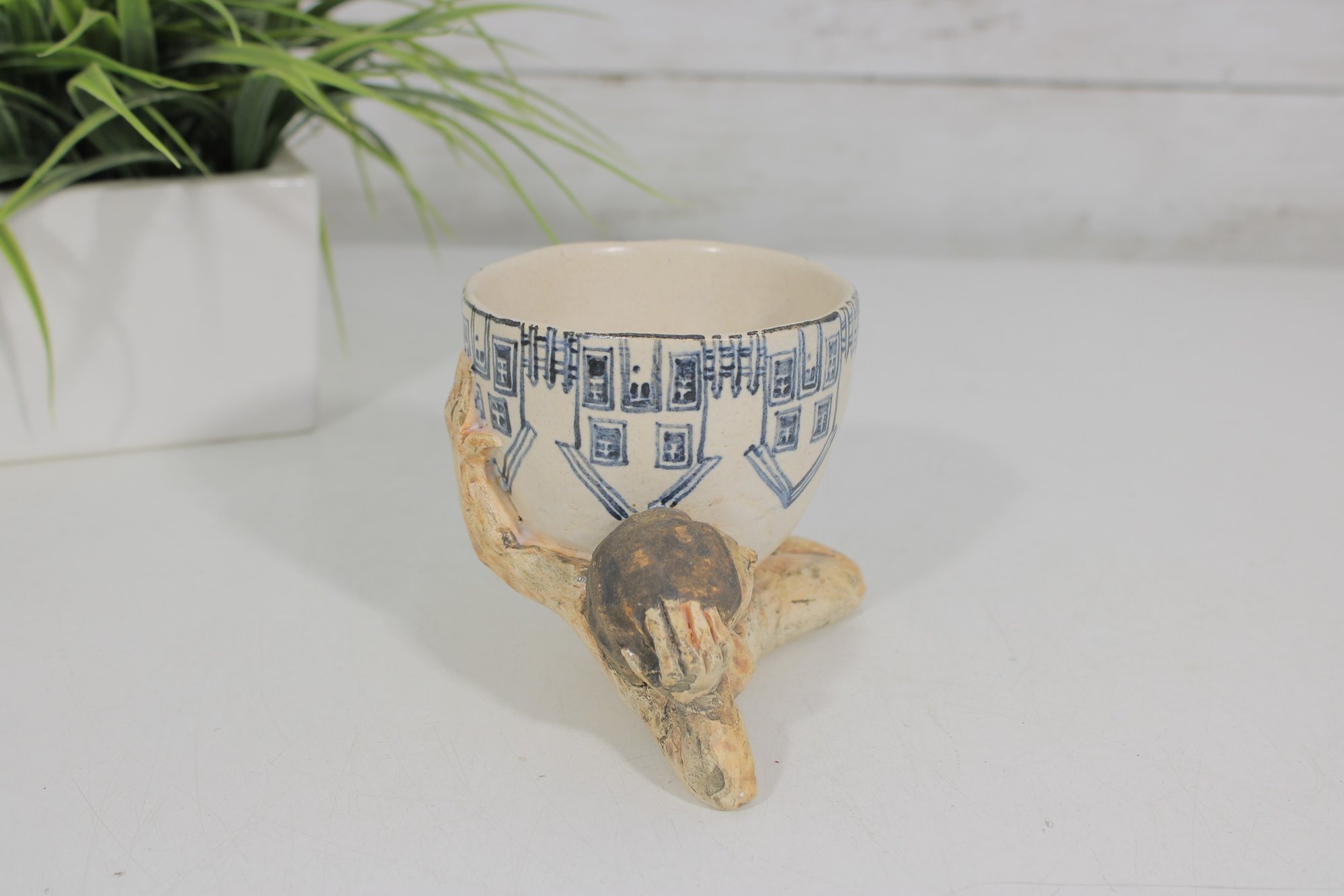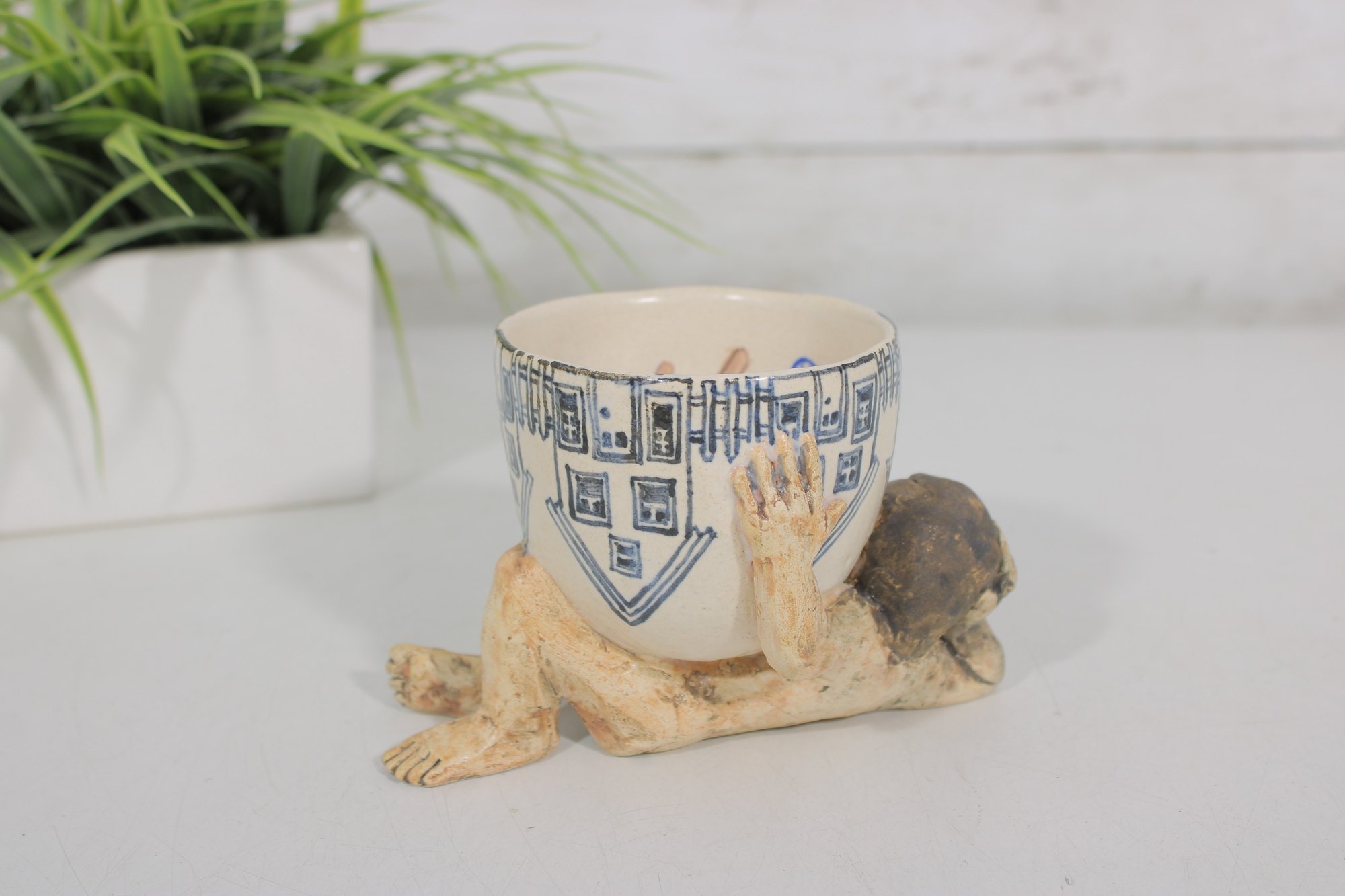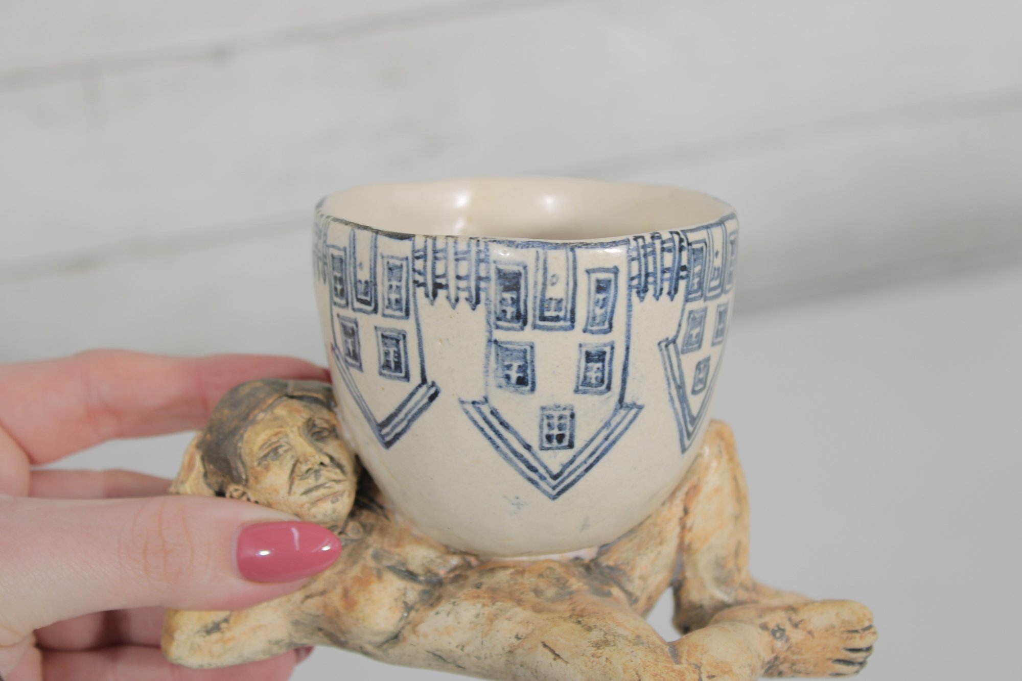 The ceramic cup features blue decorative illustrations including stylized furniture and household motifs, while the sculpted figure has a hand-finished surface with natural earthy tones and expressive facial detail. The underside of the sculpture is signed and dated "Marilyn Andrews 2008."