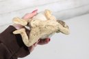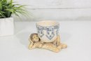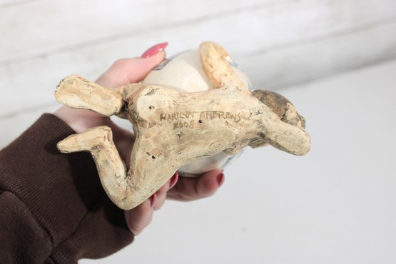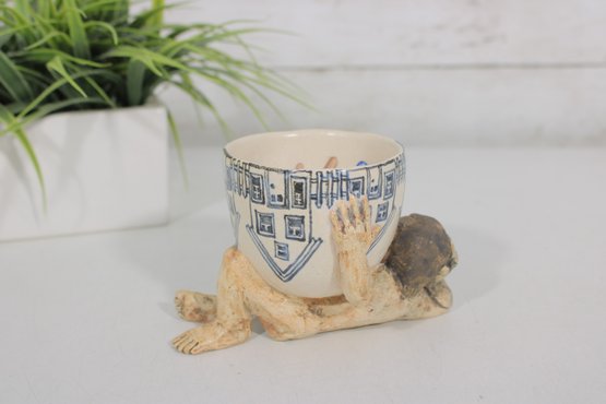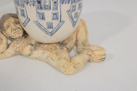 a unique signed folk art pottery piece by Marilyn Andrews (2008) featuring a whimsical reclining male figure supporting a small ceramic cup. The figure is sculpted in a relaxed pose, resting on one arm while holding the cup above him, creating a playful and artistic functional display.