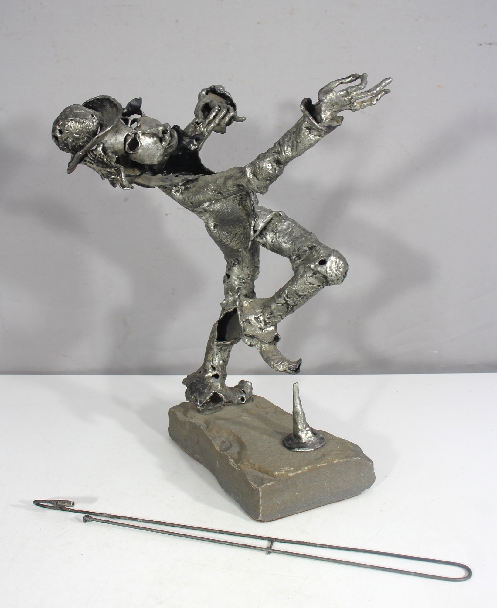 Handcrafted metal sculpture of a jazz musician, signed "Newman." Features a unique abstract design with a trombone and a textured metal surface. The trombone and one foot require repair. A fantastic restoration project for sculpture collectors.