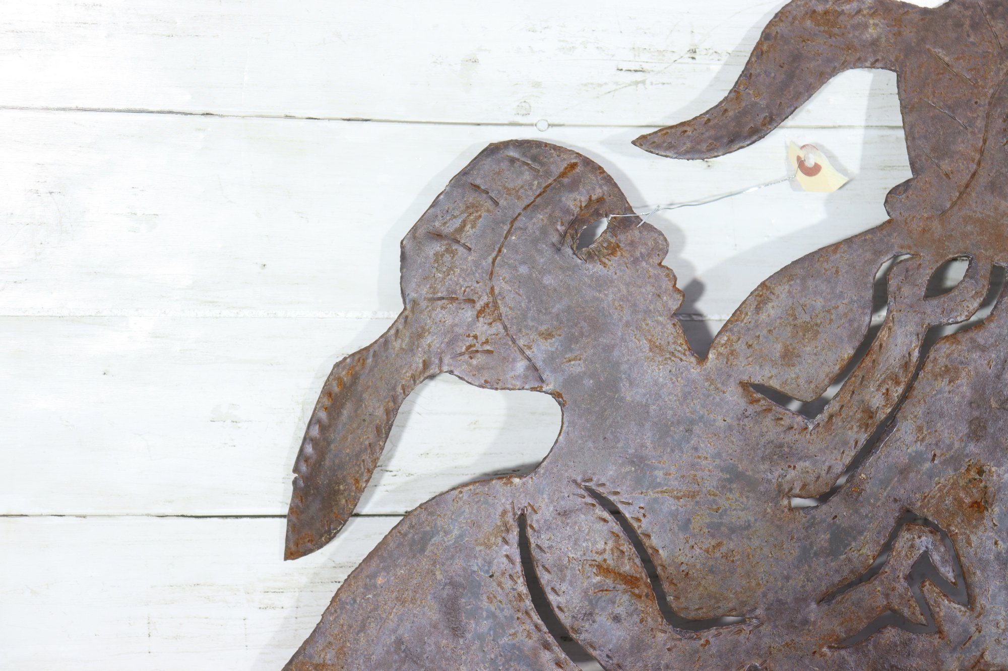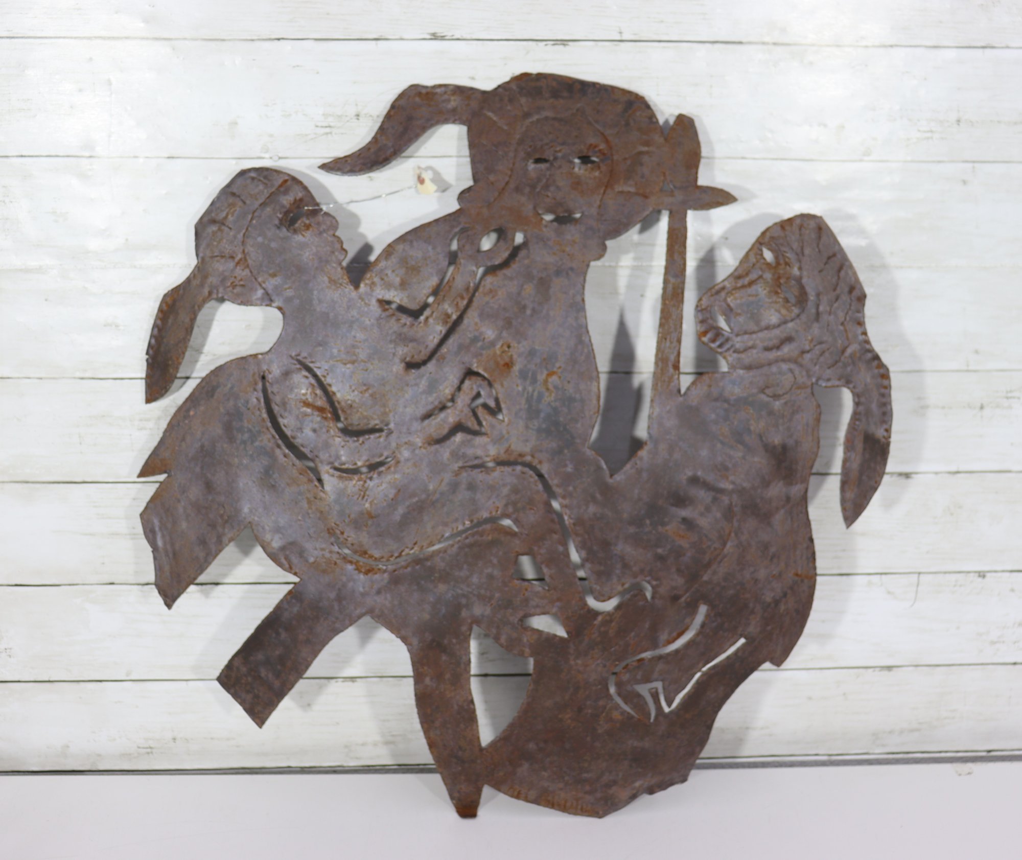 Measuring approximately 23 inches high by 23 inches wide, this artwork has substantial presence and works well as a statement wall piece in rustic, industrial, modern, or eclectic interiors. The artist’s signature is visible on the metal, adding collectible appeal.