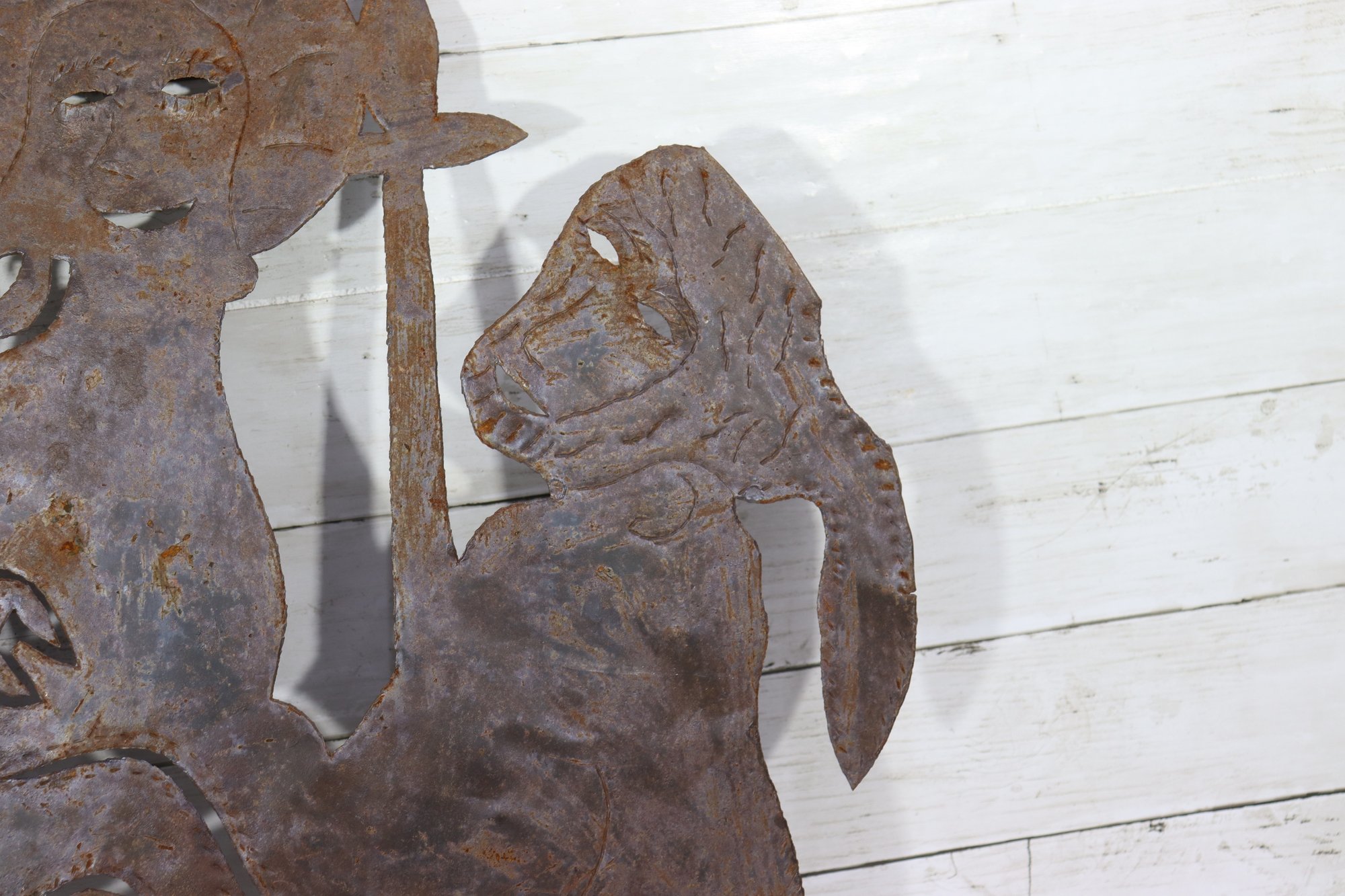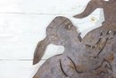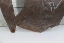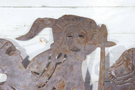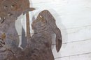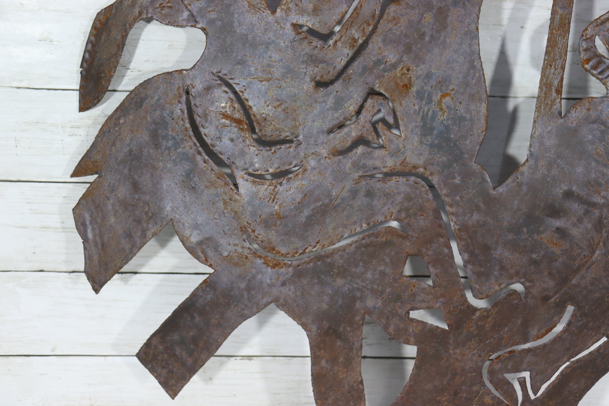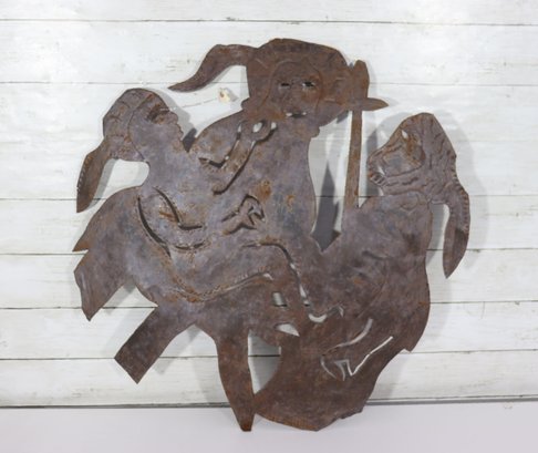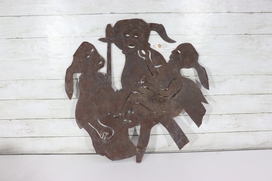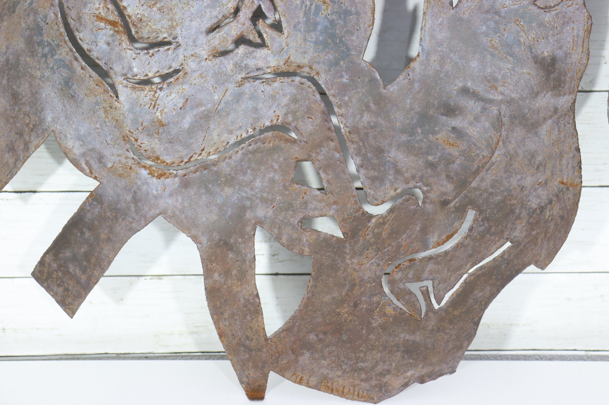 Signed metal wall art sculpture, featuring a bold figural composition cut from sheet metal. The piece displays expressive line work and layered forms, enhanced by a naturally aged rusted patina that adds depth, texture, and character.