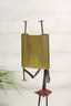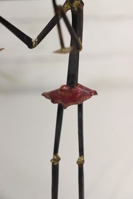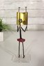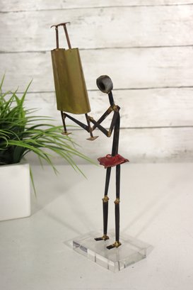 Vintage Mid Century Modern metal art sculpture featuring a stylized abstract figure holding up a brass easel / board. The piece is constructed from welded metal rods with brass & gold tone accents, and mounted on a clear acrylic base. Very unique artisan crafted design with great form & character.