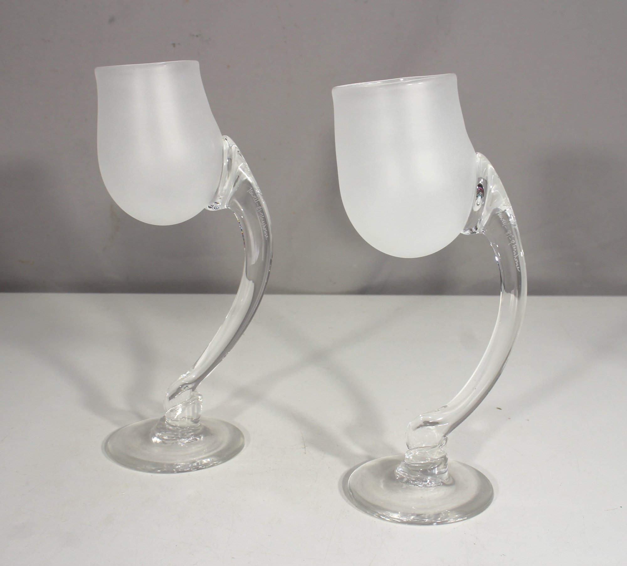Striking and sculptural, this pair of signed handblown glass goblets showcases masterful artistry with a unique twisted stem design. Each piece stands 10 inches tall, featuring a frosted bowl and crystal-clear base and stem, signed and dated on the arm. The fluid, organic curves evoke a sense of movement and elegance, perfect for collectors of contemporary glass or modernist tableware.