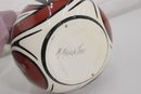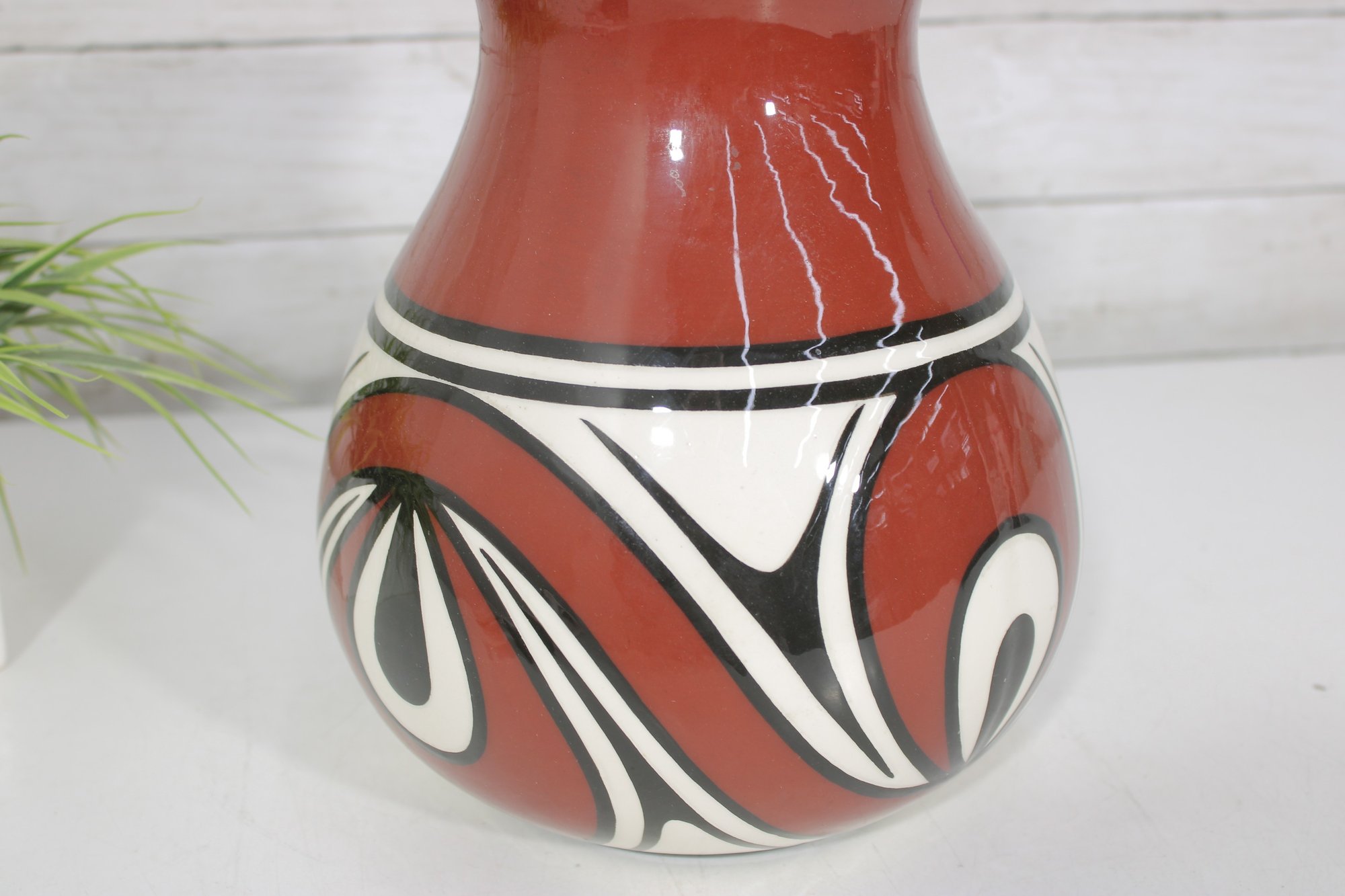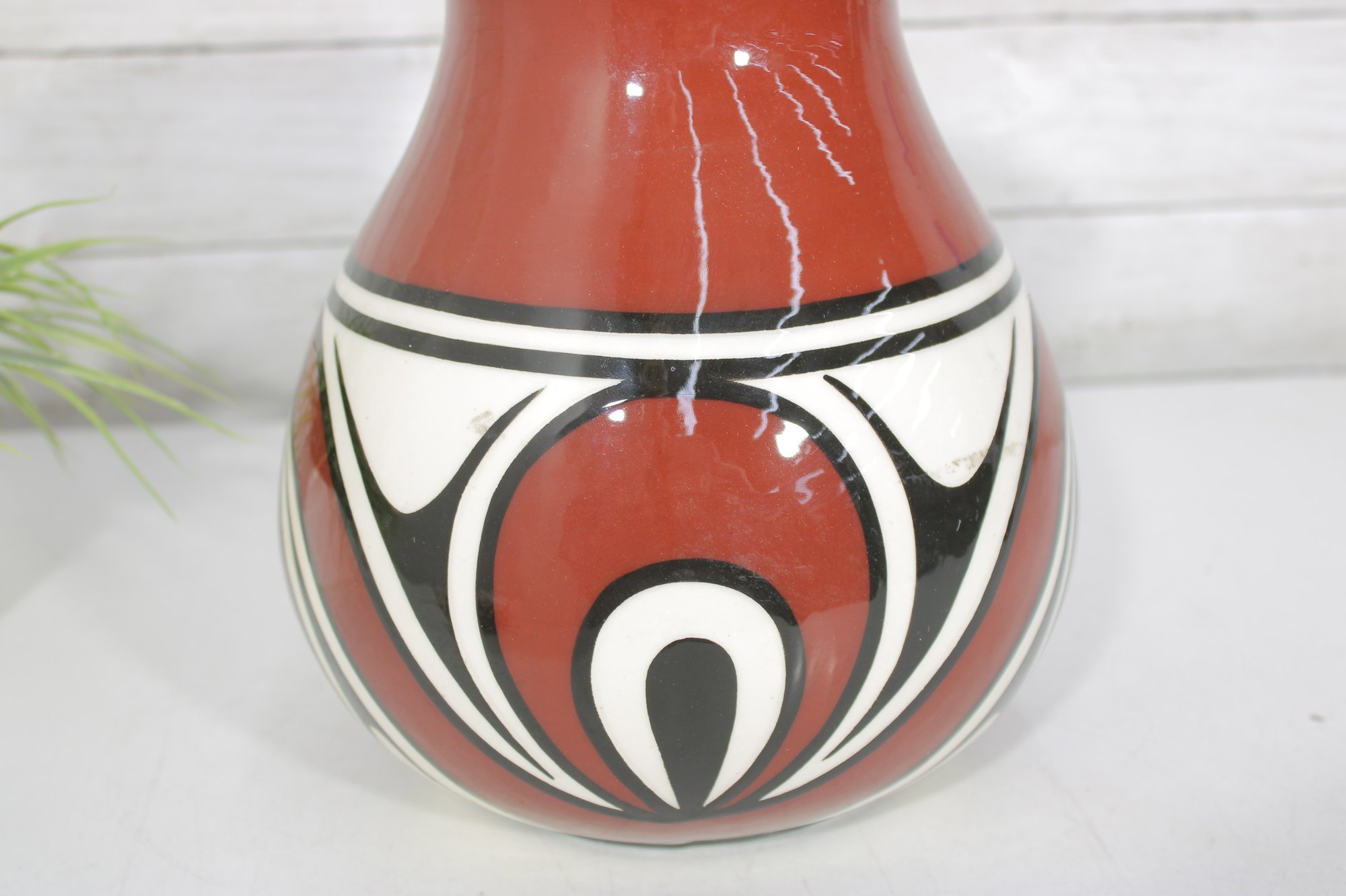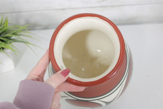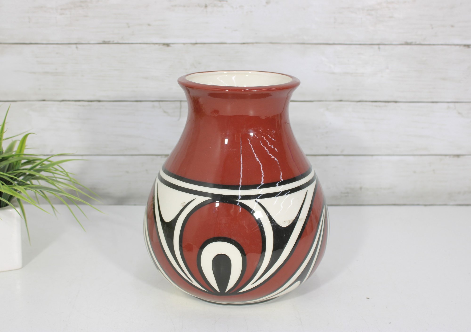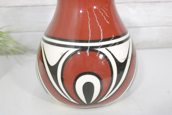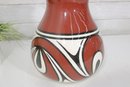 signed Native American vase featuring bold red, black, and white geometric designs. The vase has a classic rounded form with a narrow neck and showcases traditional Southwest-inspired motifs with flowing curves and symmetrical patterns.
