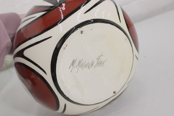 The underside is signed by the artist (appears to read M. Nighthawk, please review photos for exact signature). The hand-painted decoration and strong graphic design give the piece a distinctive presence, making it a beautiful display item for collectors of Native American or Southwest pottery.