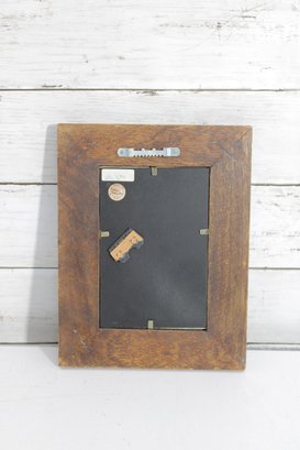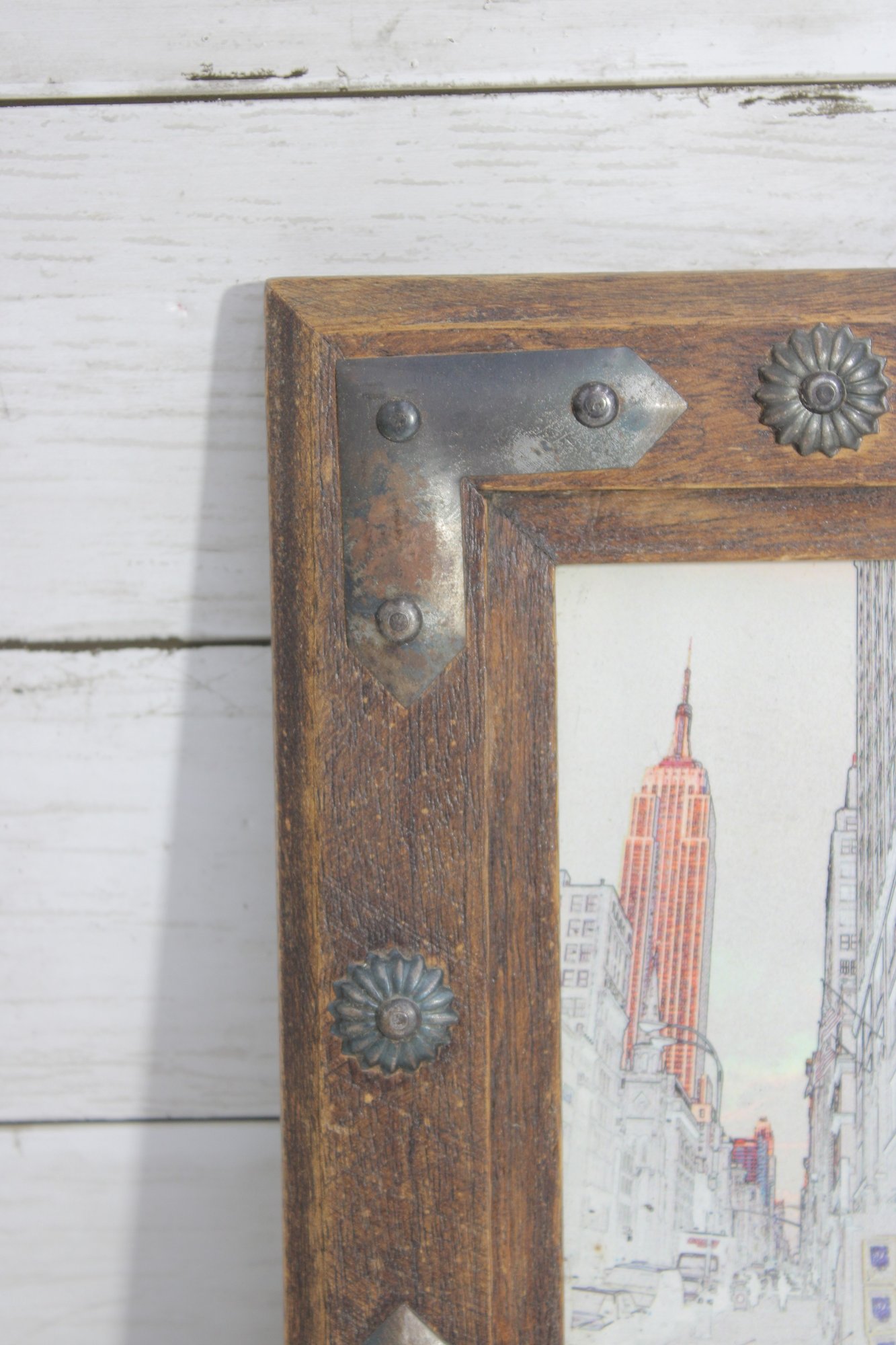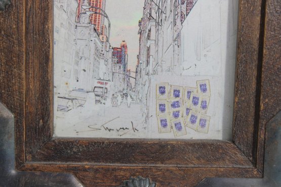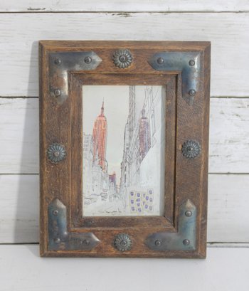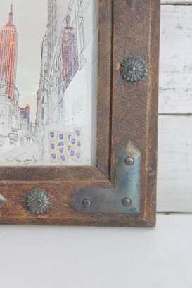 The perspective draws the viewer down the street between tall buildings, evoking the classic feel of Manhattan city life. The artwork is presented in a distinctive rustic wood frame with decorative metal accents, adding character and complementing the urban theme.