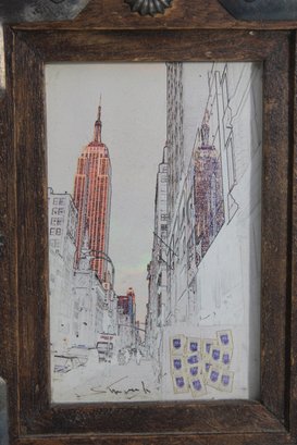 Charming signed artwork depicting a New York City street scene, featuring a stylized view of skyscrapers and urban architecture. The composition captures the energy of the city with loose sketch lines and subtle color accents, including warm tones highlighting one of the iconic buildings.