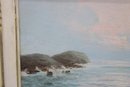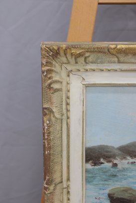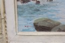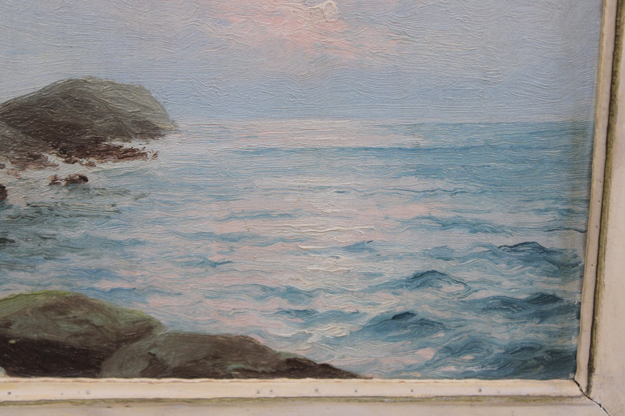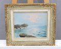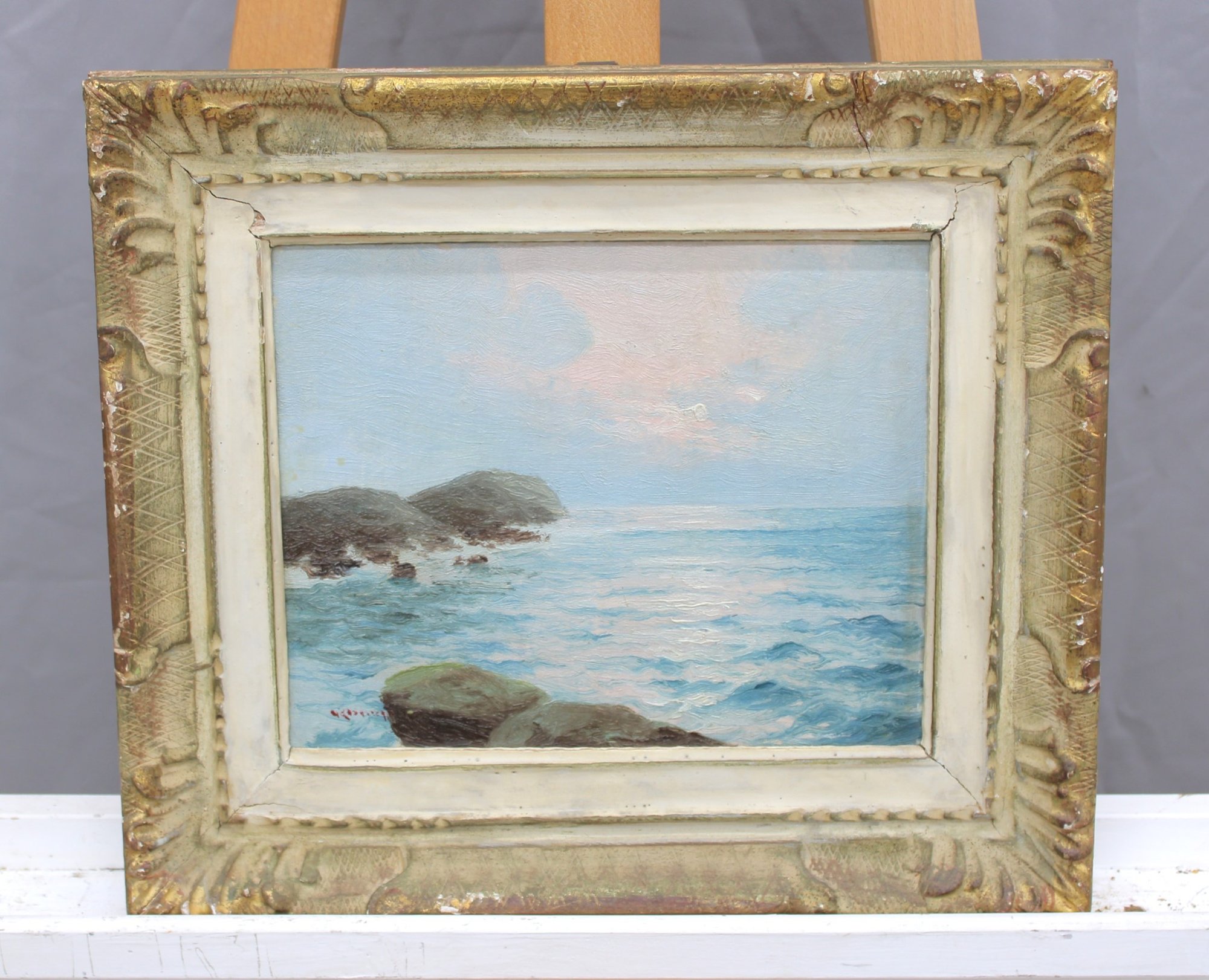 an original signed oil on board seascape painting, depicting a tranquil coastal view with rocky shoreline and calm ocean waters beneath a softly colored sky. The composition is delicately rendered with subtle brushwork and a soothing palette of blues and pastels, creating a peaceful maritime atmosphere.