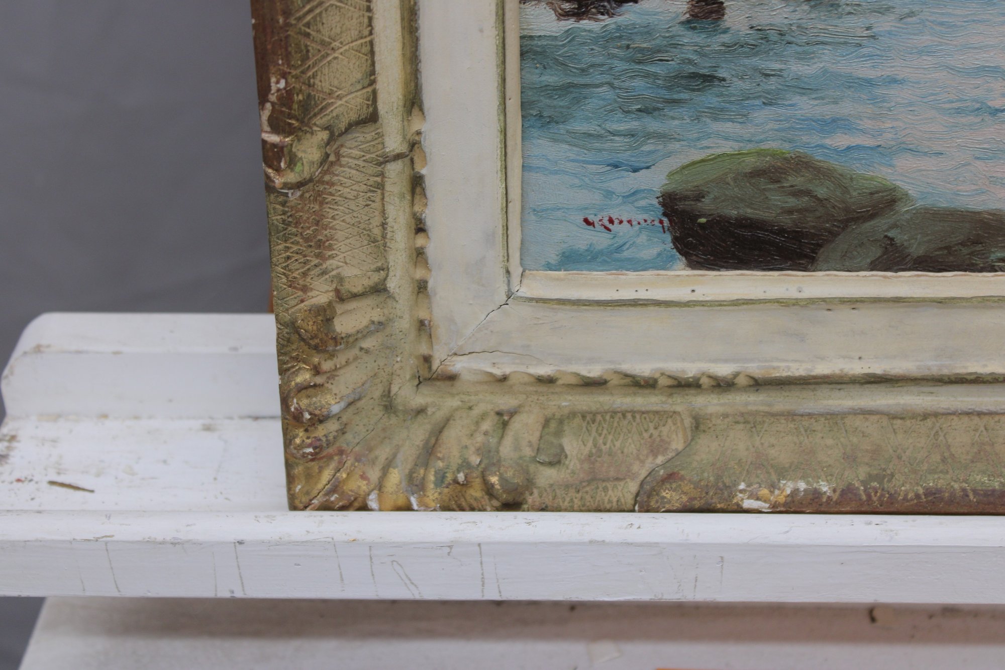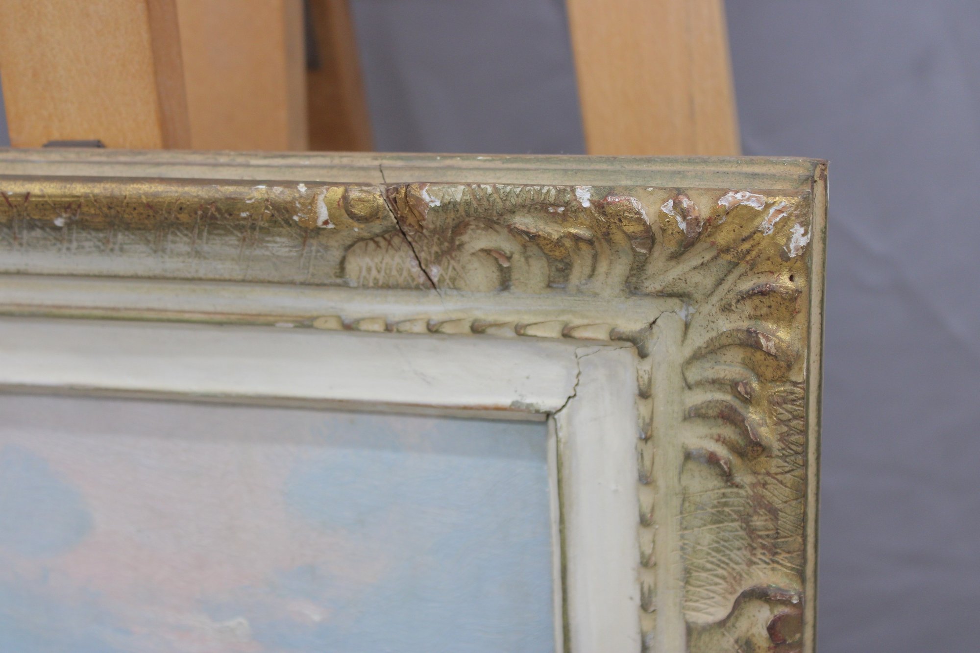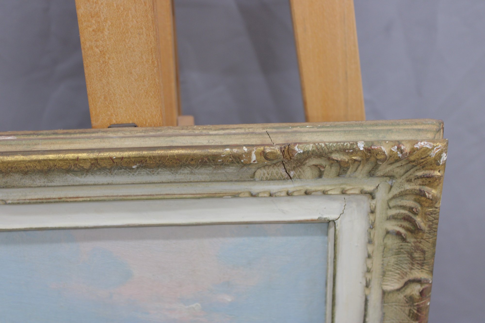 The painting is signed at the lower left (signature visible; artist attribution unverified) and is housed in a decorative gilt wood frame with molded detailing that enhances the classic presentation of the piece.