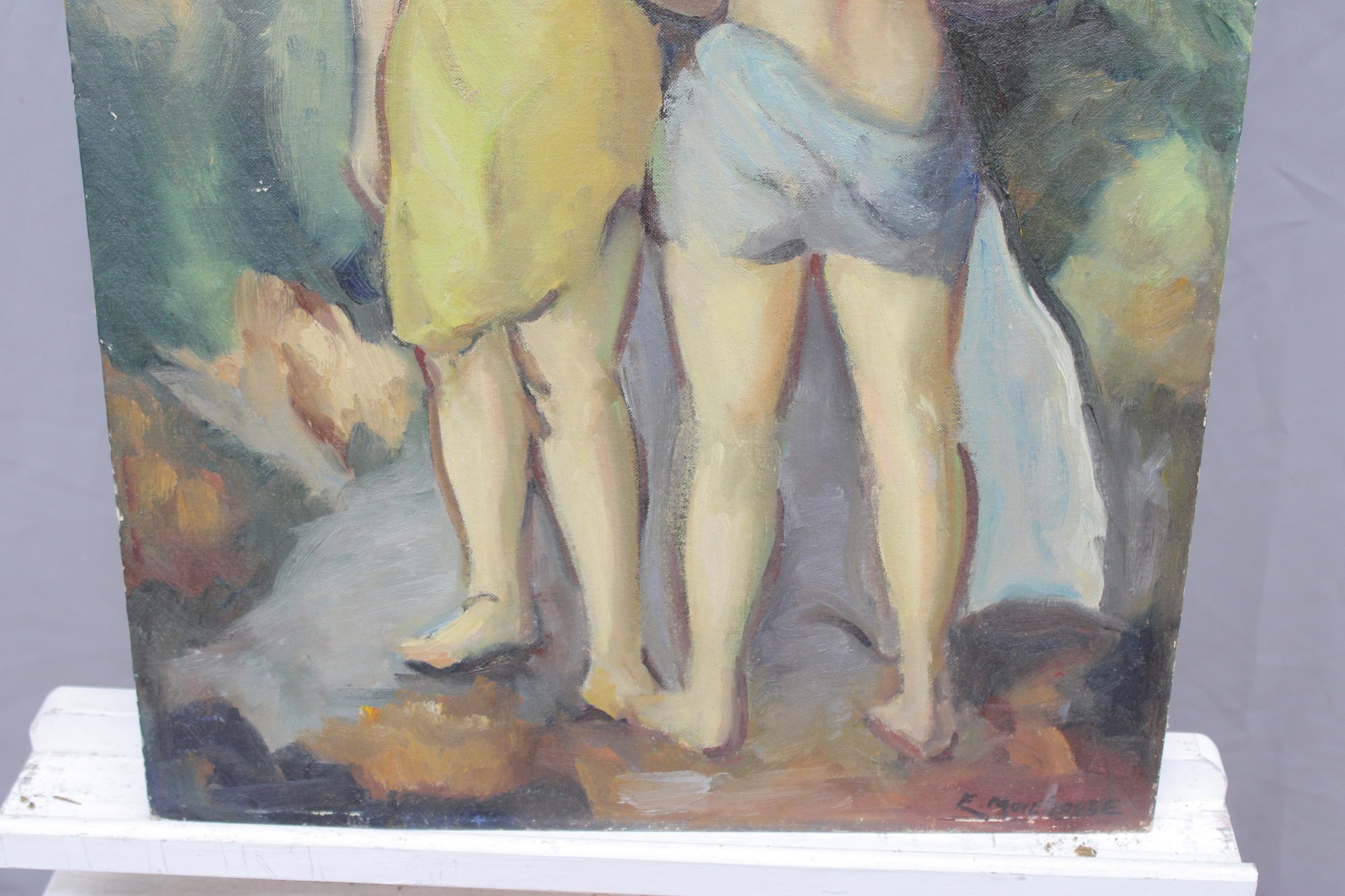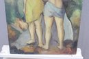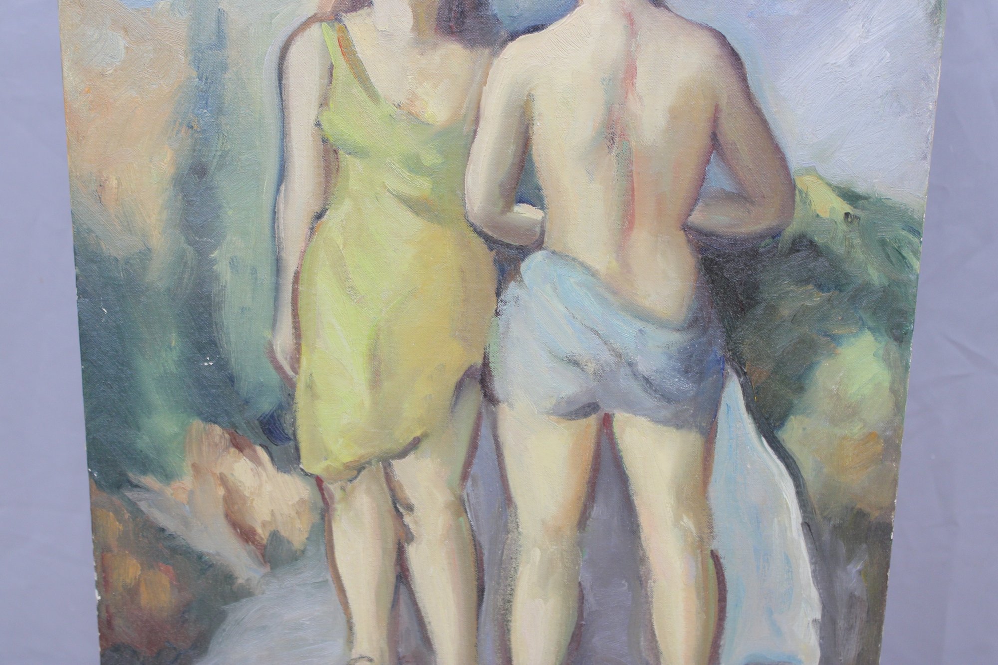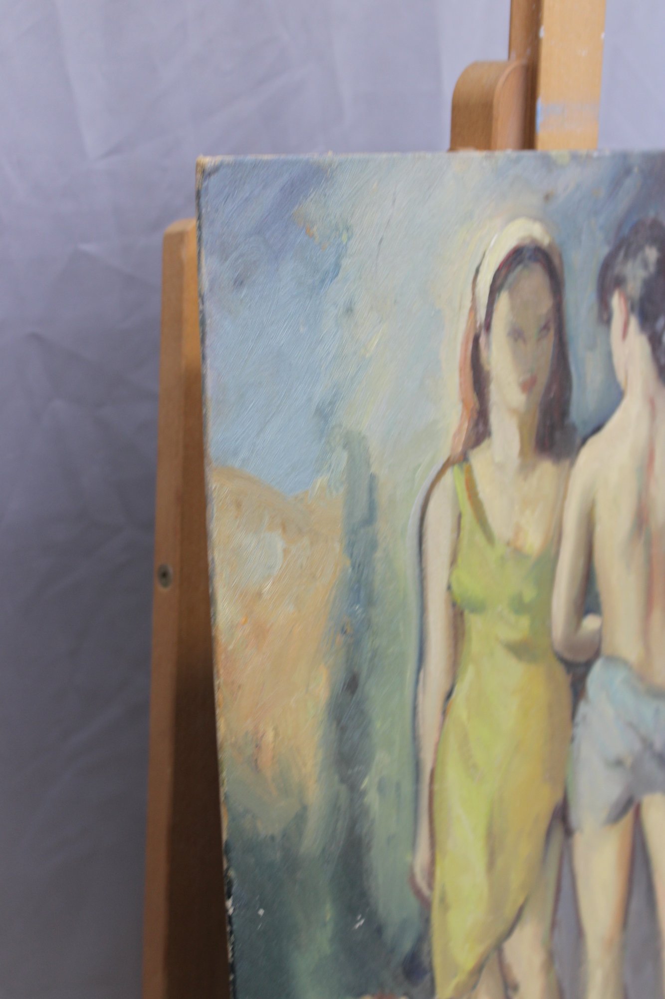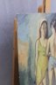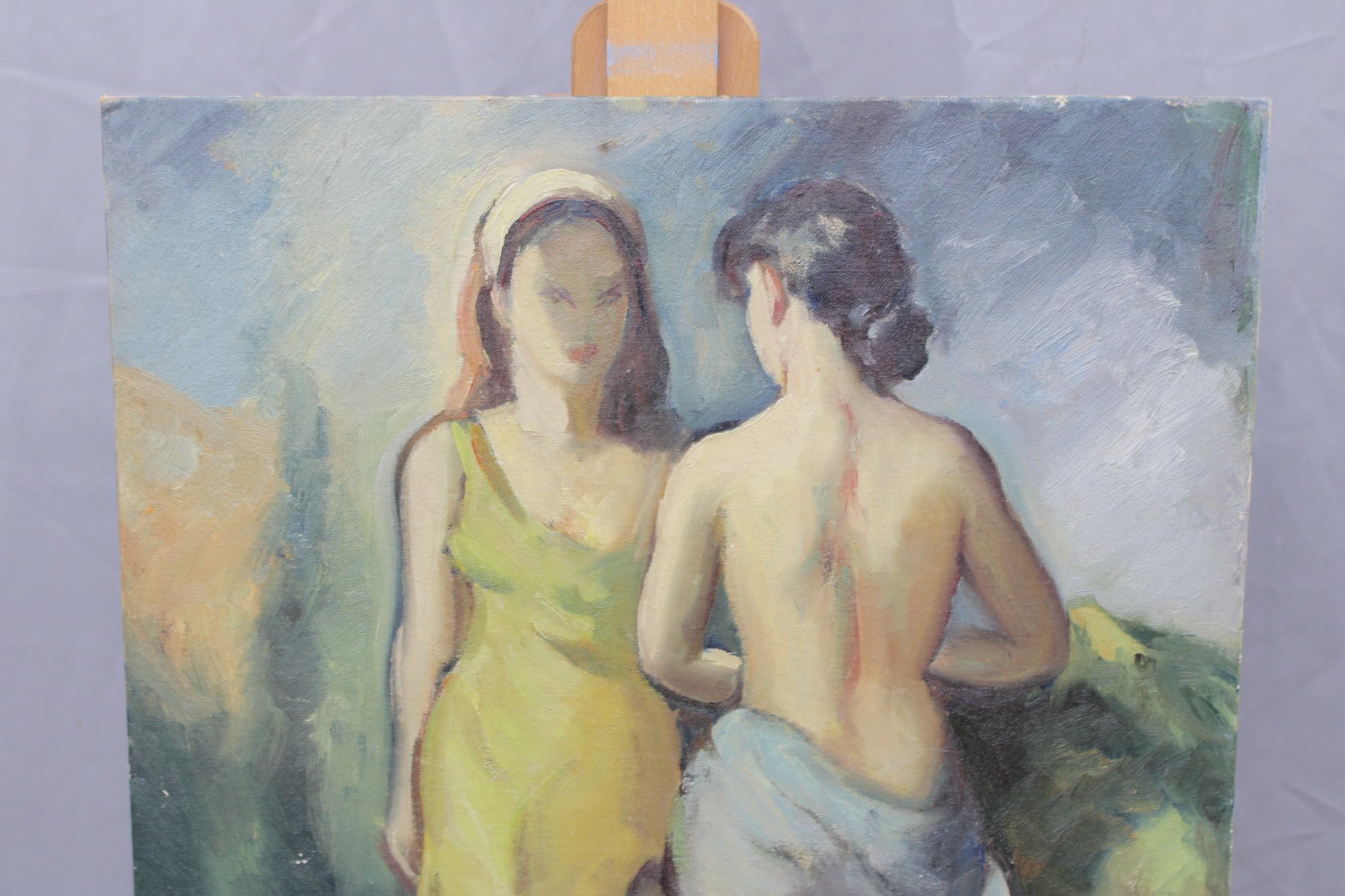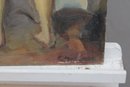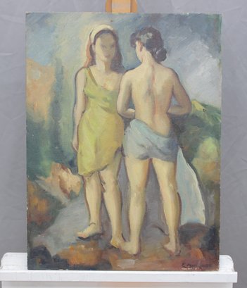 an original signed oil on board figurative painting, depicting two standing figures rendered in a loose, expressive style. The composition features soft, blended colors and confident brushwork, with a modernist influence and an emphasis on form, posture, and mood rather than fine detail.