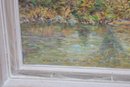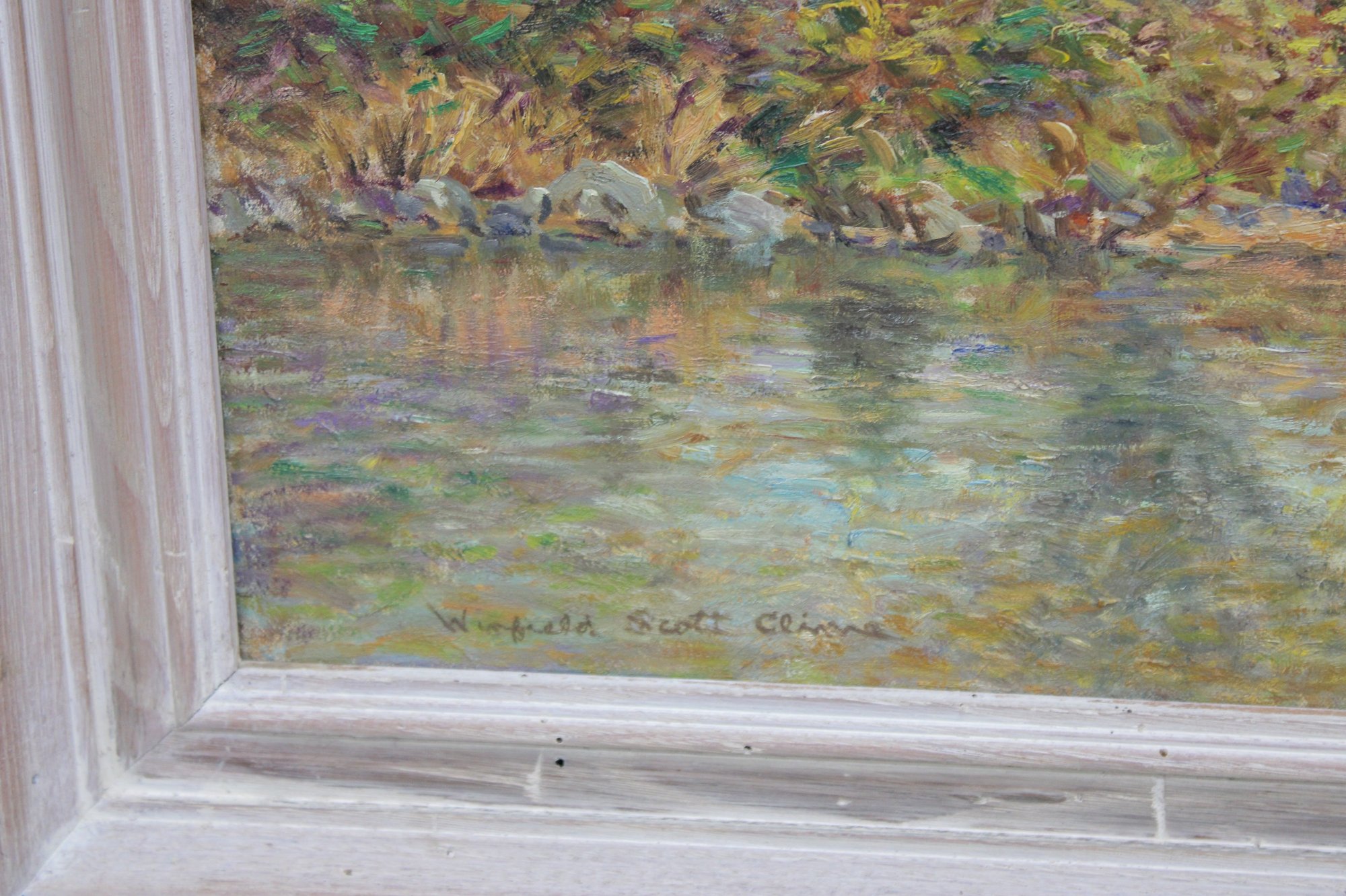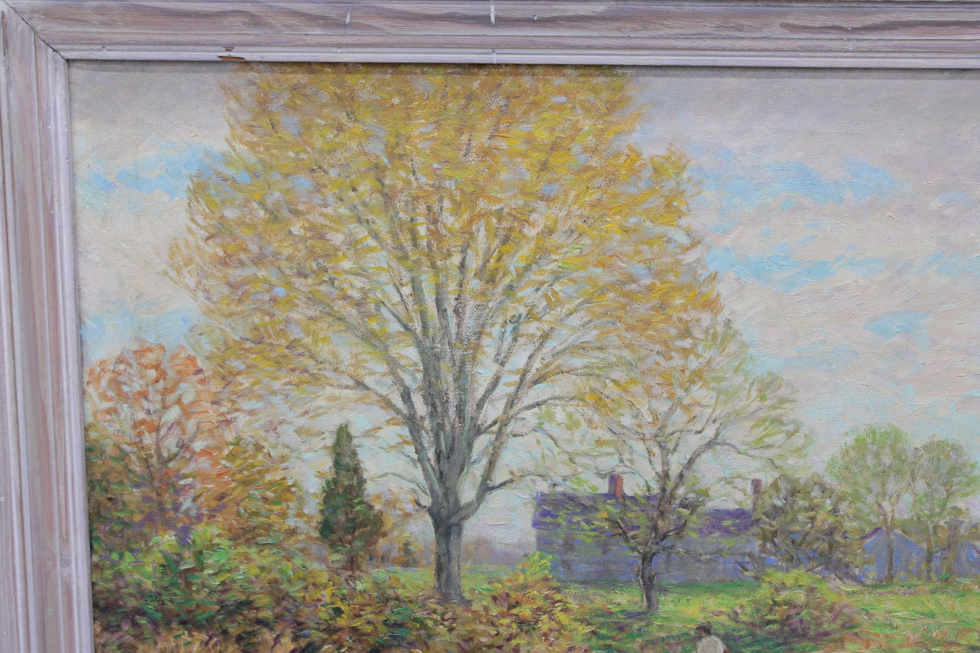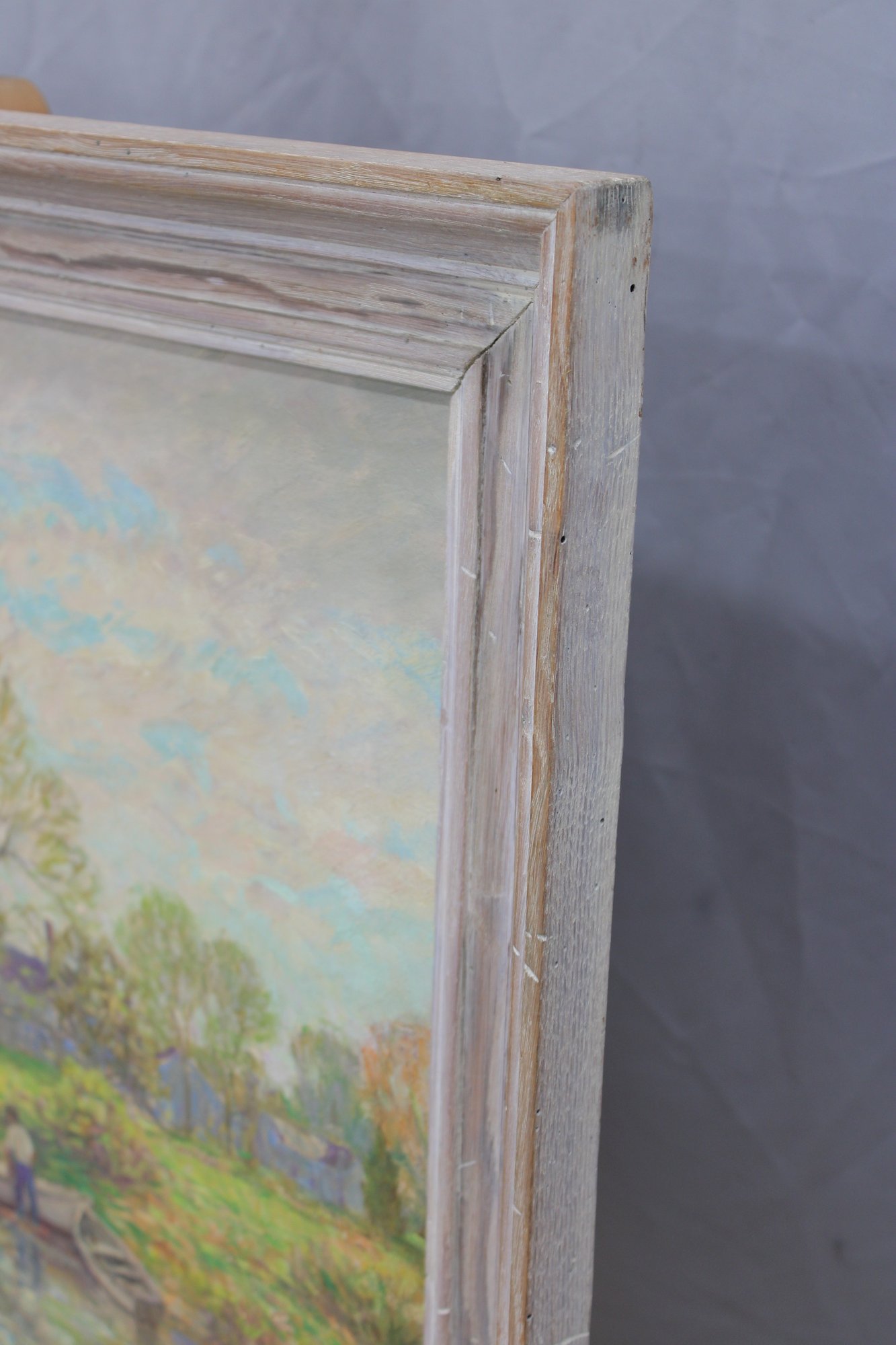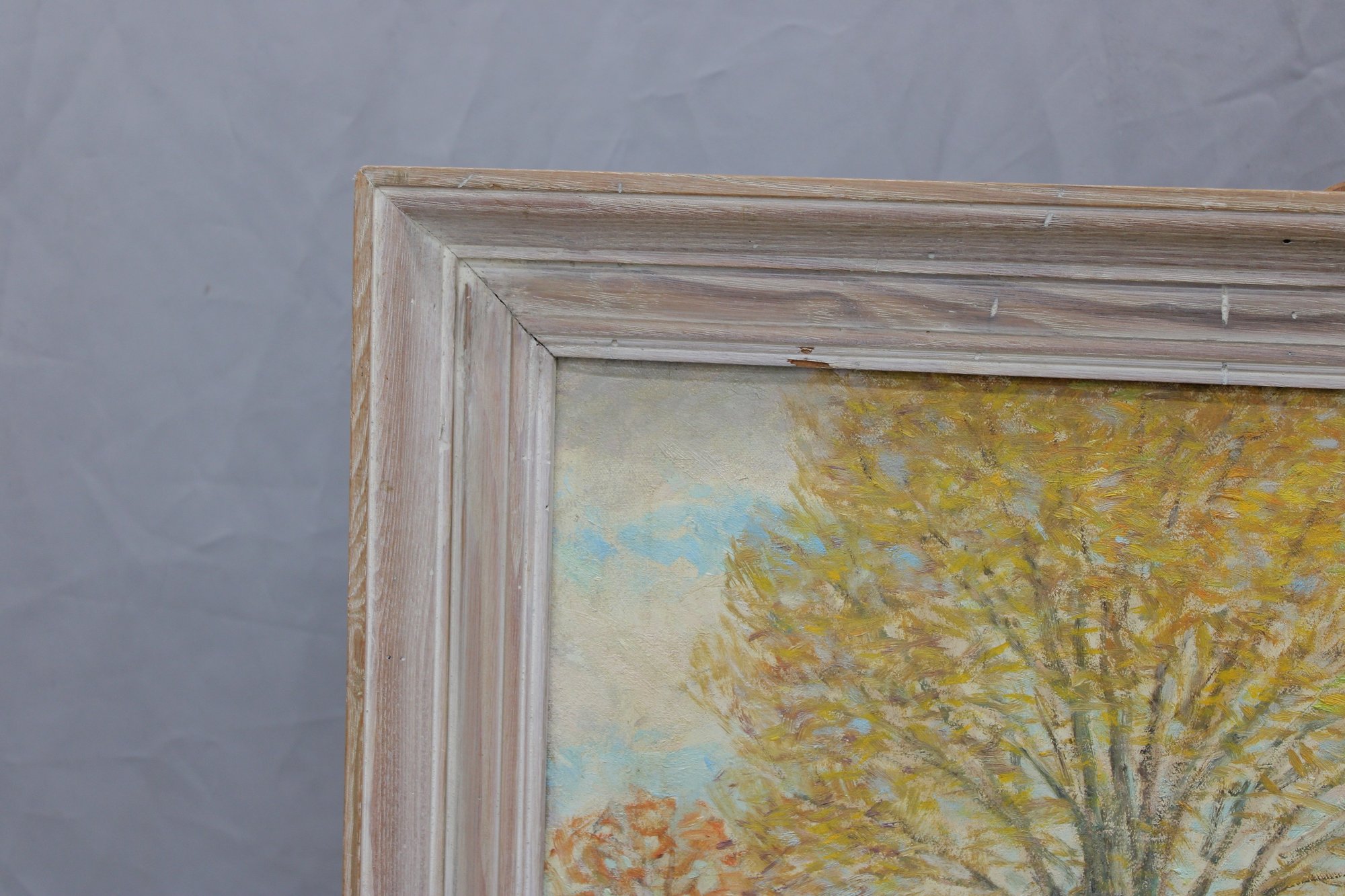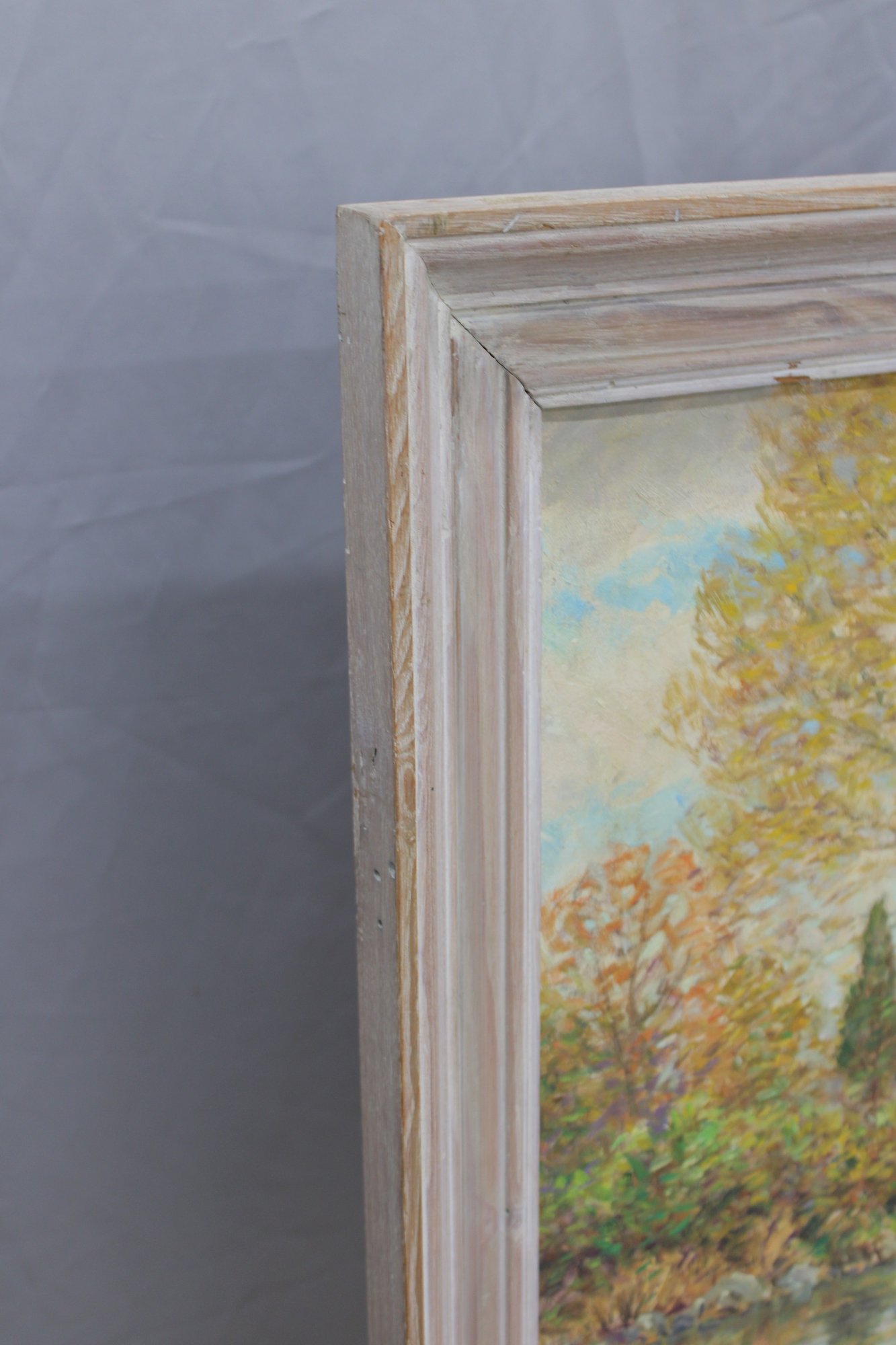 The painting is signed on the front (see close-up photos) and is housed in a painted wood frame with a gently distressed finish that complements the artwork without overpowering it.