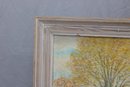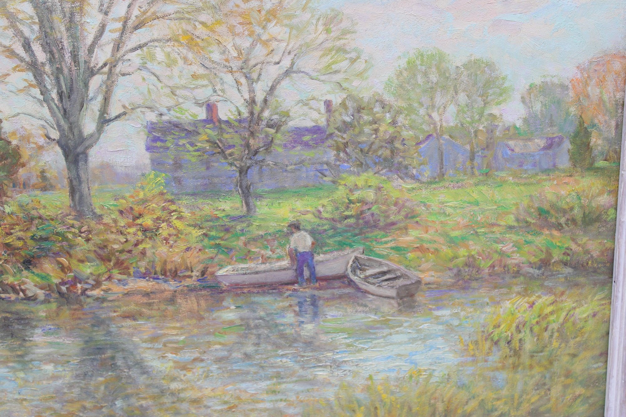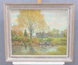 a signed original oil painting on canvas titled “Autumn in Lyme.” The scene captures a tranquil autumn landscape with golden foliage, reflective water, and a small figure by a boat, rendered in soft, impressionistic brushwork and a warm seasonal palette.
