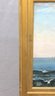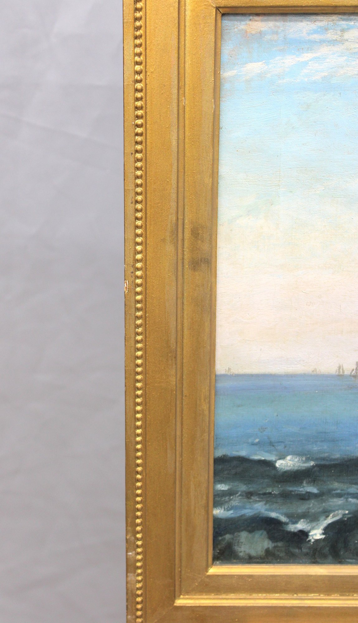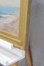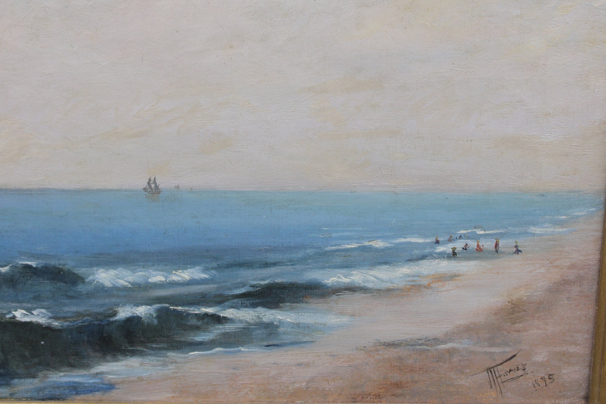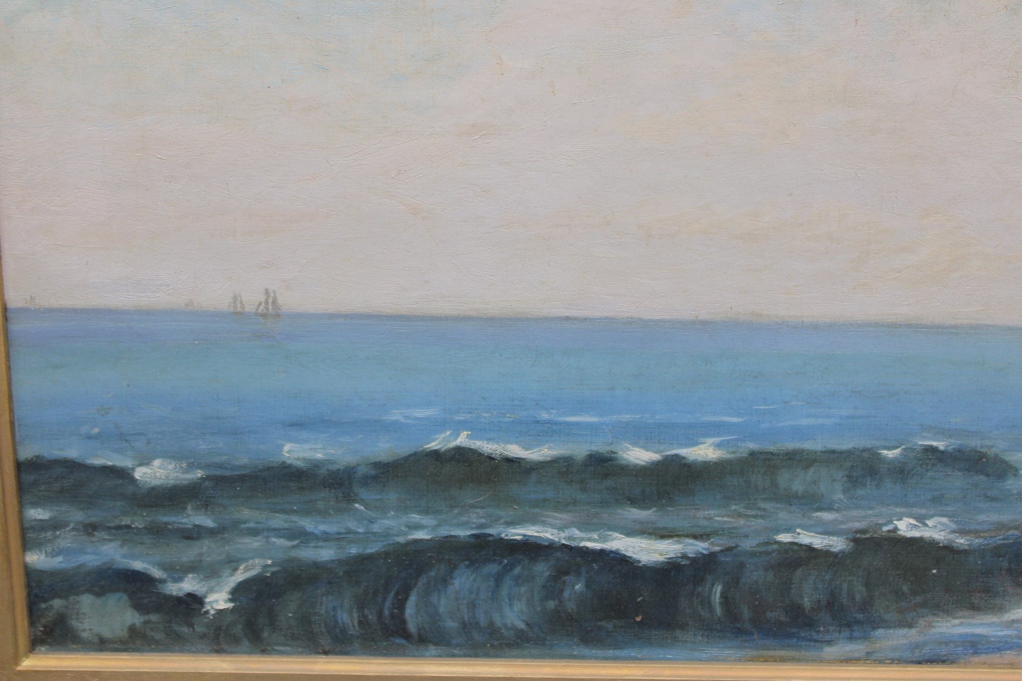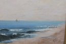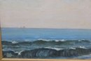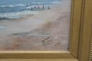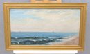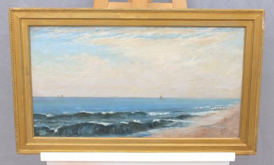 an original signed oil on canvas seascape, depicting a panoramic coastal shoreline with rolling waves, distant sailboats on the horizon, and figures gathered along the water’s edge. The composition captures movement and atmosphere through layered blues, soft sky tones, and textured surf, creating a lively yet balanced seaside scene.