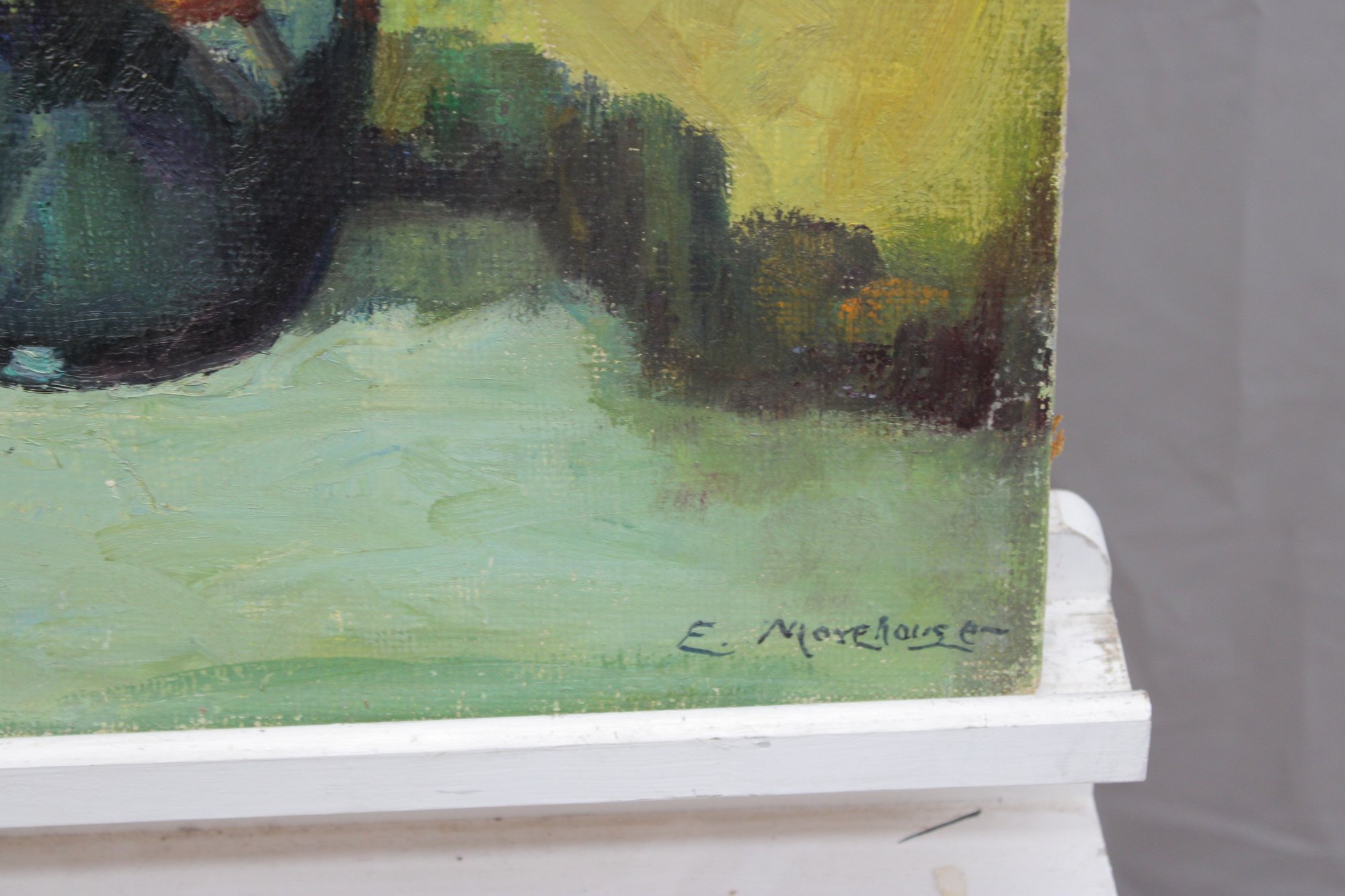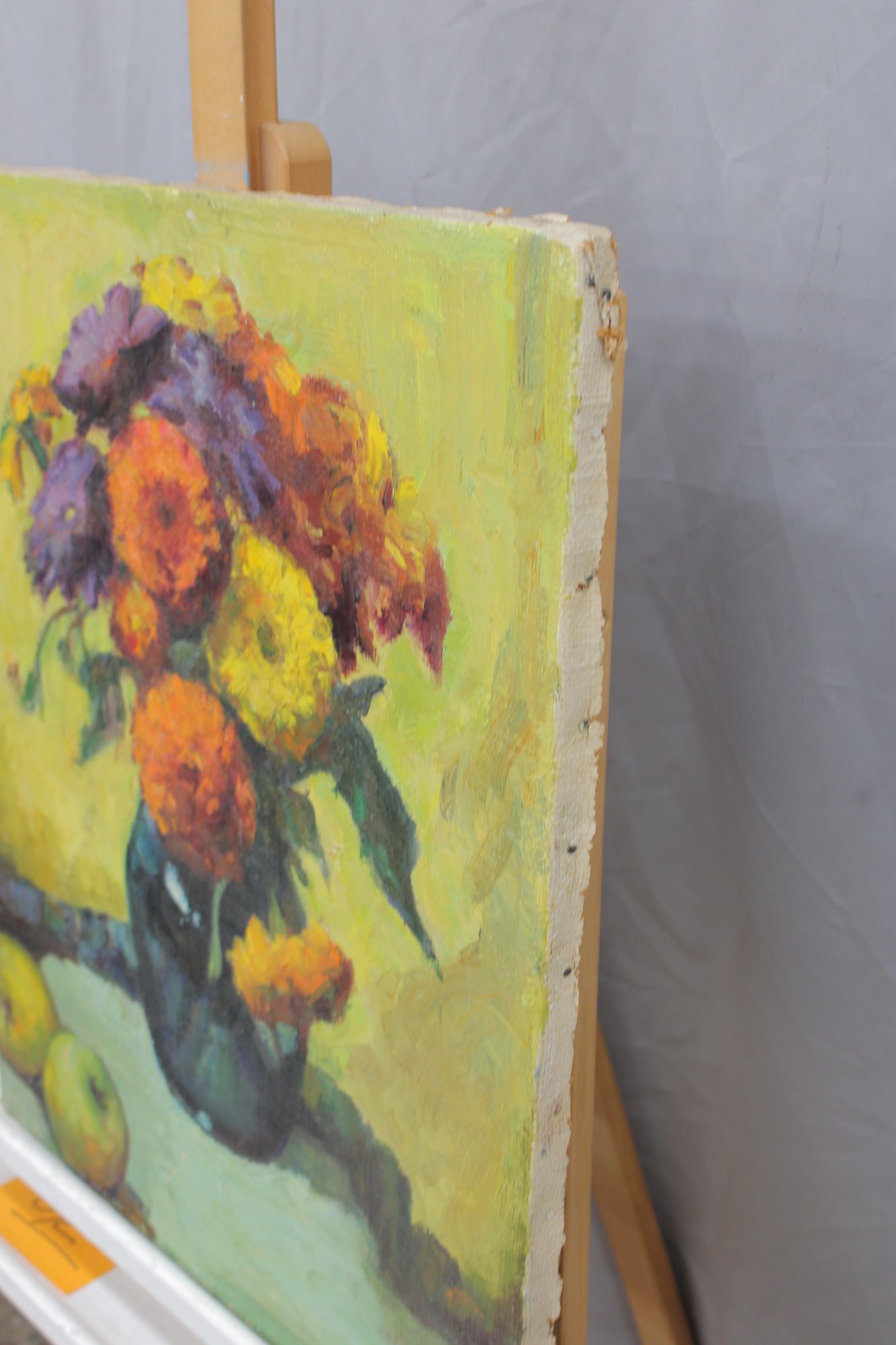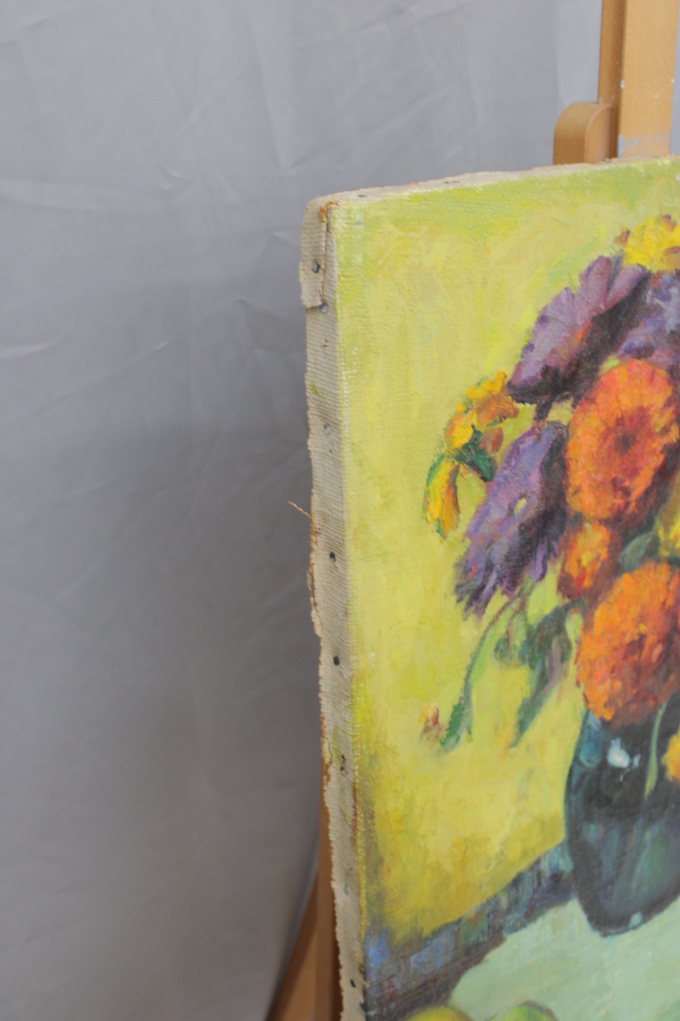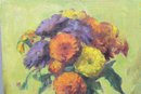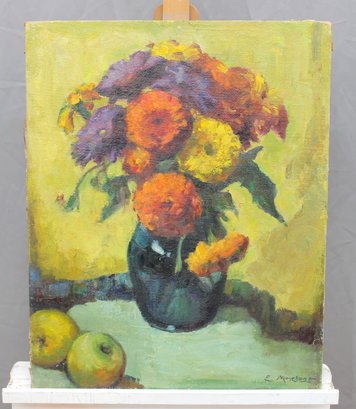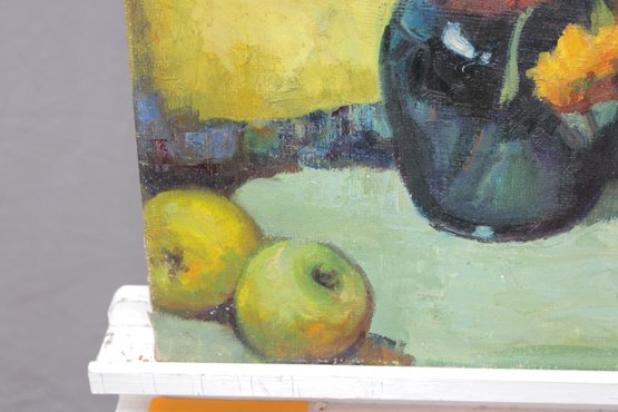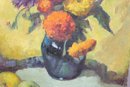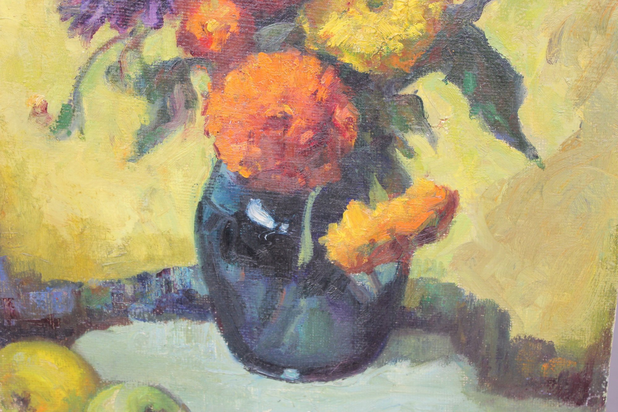 signed oil on canvas still life painting depicting a vibrant bouquet of flowers arranged in a dark vase, accompanied by fruit in the foreground. Executed in a bold, Impressionist-influenced style, the artist employs rich color, energetic brushwork, and thickly applied paint to create a lively and expressive composition.