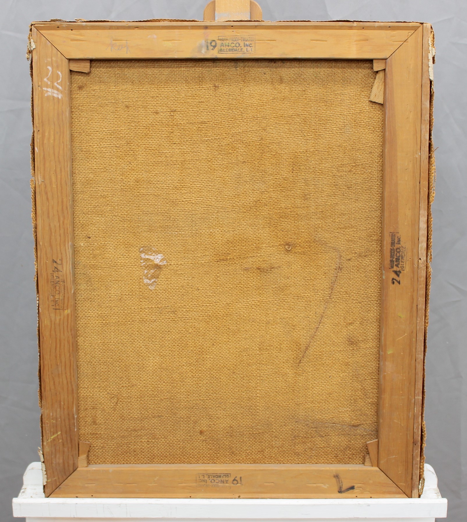 The warm yellow ground enhances the saturated oranges, purples, and greens of the floral arrangement, giving the work a strong visual presence. The painting is signed in the lower right, and the confident handling of color and texture suggests a mid- to late-20th-century modern aesthetic.