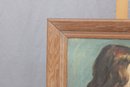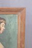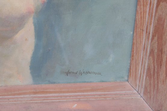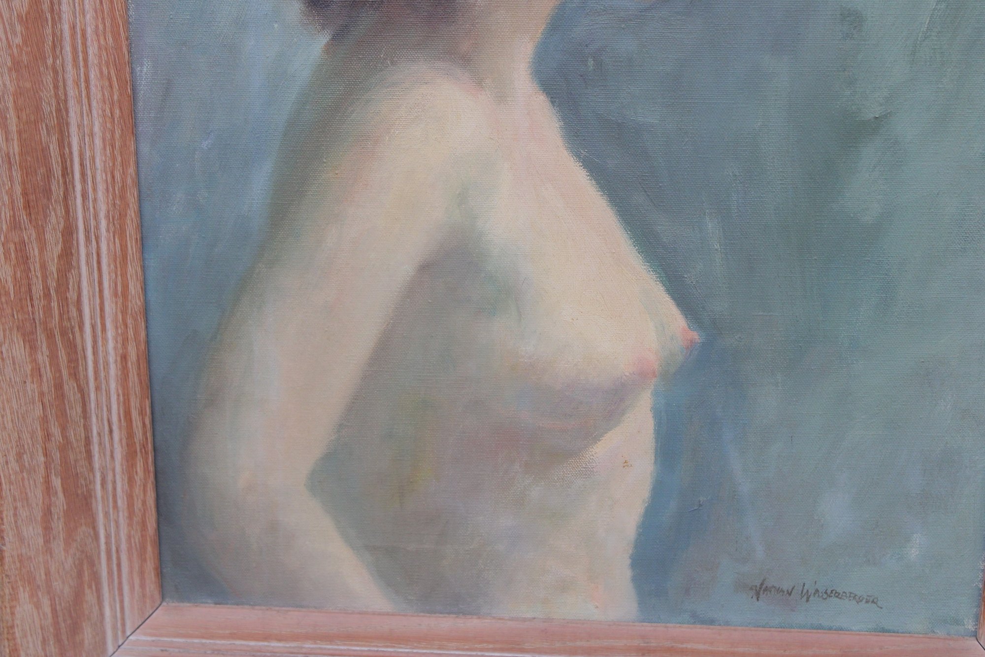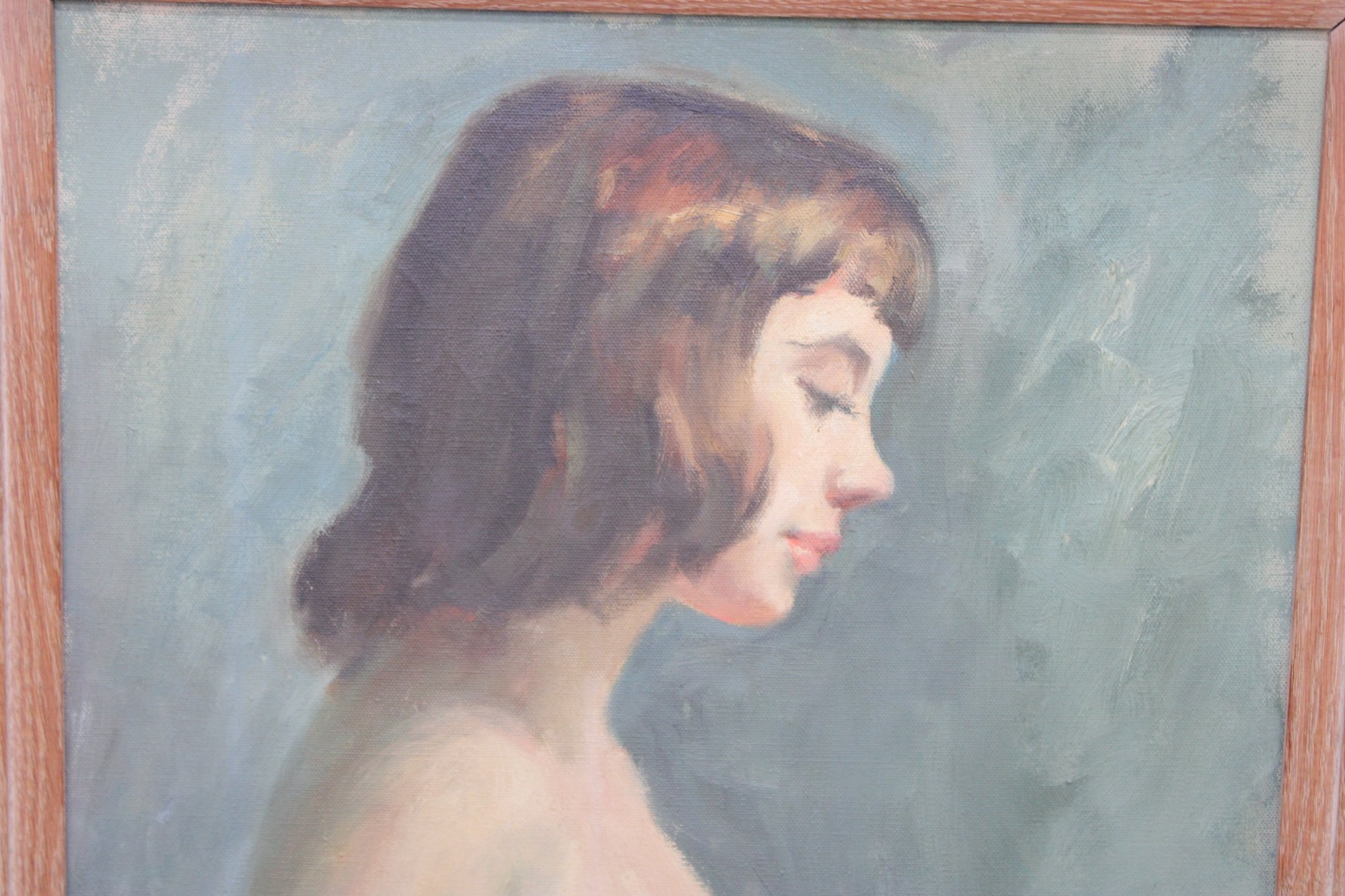 an original signed oil on canvas portrait, depicting a female nude shown in gentle profile against a softly blended blue-green background. The figure is rendered with restrained, expressive brushwork and subtle tonal transitions, emphasizing form, posture, and quiet mood rather than fine detail.