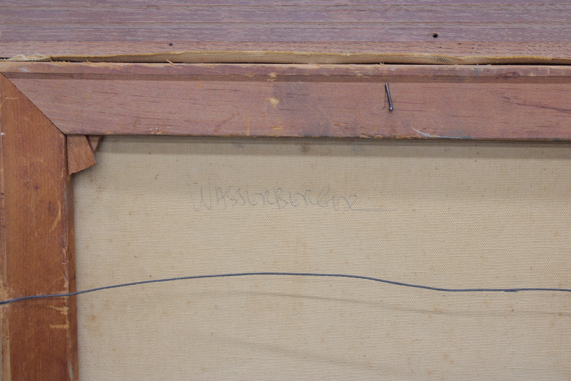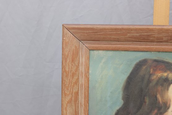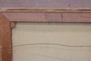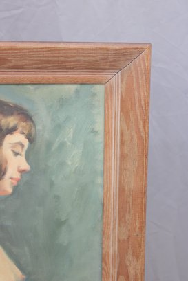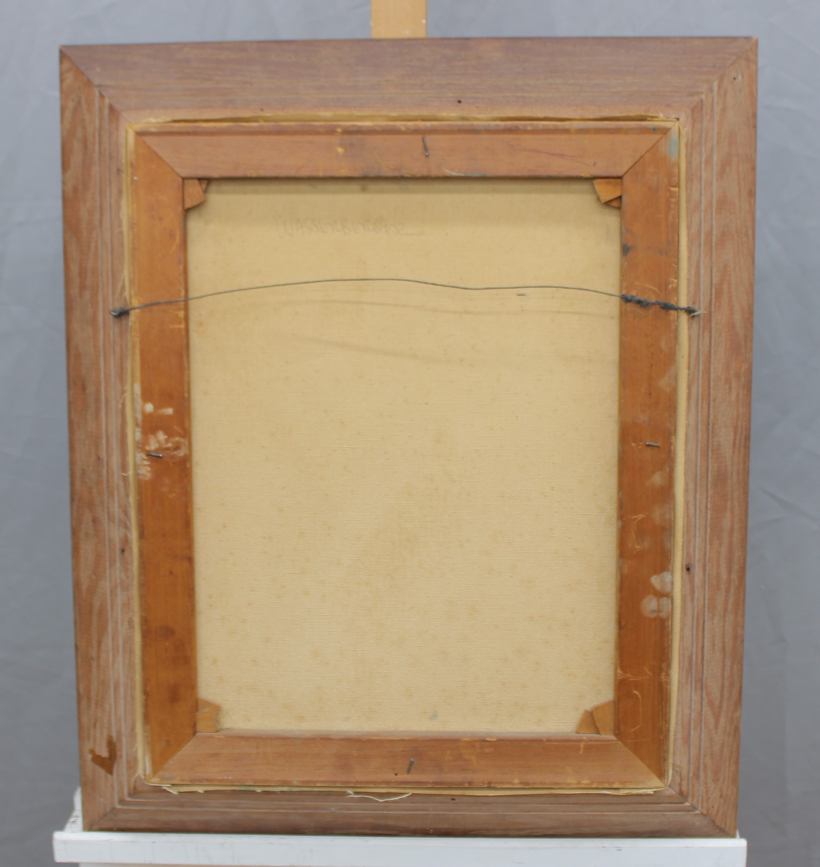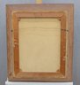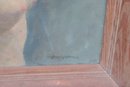 The painting is signed at the lower right (signature visible but not fully legible; attribution unverified) and is housed in a simple natural wood frame that complements the understated, modern character of the artwork.