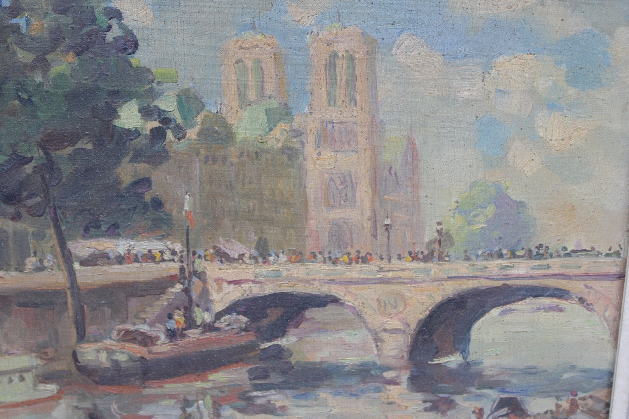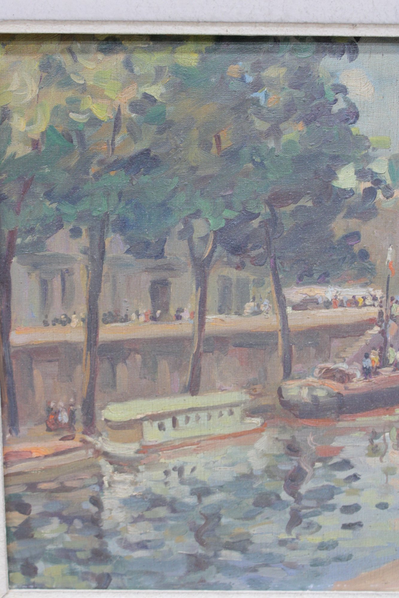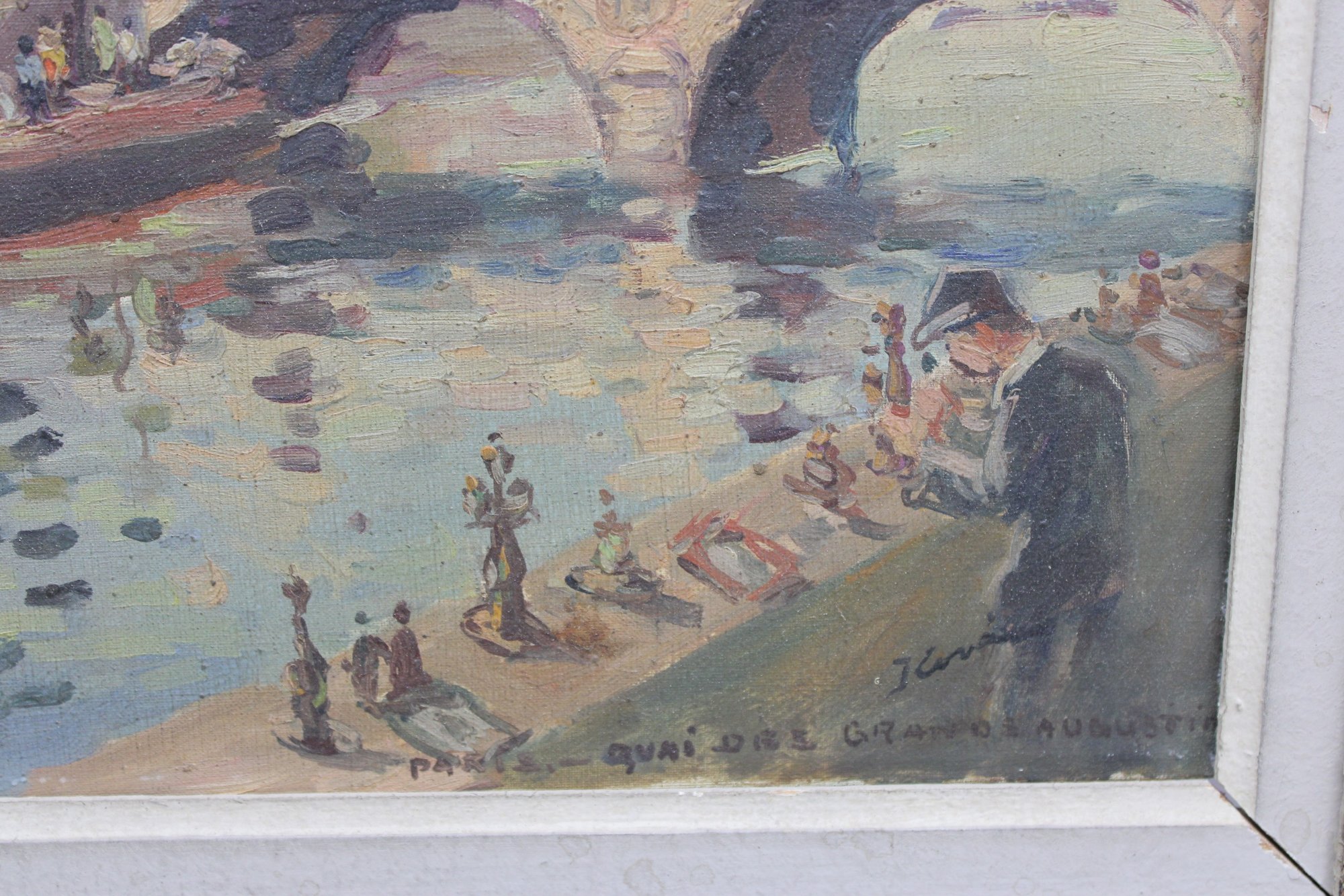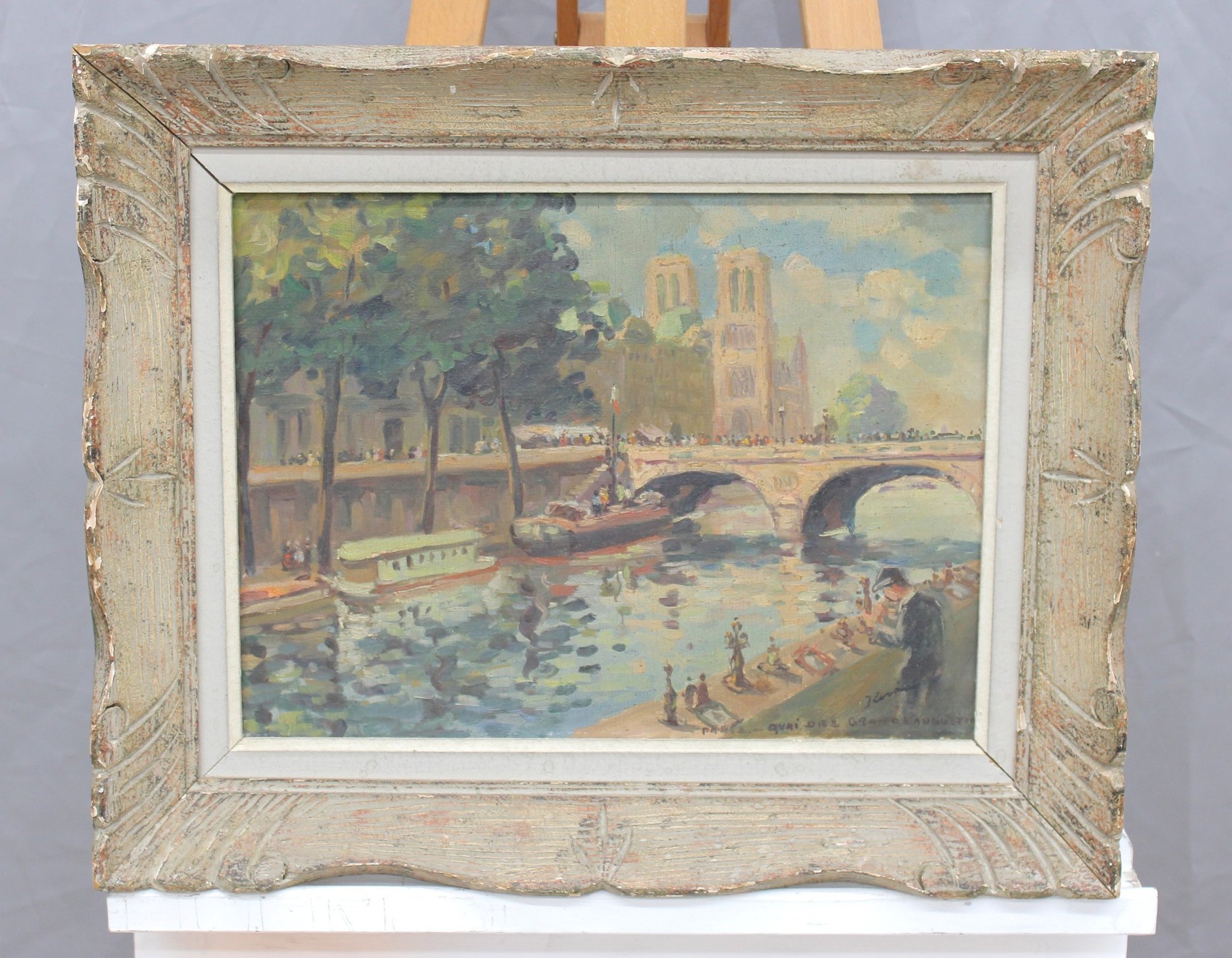 The painting is signed in the lower right, with an inscription reading “quai de …” (partially legible), further suggesting a Paris riverside location. The work is attractively presented in a distressed, carved wood frame with a soft, aged finish that complements the painterly character of the scene.