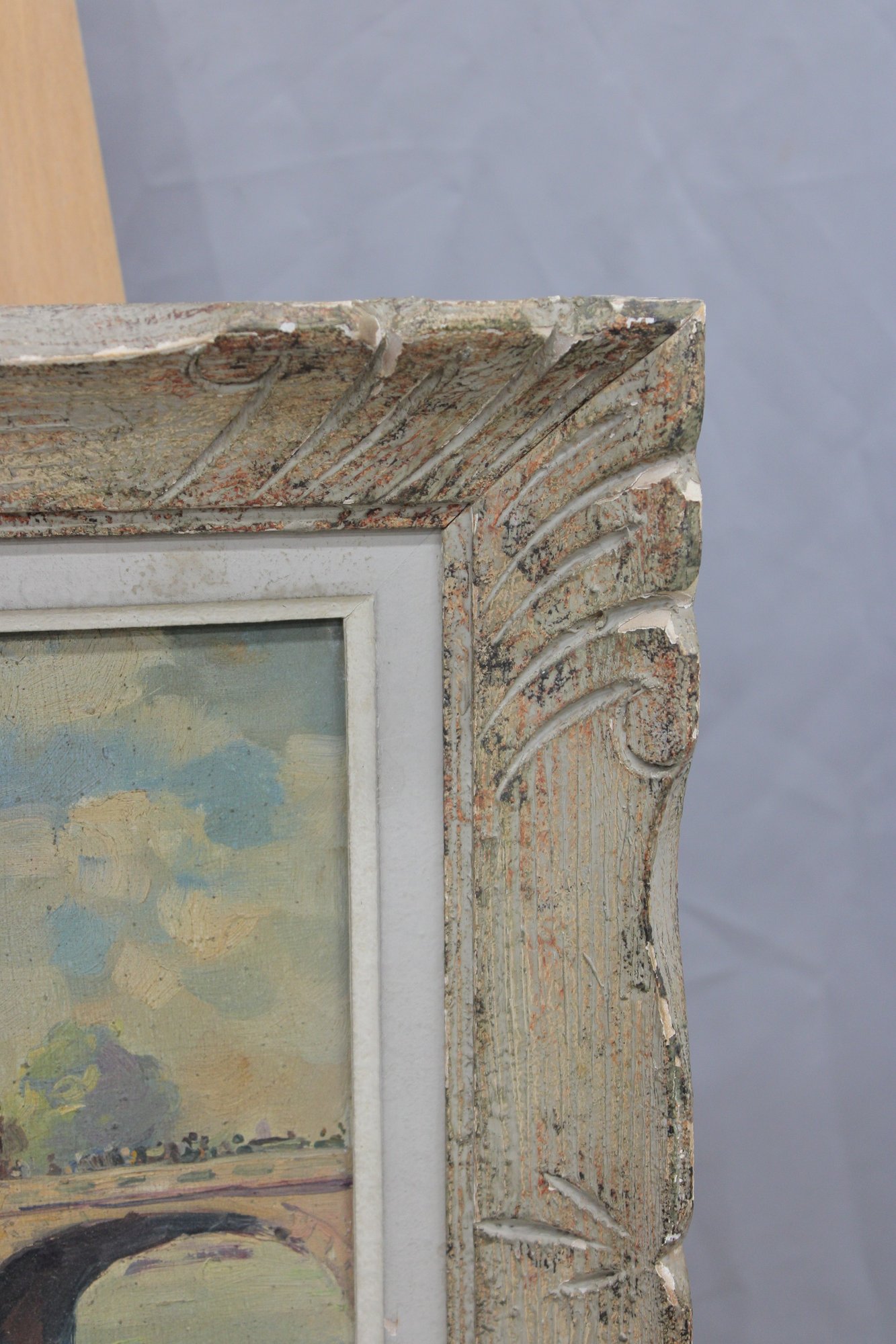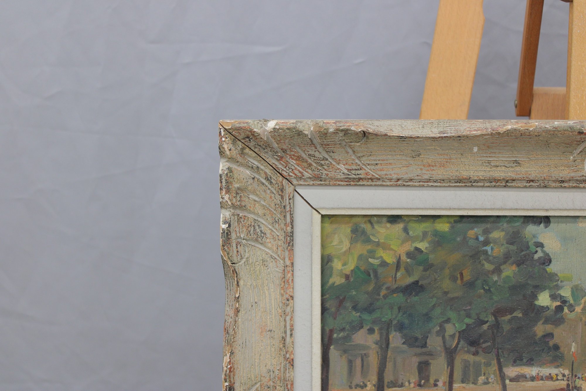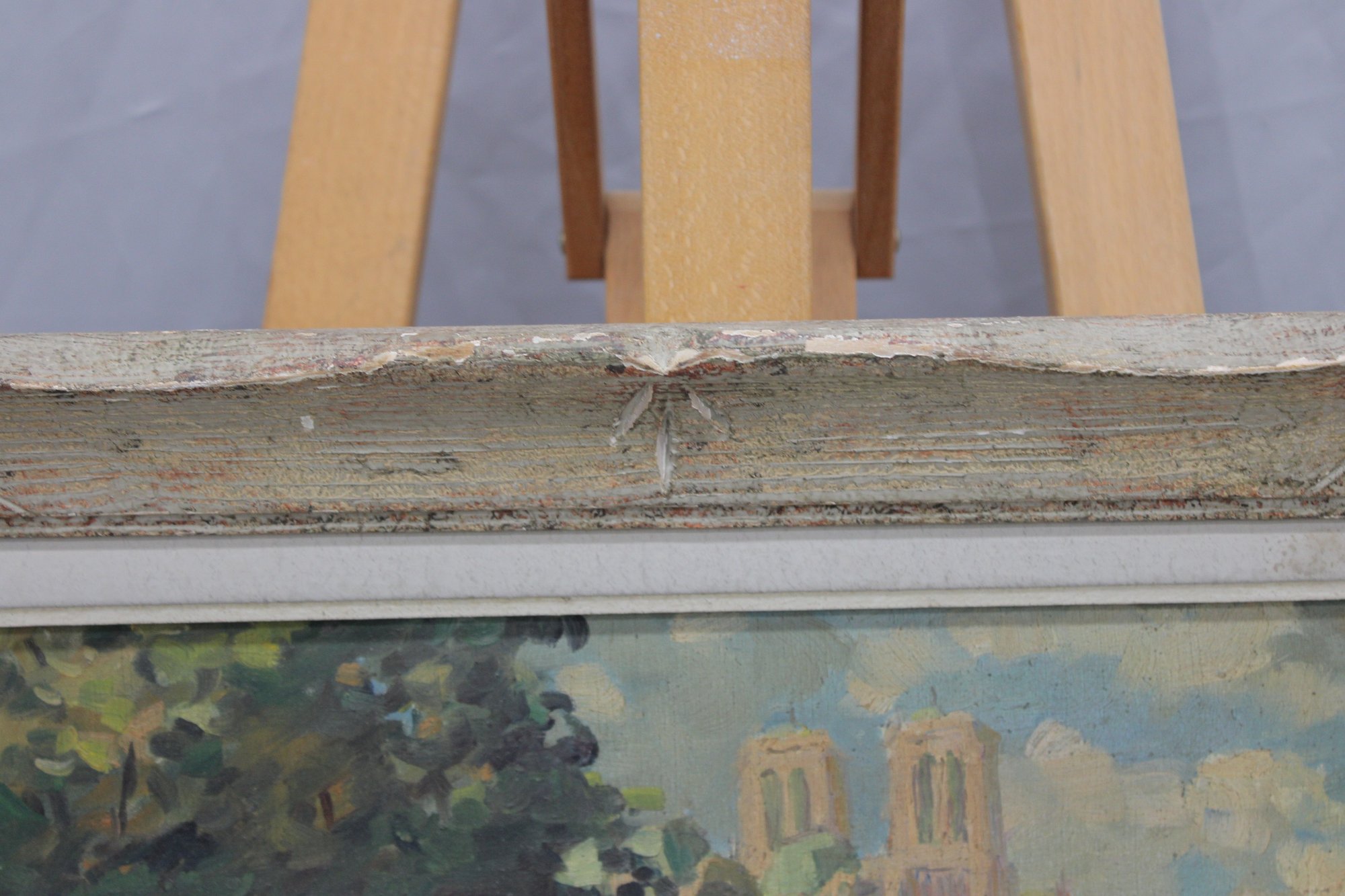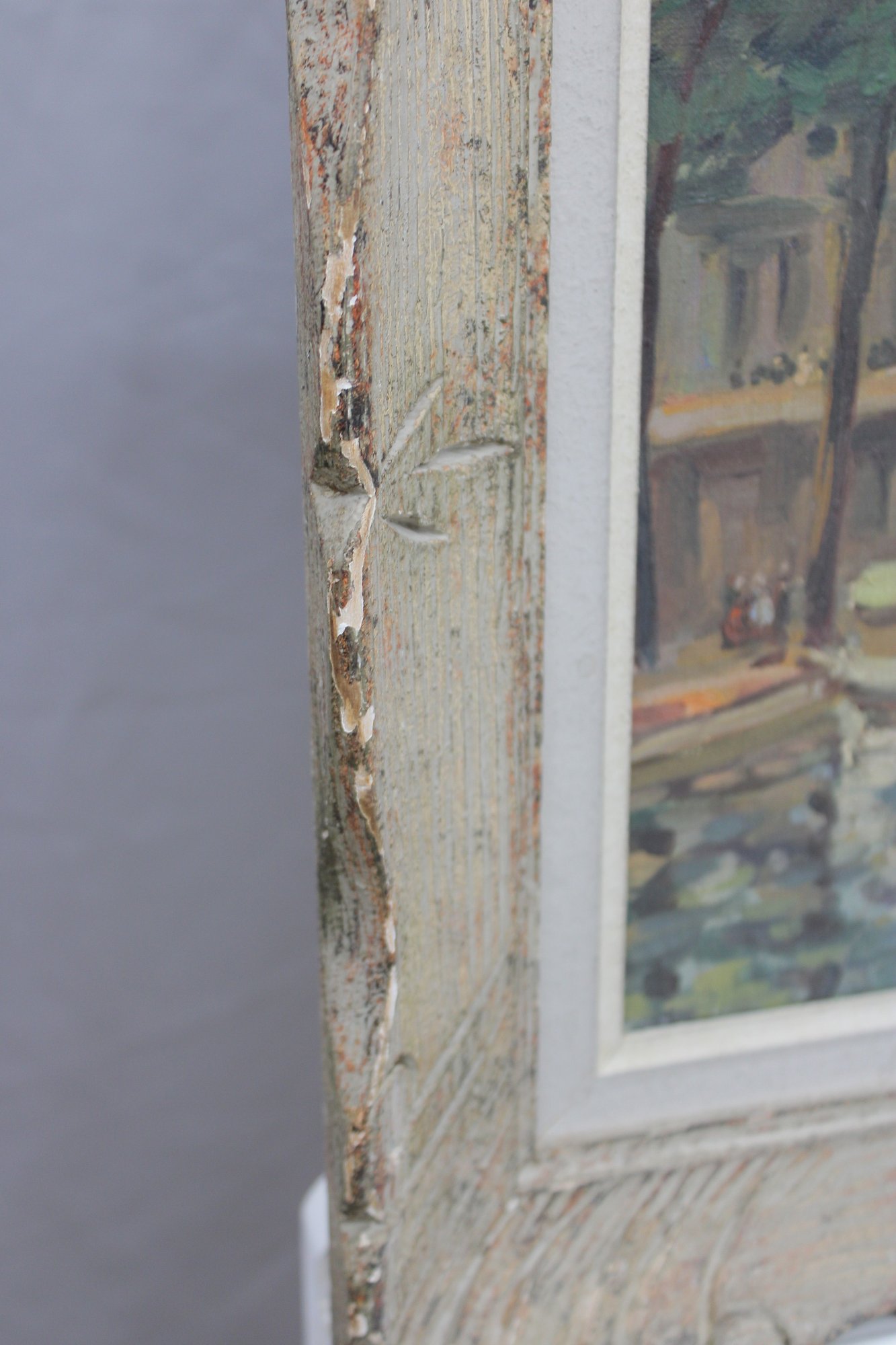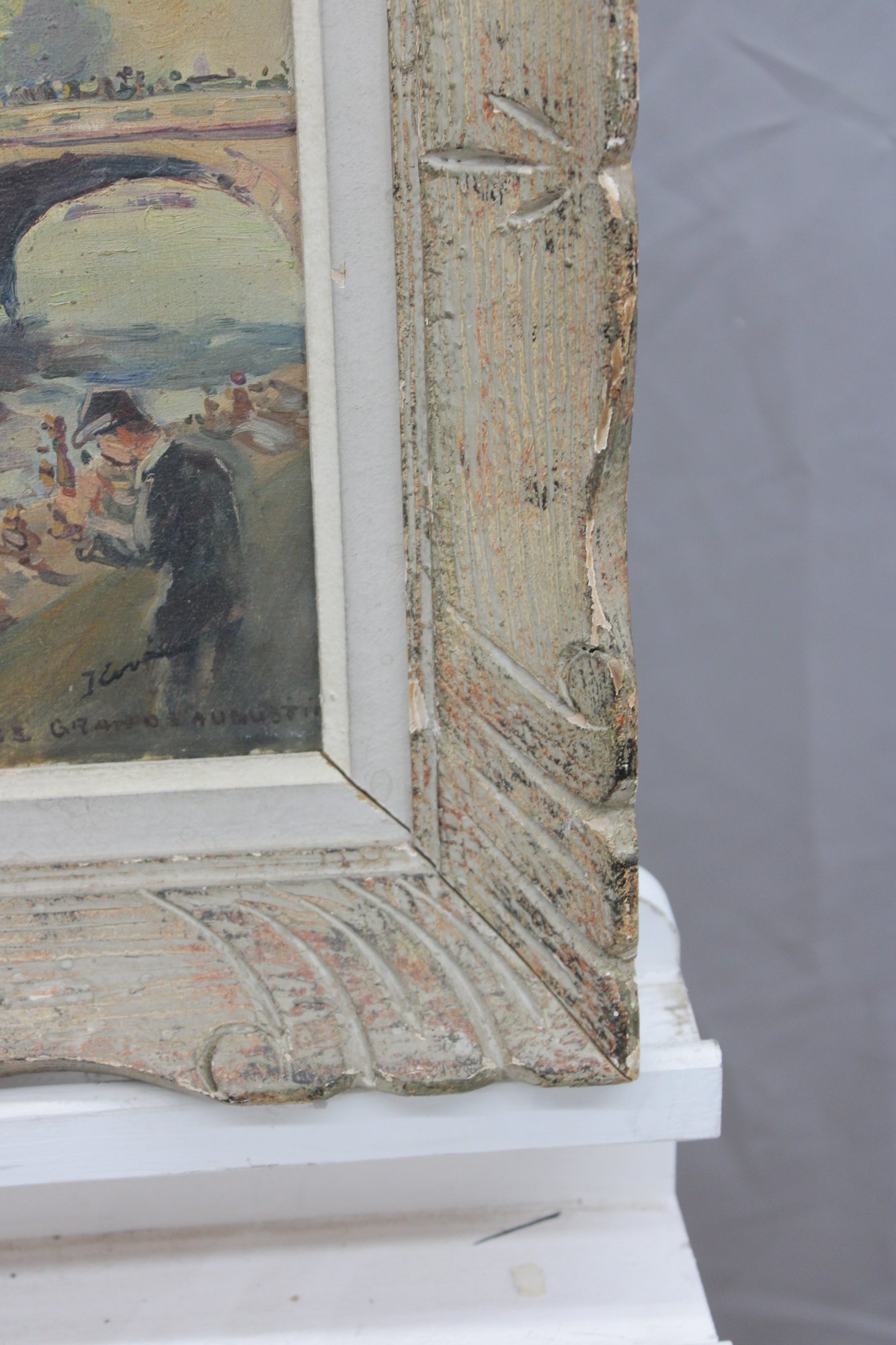 The painting is signed in the lower right, with an inscription reading “quai de …” (partially legible), further suggesting a Paris riverside location. The work is attractively presented in a distressed, carved wood frame with a soft, aged finish that complements the painterly character of the scene.