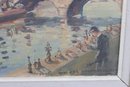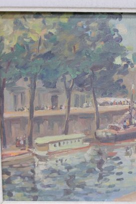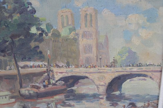 signed oil on canvas painting depicting a lively Parisian river scene with boats along the water, figures strolling the quay, and a prominent cathedral and bridge in the background. The composition is rendered in an Impressionist-influenced style, with loose, expressive brushwork and a bright, atmospheric palette that captures the movement and light of the city.
