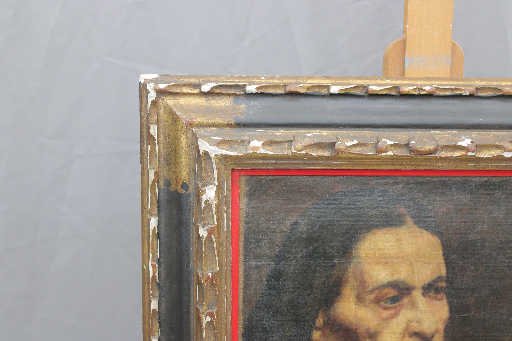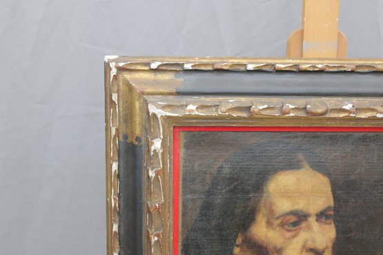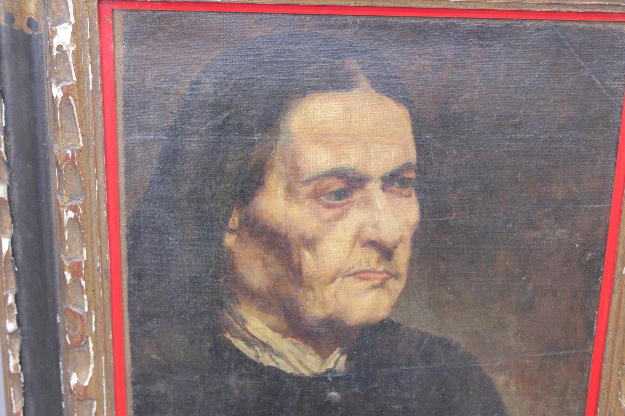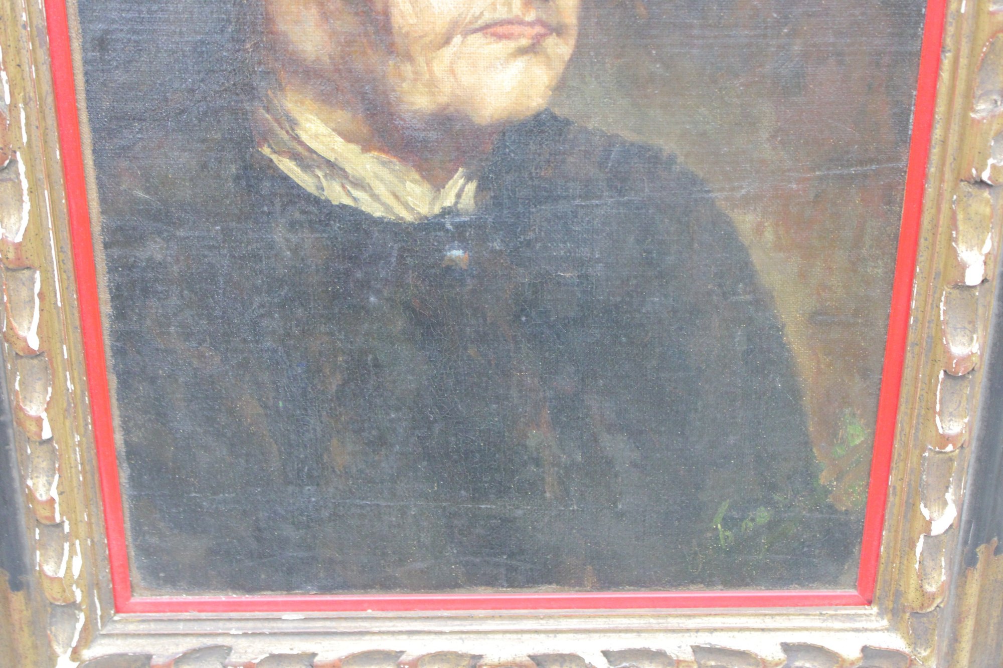 an original signed oil on canvas portrait, depicting an elderly woman shown in profile against a dark, subdued background. The subject is rendered with strong character and expressive detail, emphasizing facial features and contemplative expression in a restrained, classical style.