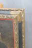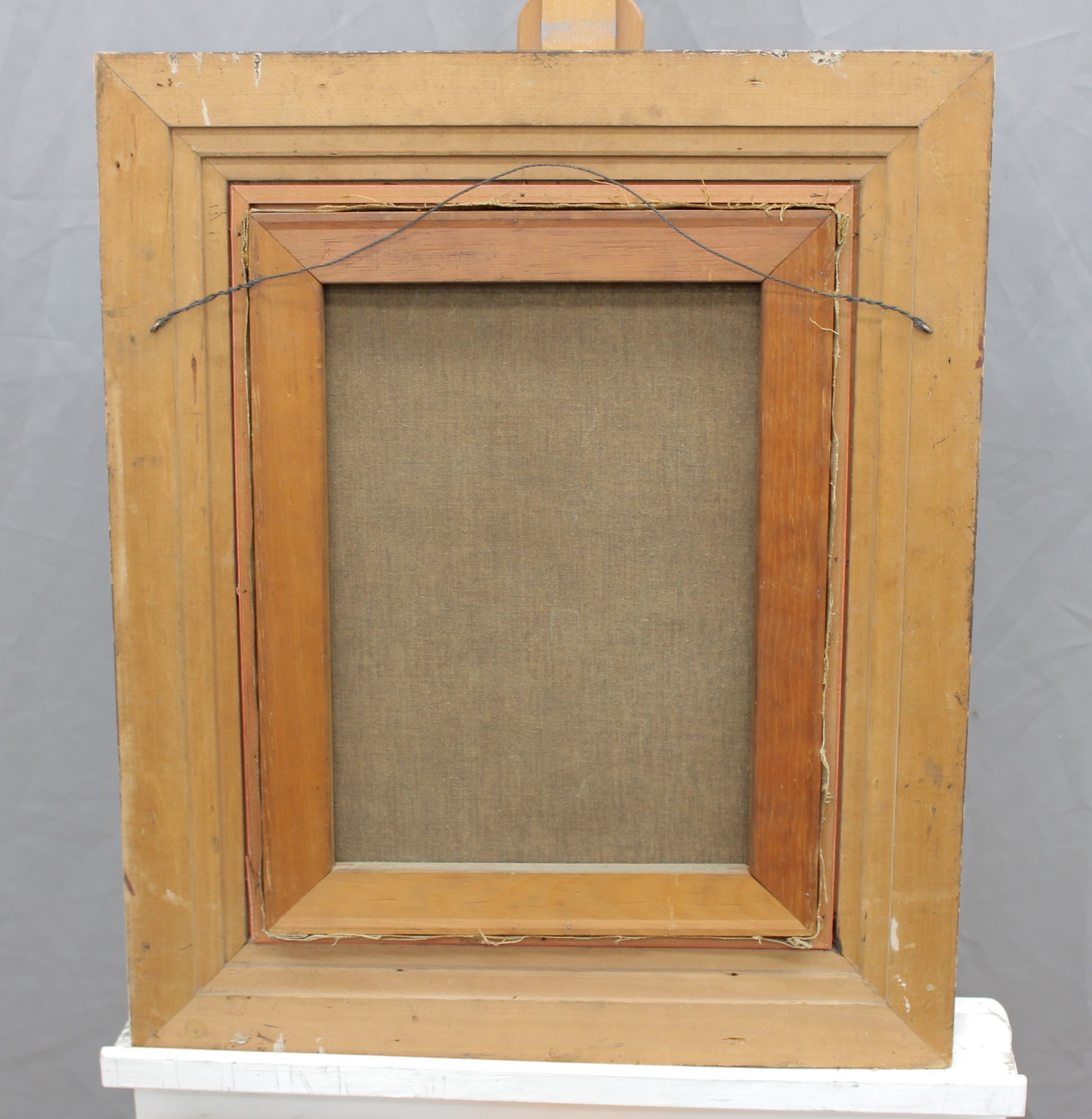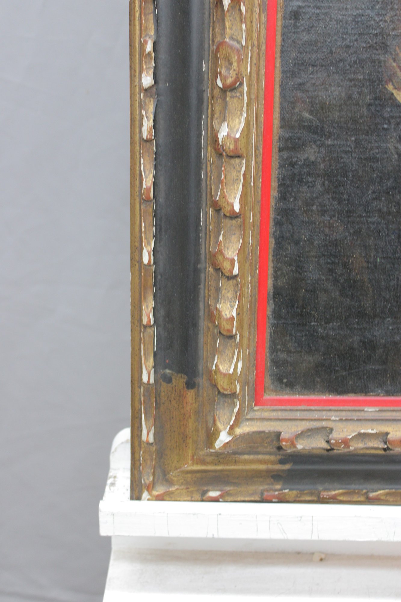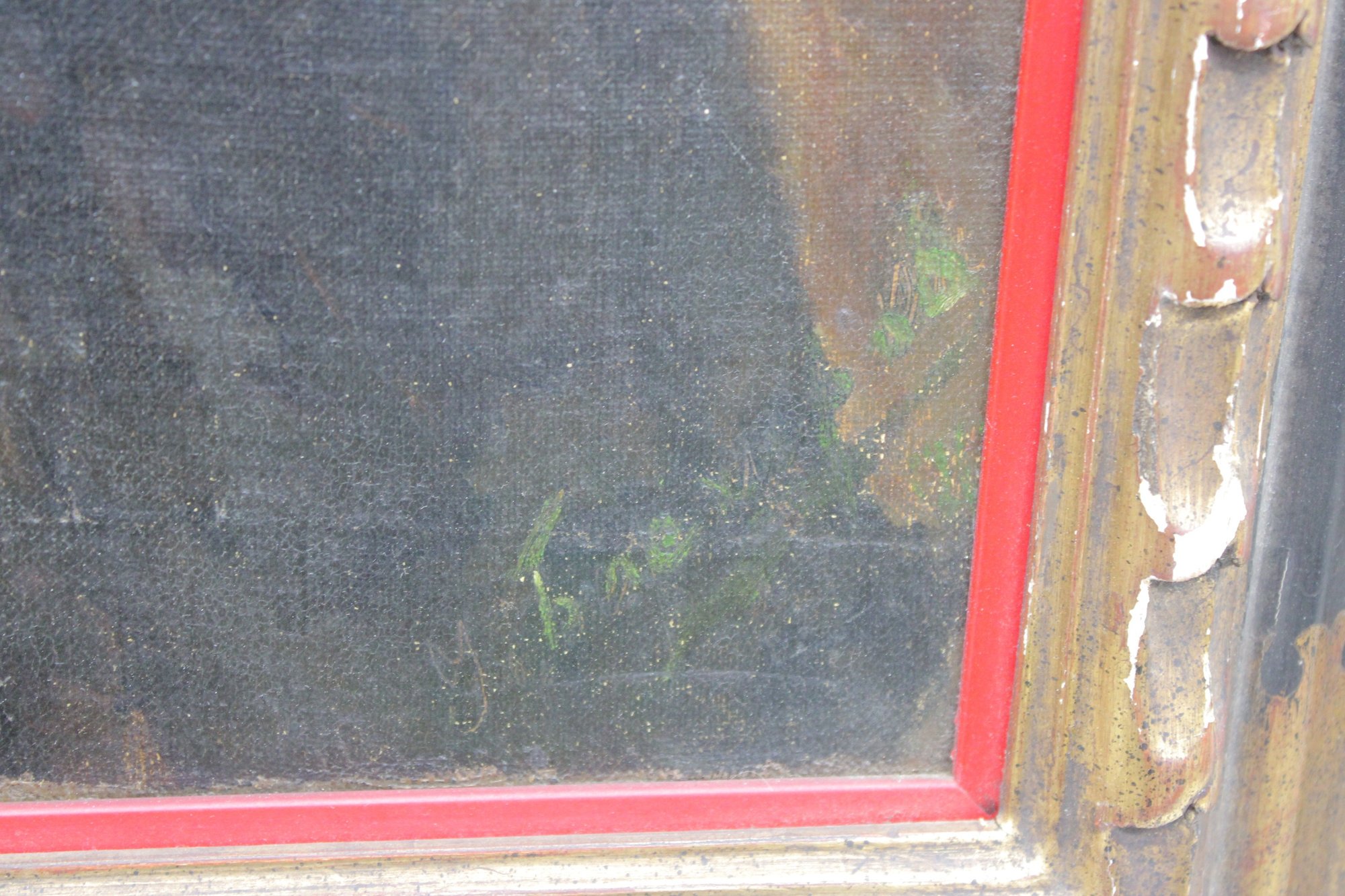 The painting is signed (signature visible but faint and not fully legible; attribution unverified) and is presented in a gilt wood frame with a red-painted liner, adding contrast and visual depth to the composition.