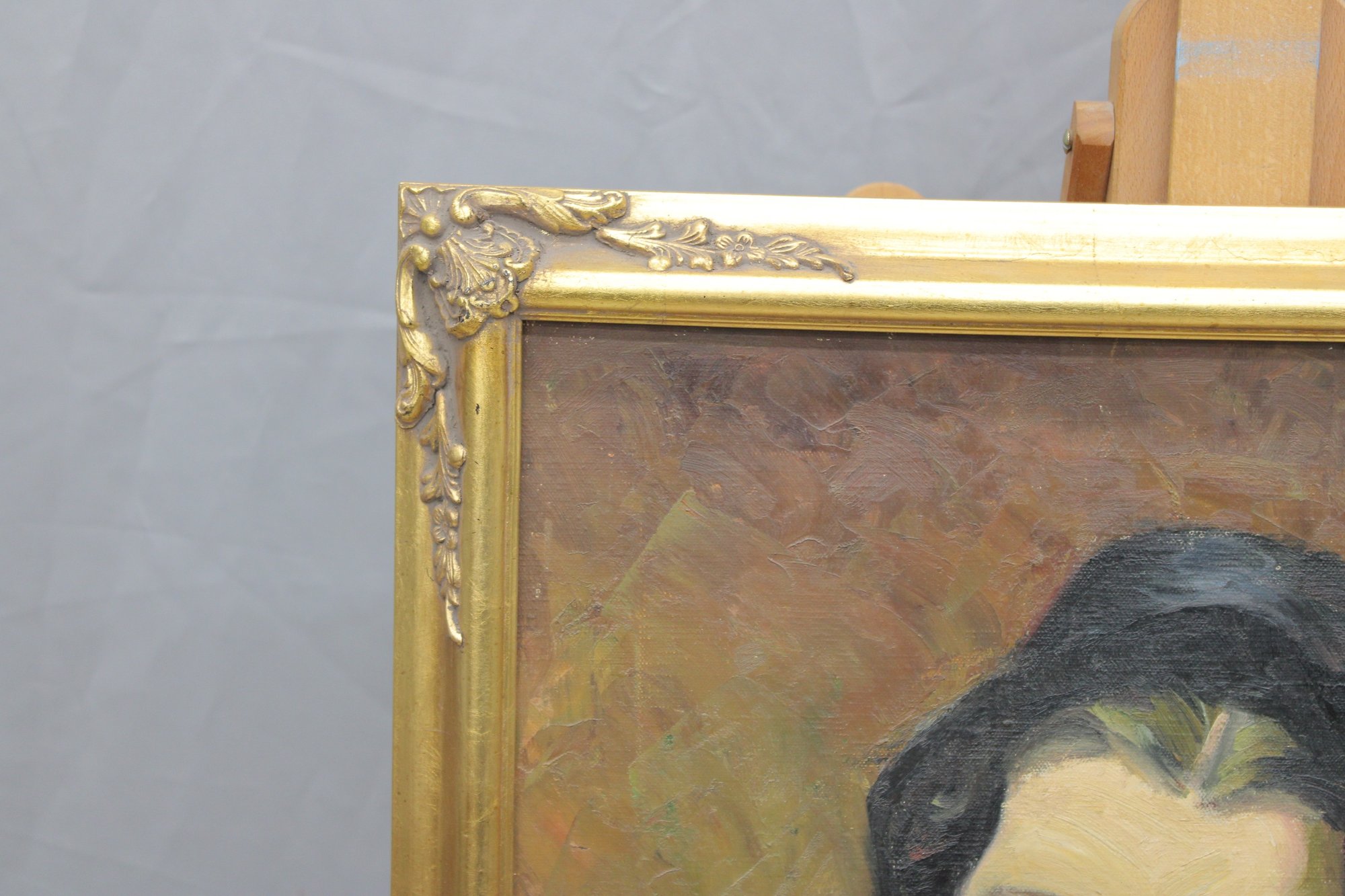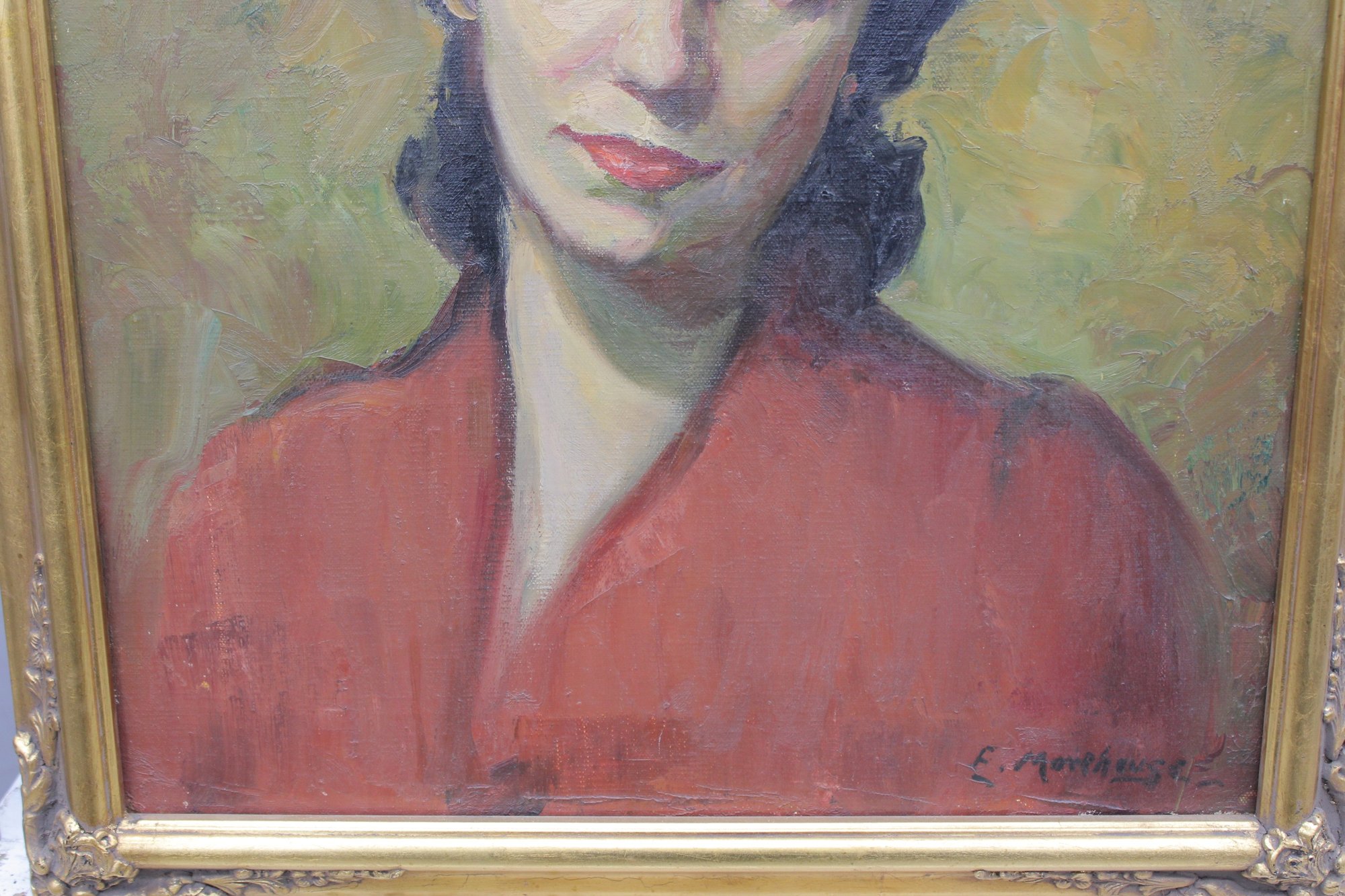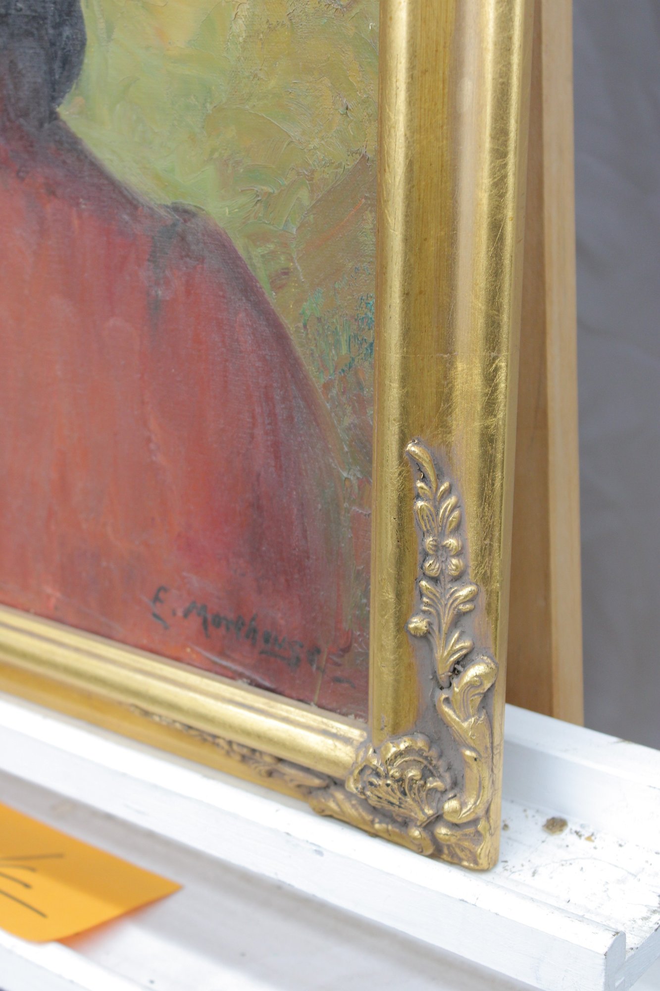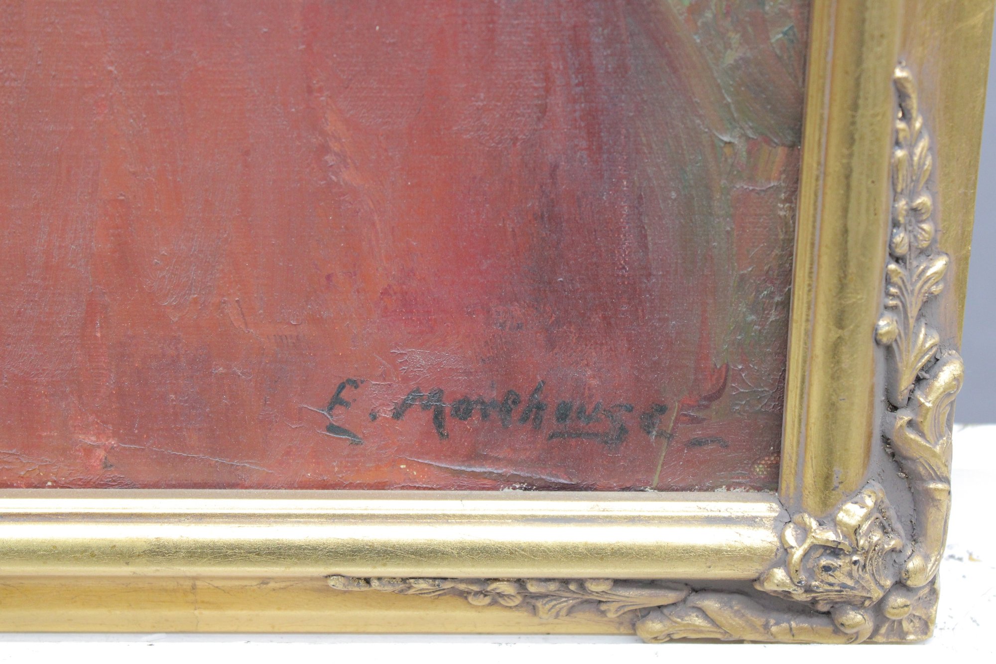 The painting is signed at the lower right (signature appears to read E. Morehouse , partially legible; attribution unverified) and is housed in a gilt wood frame with applied corner decoration that enhances the classic presentation.